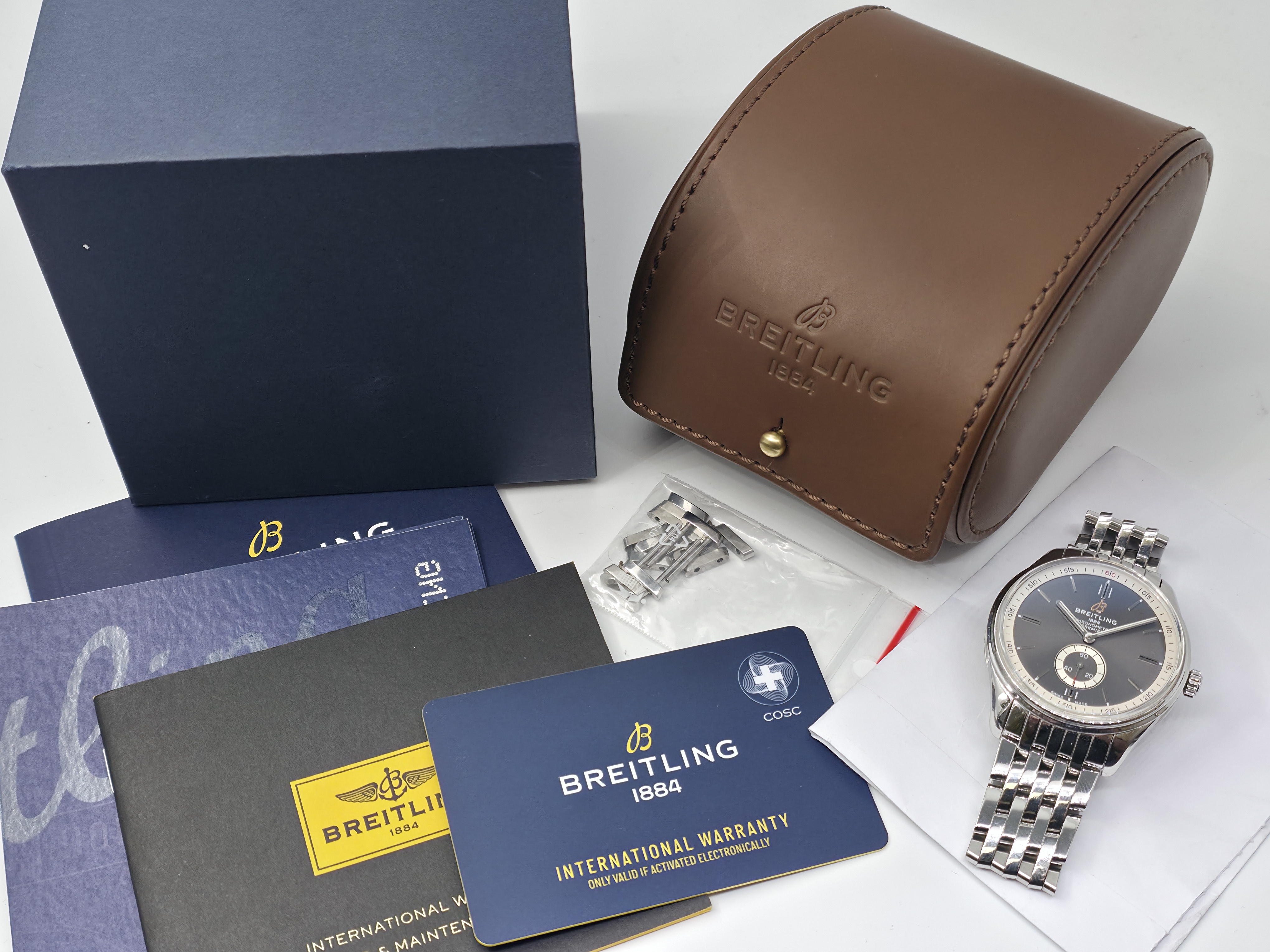 Näyttävä Breitling Premier 40 -kello harmaalla sunburst-taululla. Fullset 07/2022. Kello on huollettu marraskuussa 2025 ja sillä on vuoden huoltotakuu. Tavanomaista käytönjälkeä löytyy. Tämä elegantti ja tyylikäs malli sisältää hienoja yksityiskohtia ja sopii kokonsa puolesta lähes kaikille. Ovh. 5350e