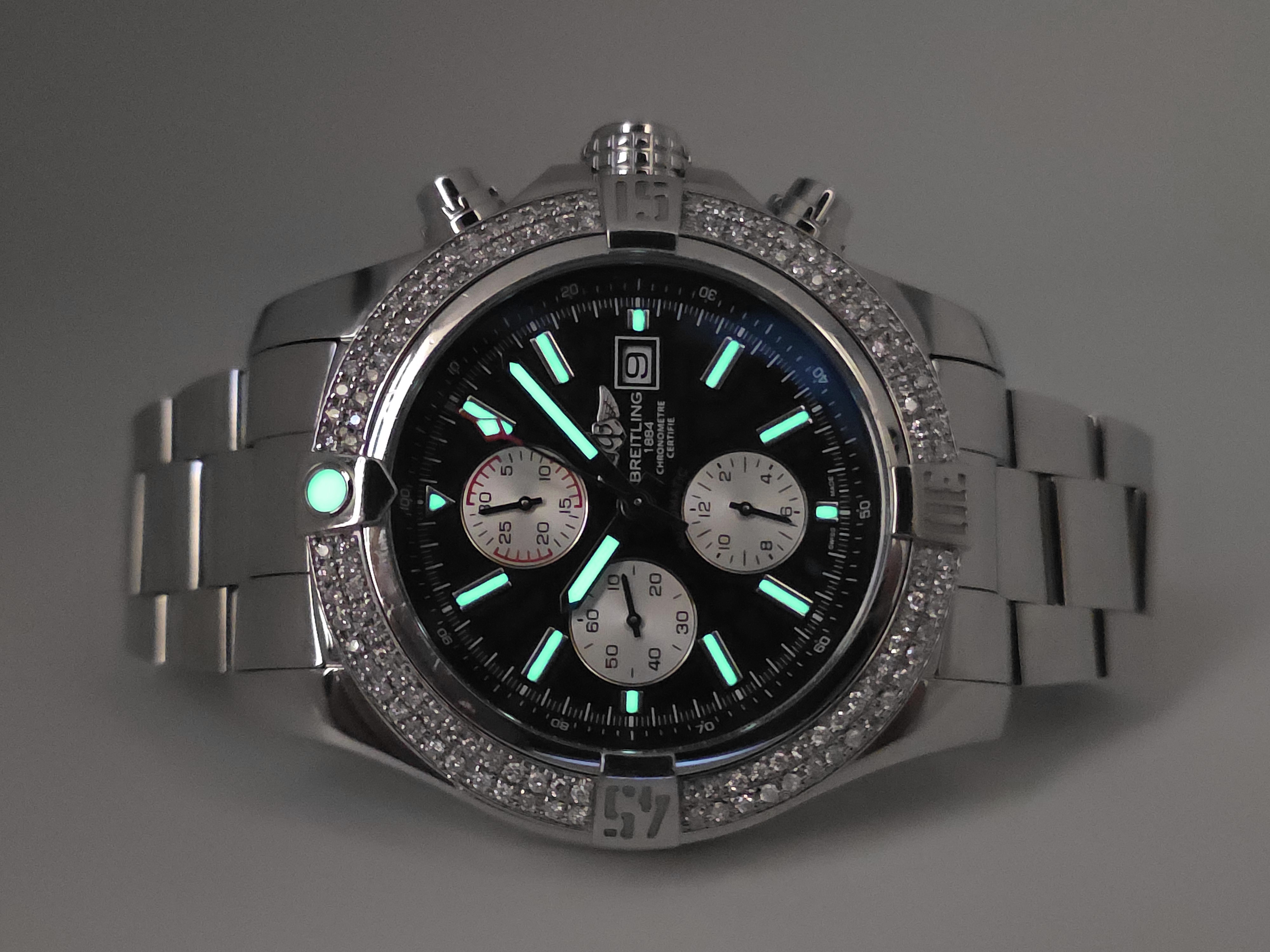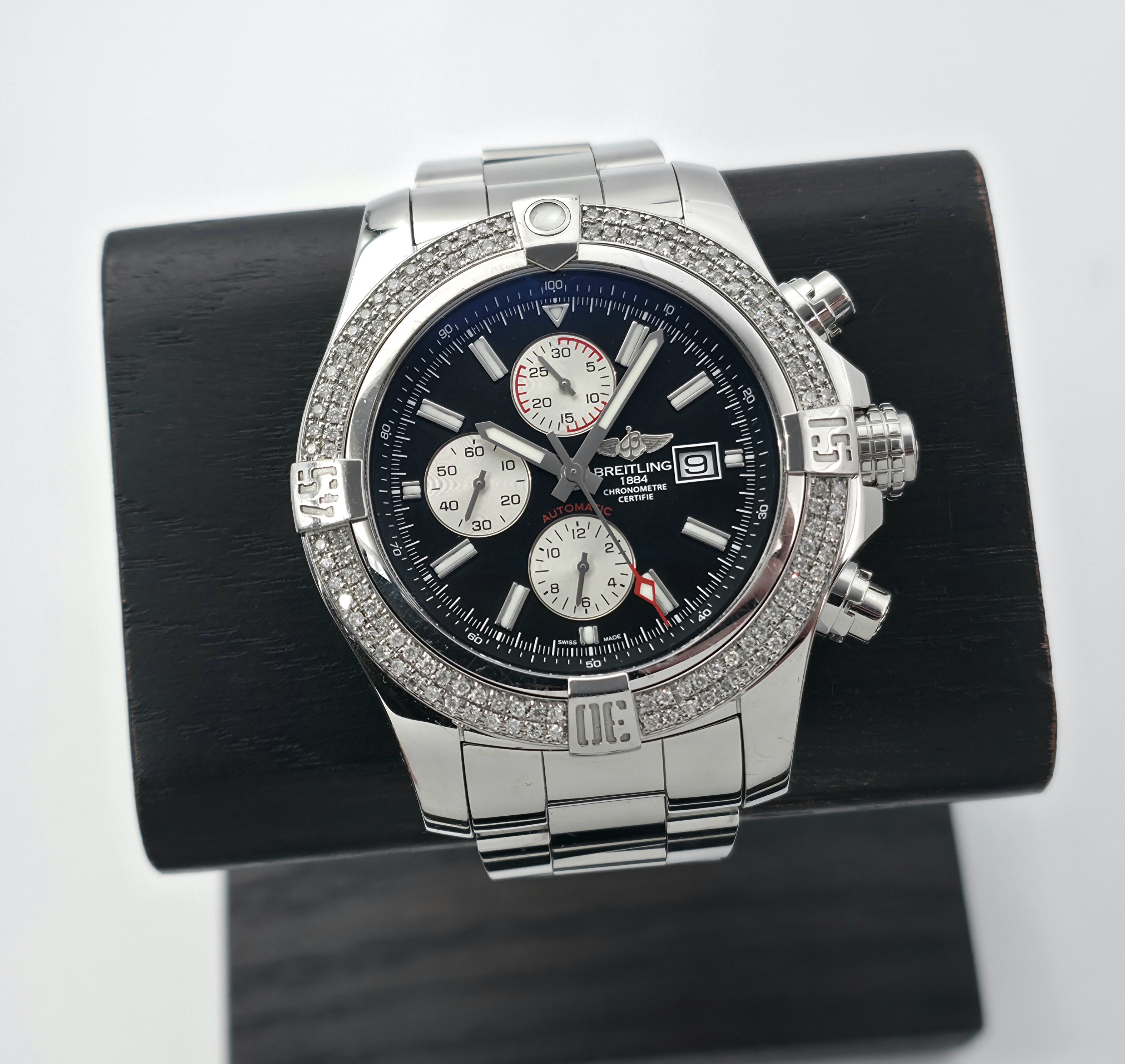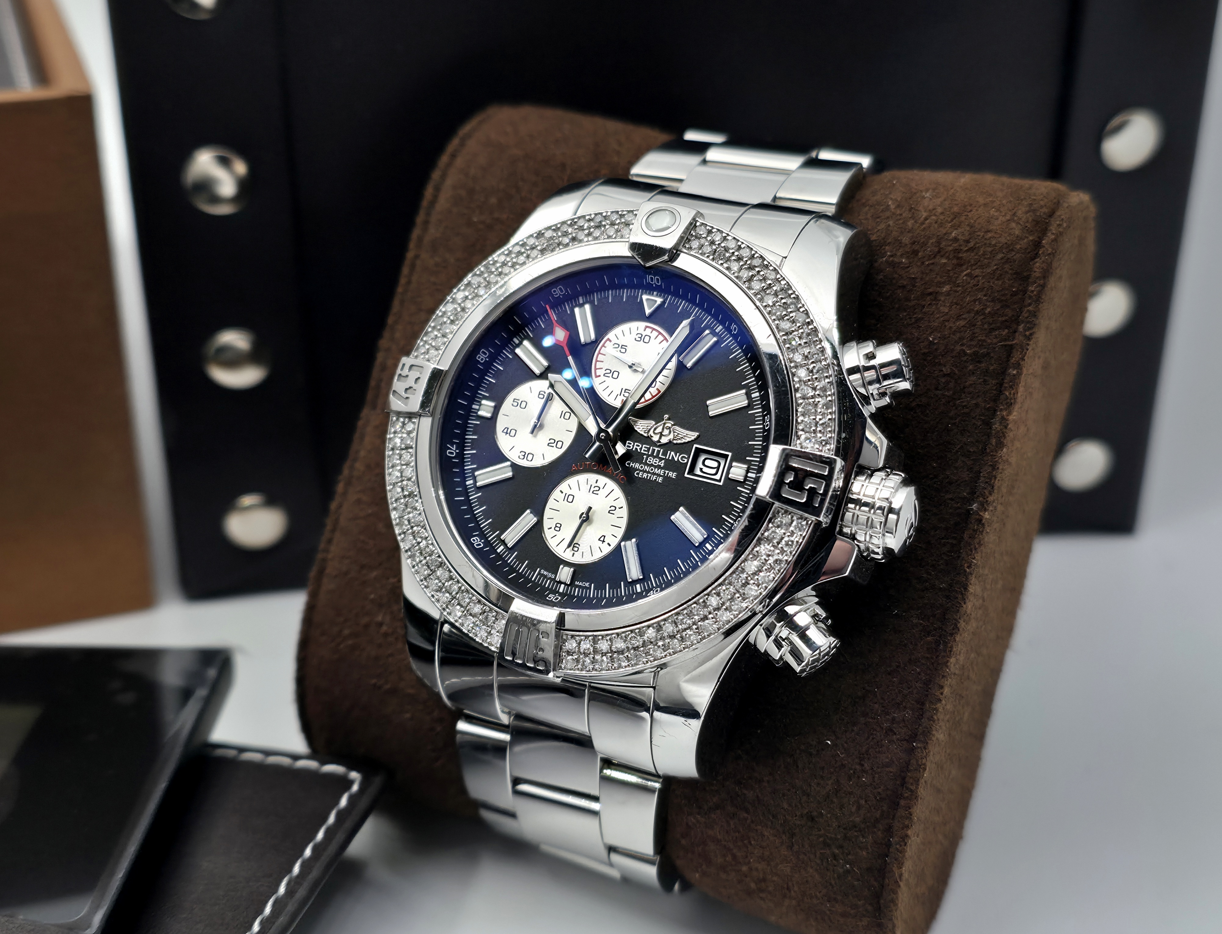 Suurikokoisten kellojen ystäville tarjolla röyhkeän upea Breitling Super Avenger II 48mm. Tässä kellossa yhdistyvät kauttaaltaan kiiltävä pinta ja timanttibezel, luoden hyvin huomiota herättävän kokonaisuuden. Kyseessä on siistikuntoinen Fullset vuodelta 05/2017 valmistajan terä- ja kumirannekkeilla. Kellon huollontarve on tarkistettu sepäm toimesta 05/2025, ja koneisto on todettu moitteettomaksi (dokumentaatio mukaan). Tämä Avenger on todellinen katseenvangitsija!