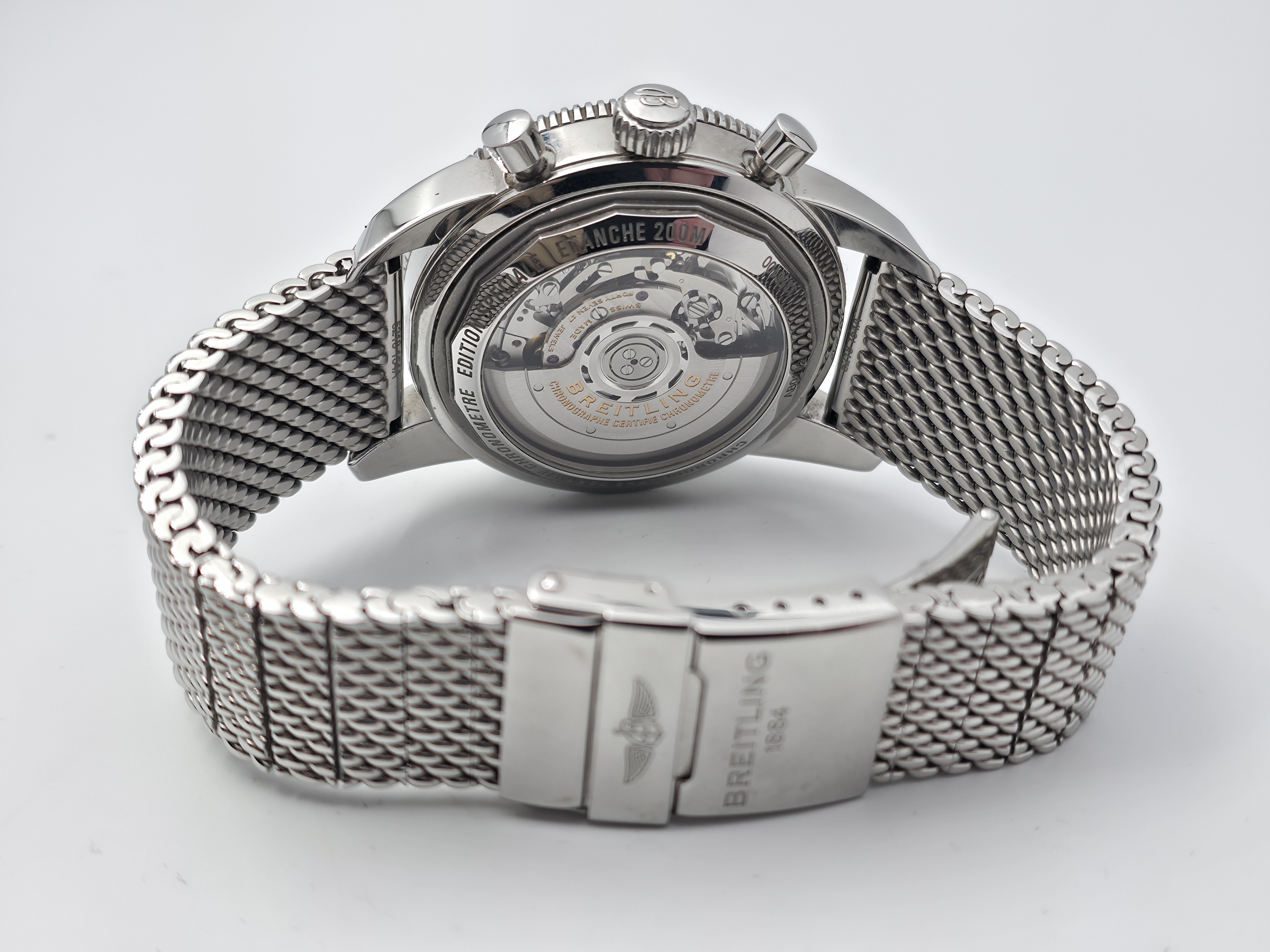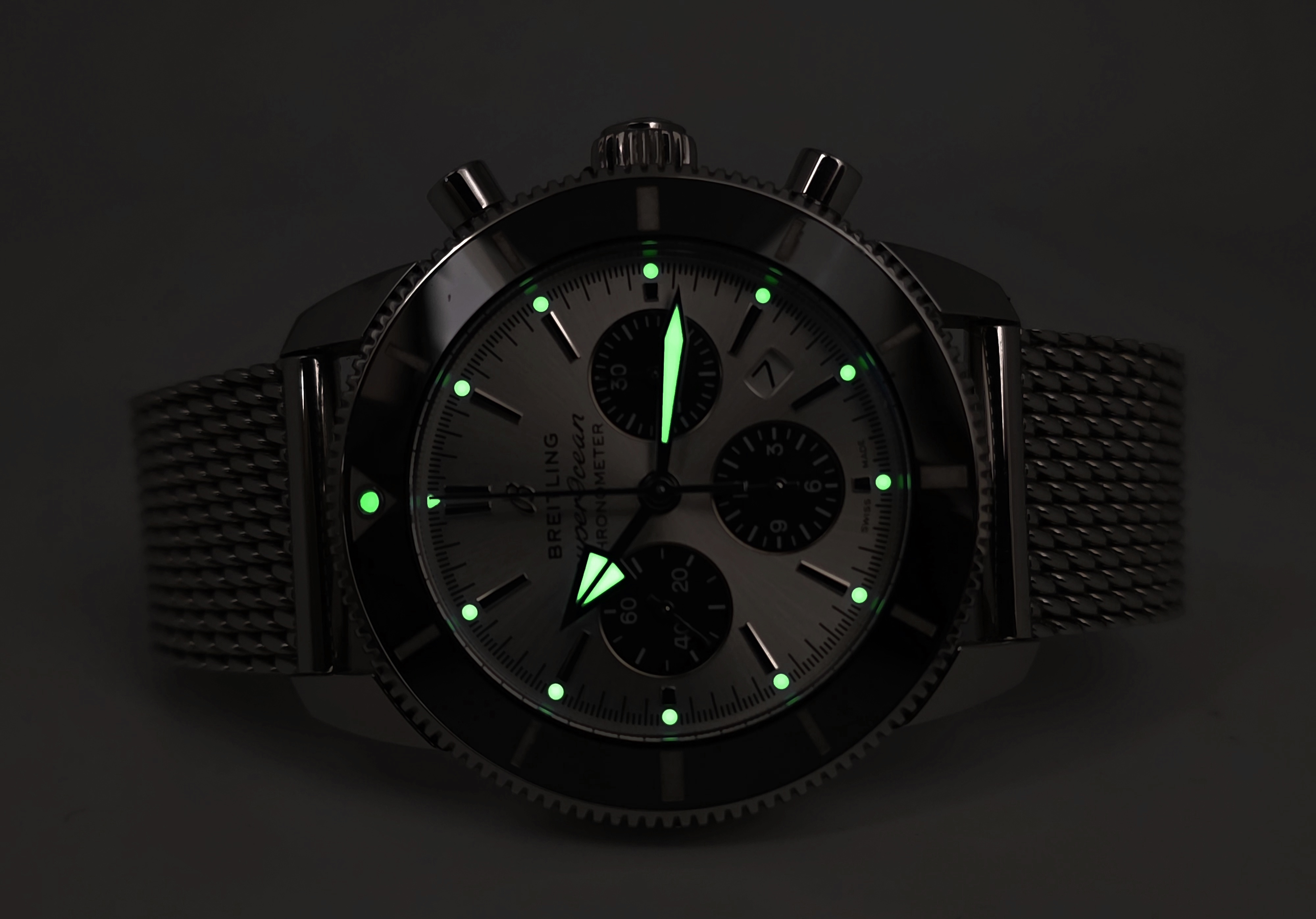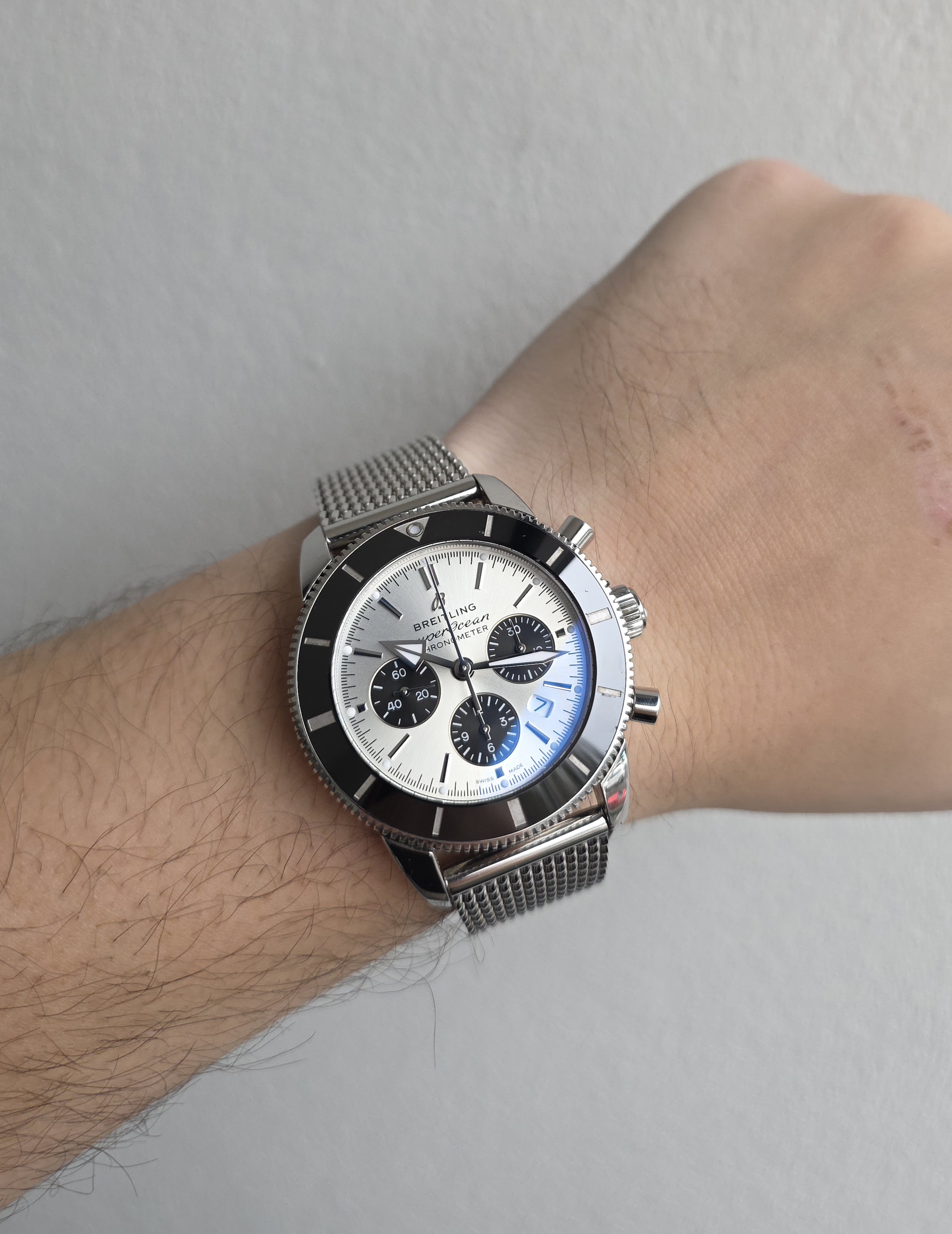 Näyttävä SuperOcean Heritage B01 Chrono 44mm on varustettu hopeisella sunburst-taululla ja alkuperäisellä mesh-rannekkeella. Kunto on erinomainen. Fullset 10/2023. Kellolle on aktivoitu laajennettu 8 vuoden takuu, joka on voimassa 10/2031 saakka. Ovh. 9050e