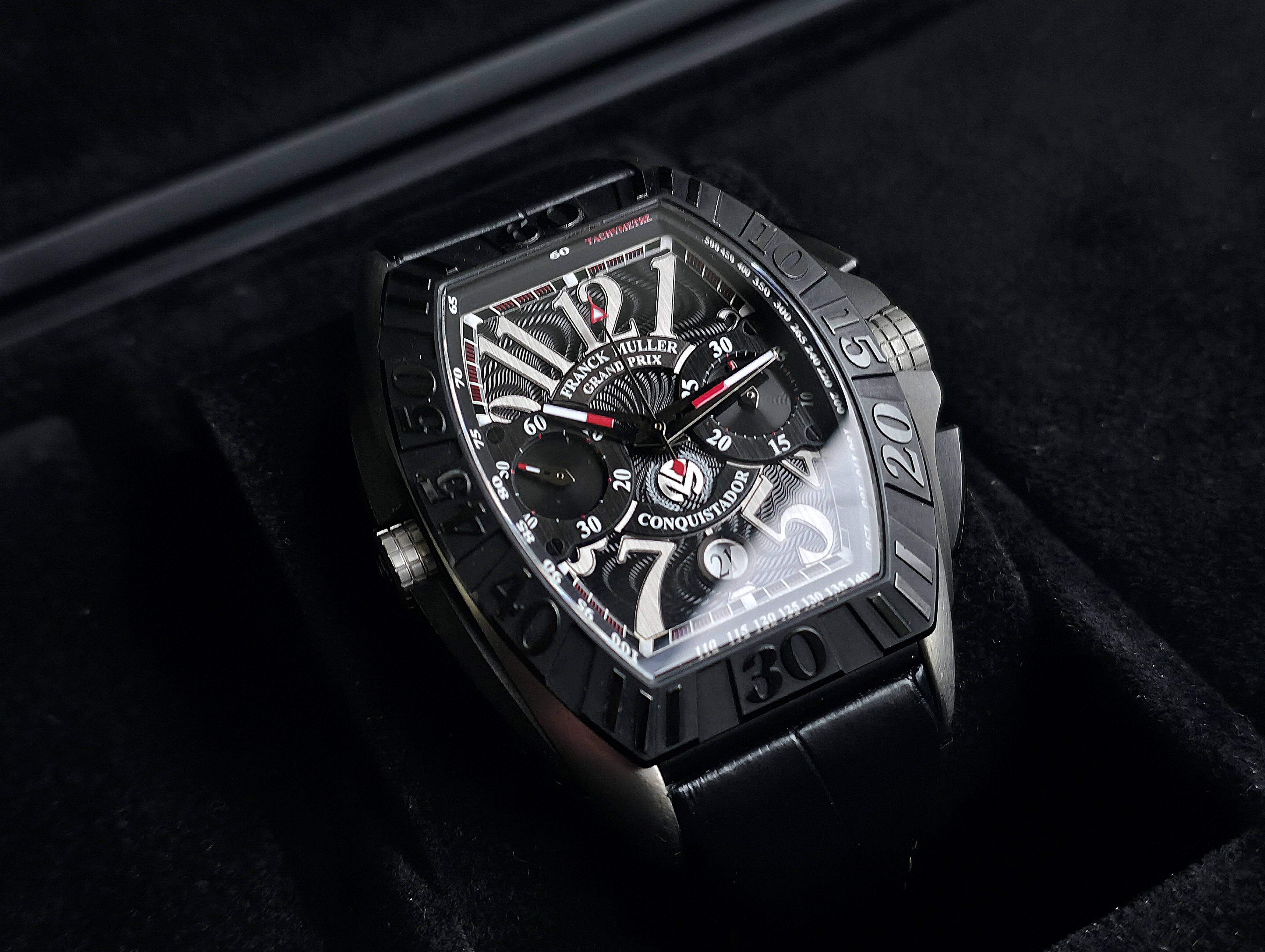 Näyttävä ja erottuva Franck Muller Conquistador Grand Prix Chronograph titanium-kuorella. Mallin tunnistaa sen urheilullisesta tonneau-muodosta ja rohkeasta designista. Kevyt mutta jämäkkä titaanikuori tekee kellosta miellyttävän käyttää. Grand Prix -sarja edustaa Franck Mullerin sporttisempaa puolta tinkimättä brändin ikonisesta tyylistä. Fullset 11/2011. Hyvin siistissä kunnossa ja huollettu 07/2025, joten huolettomia käyttövuosia edessä. Tästä näyttävä ja harvemmin tarjolla oleva Franck Muller. Listahinta tälle uutena ollut n. 23 600e