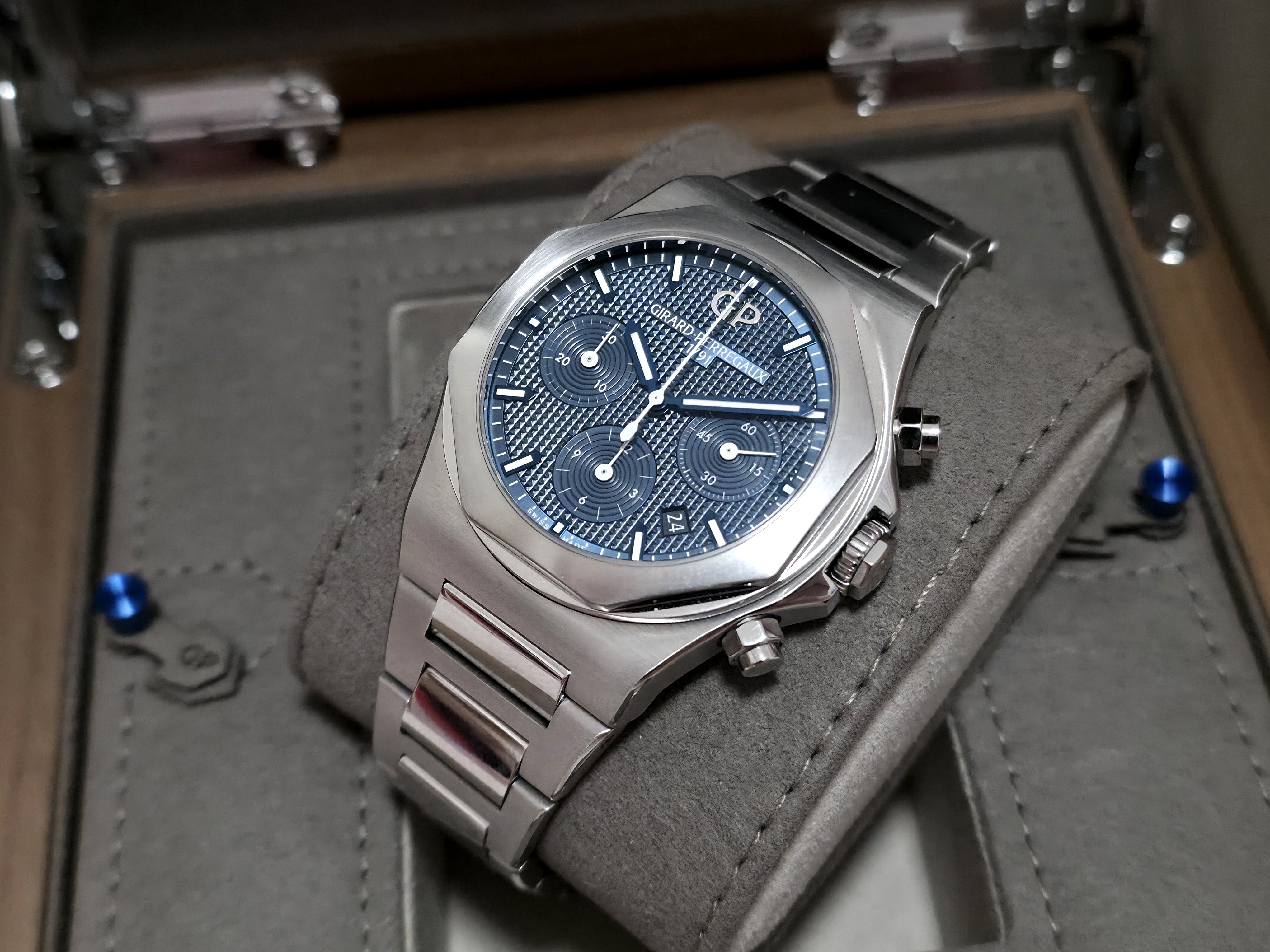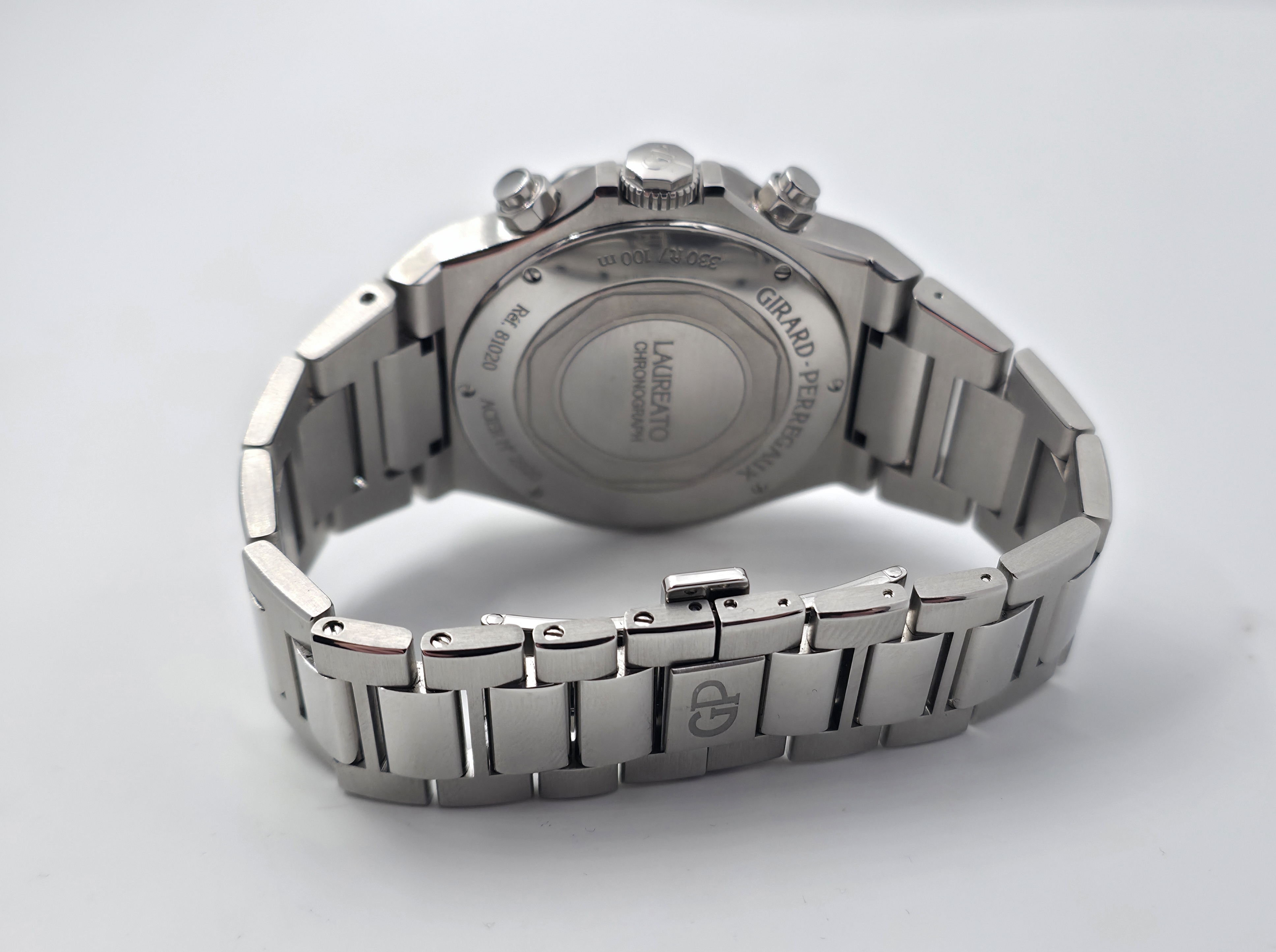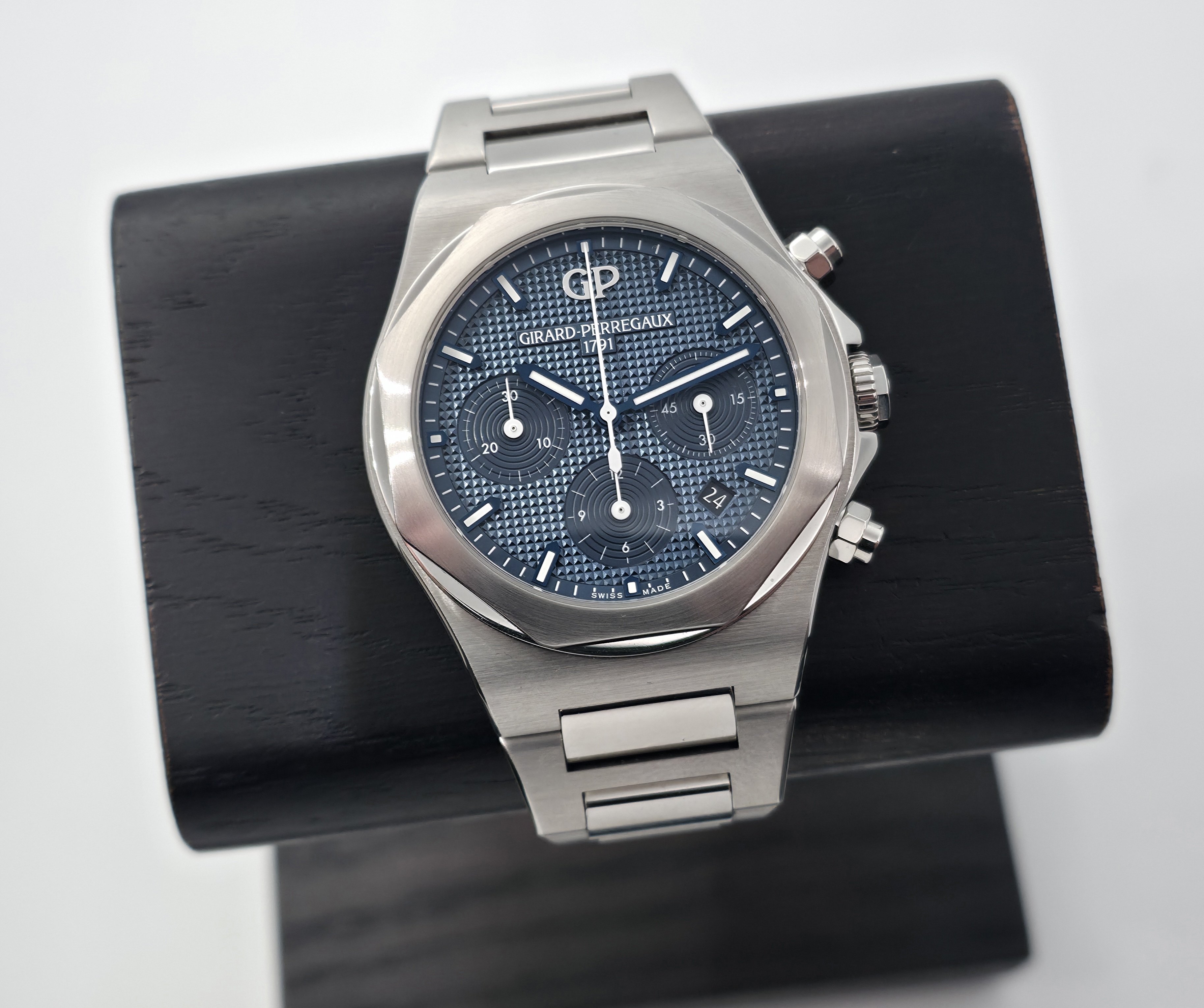 Tyylikäs Girard-Perregaux Laureato Chronograph – sporttiluksusta parhaimmillaan. Ikoninen kahdeksankulmainen bezel, integroitu ranneke ja syvänsininen “vohveli” -taulu tekevät tästä näyttävän mutta samalla ajattoman kokonaisuuden. Kello siistissä kunnossa oleva Full set. Paperit päivätty 10/2022, 5 vuoden tehdastakuu. Ovh. 19 600e Tästä erittäin tyylikäs ja monikäyttöinen Laureato Chronograph suoraan ranteeseen!