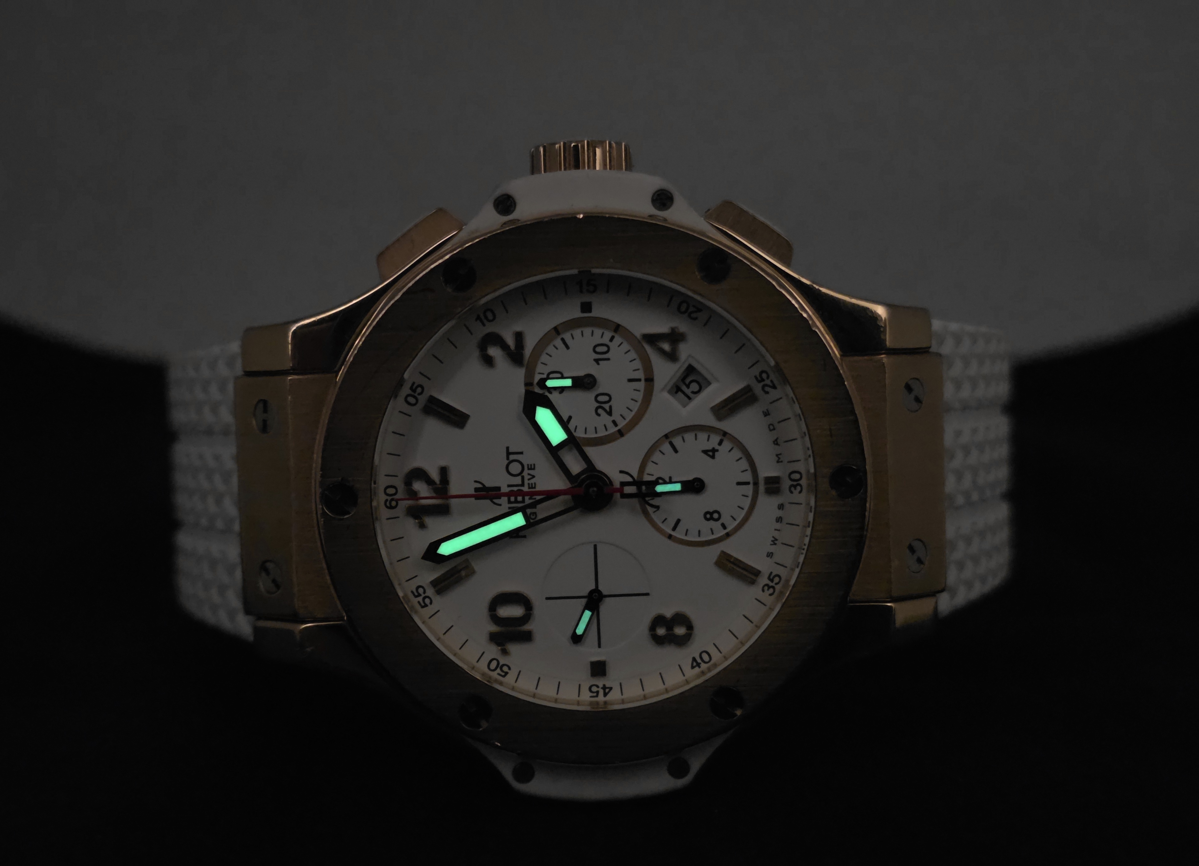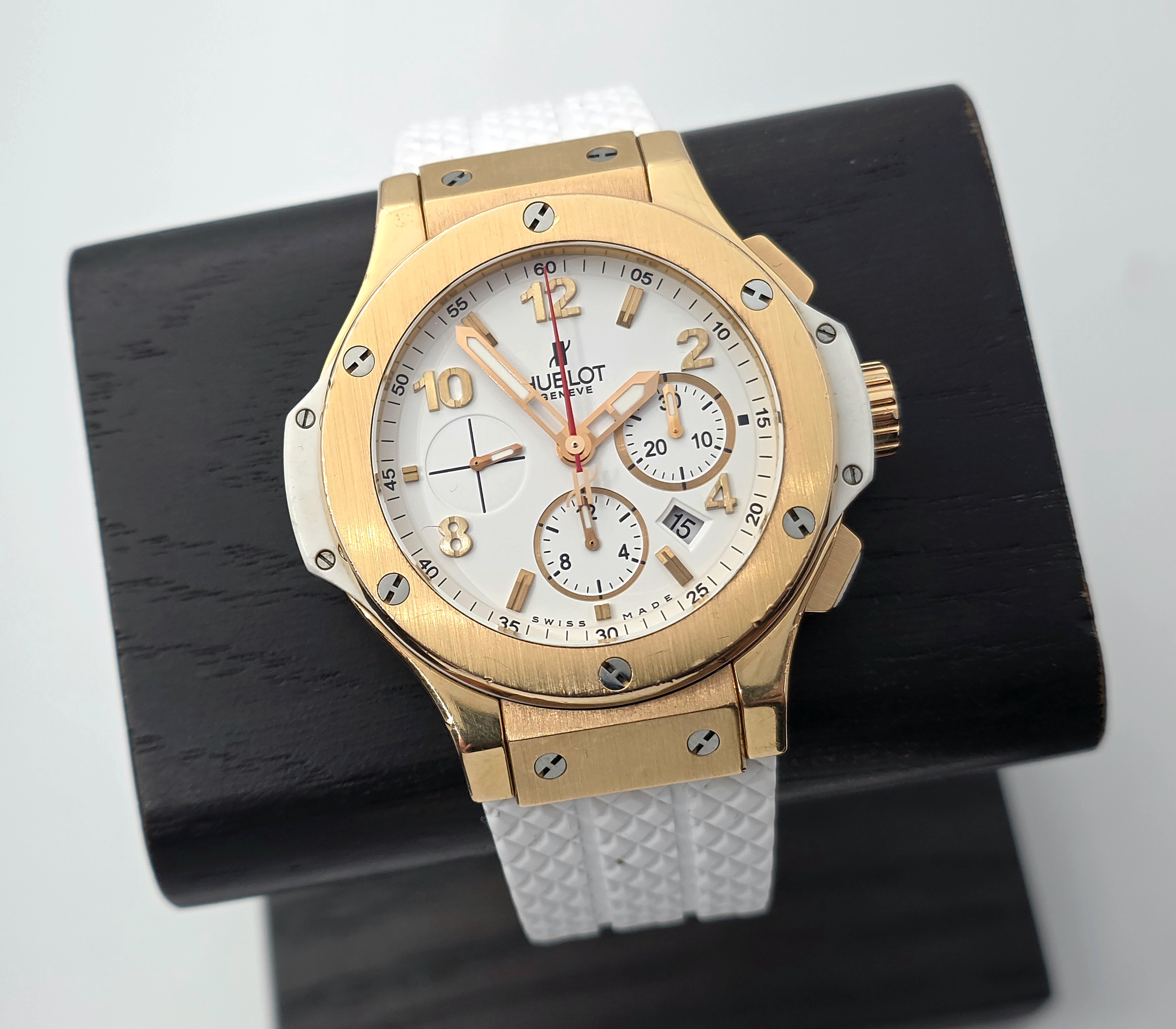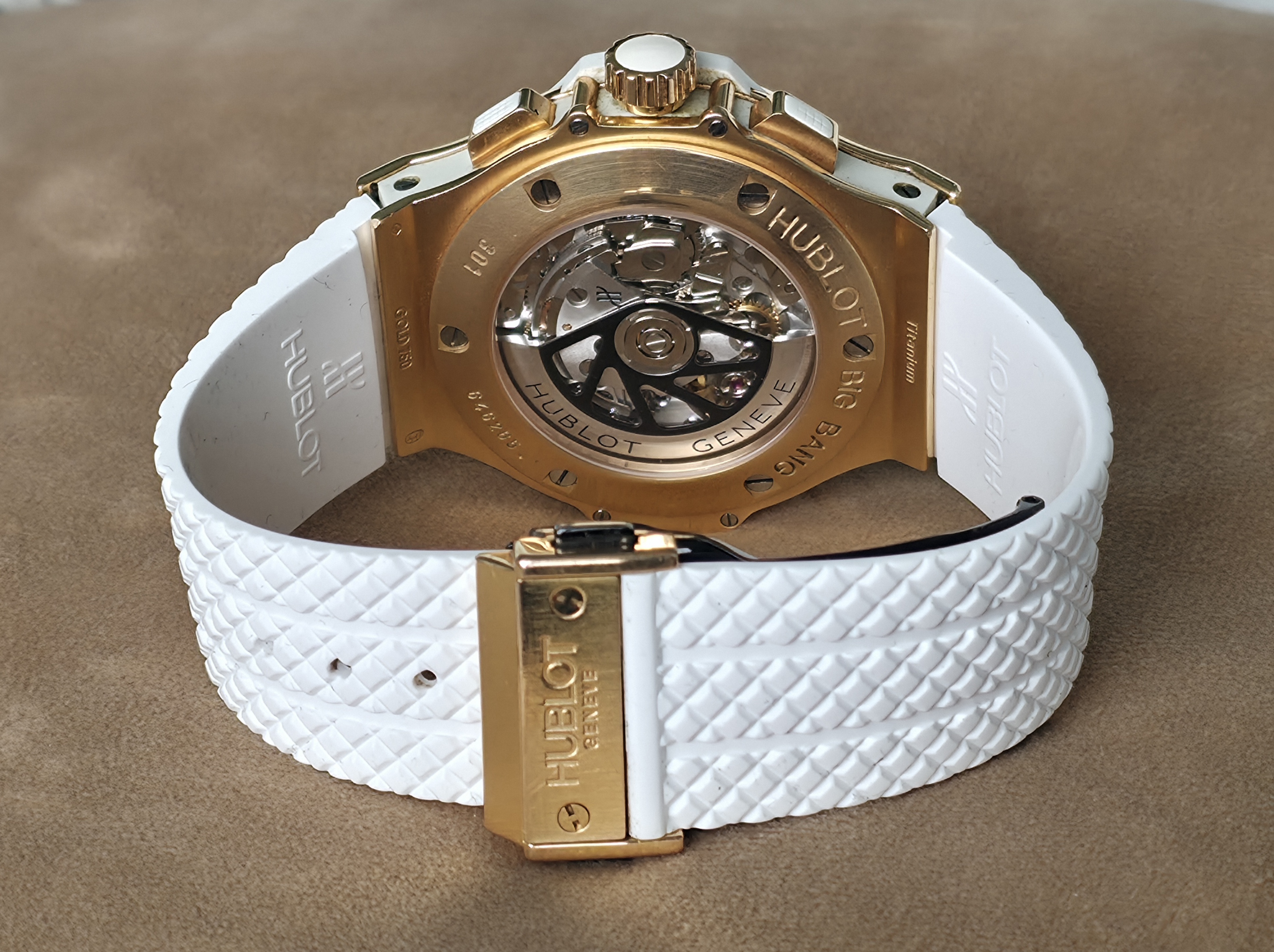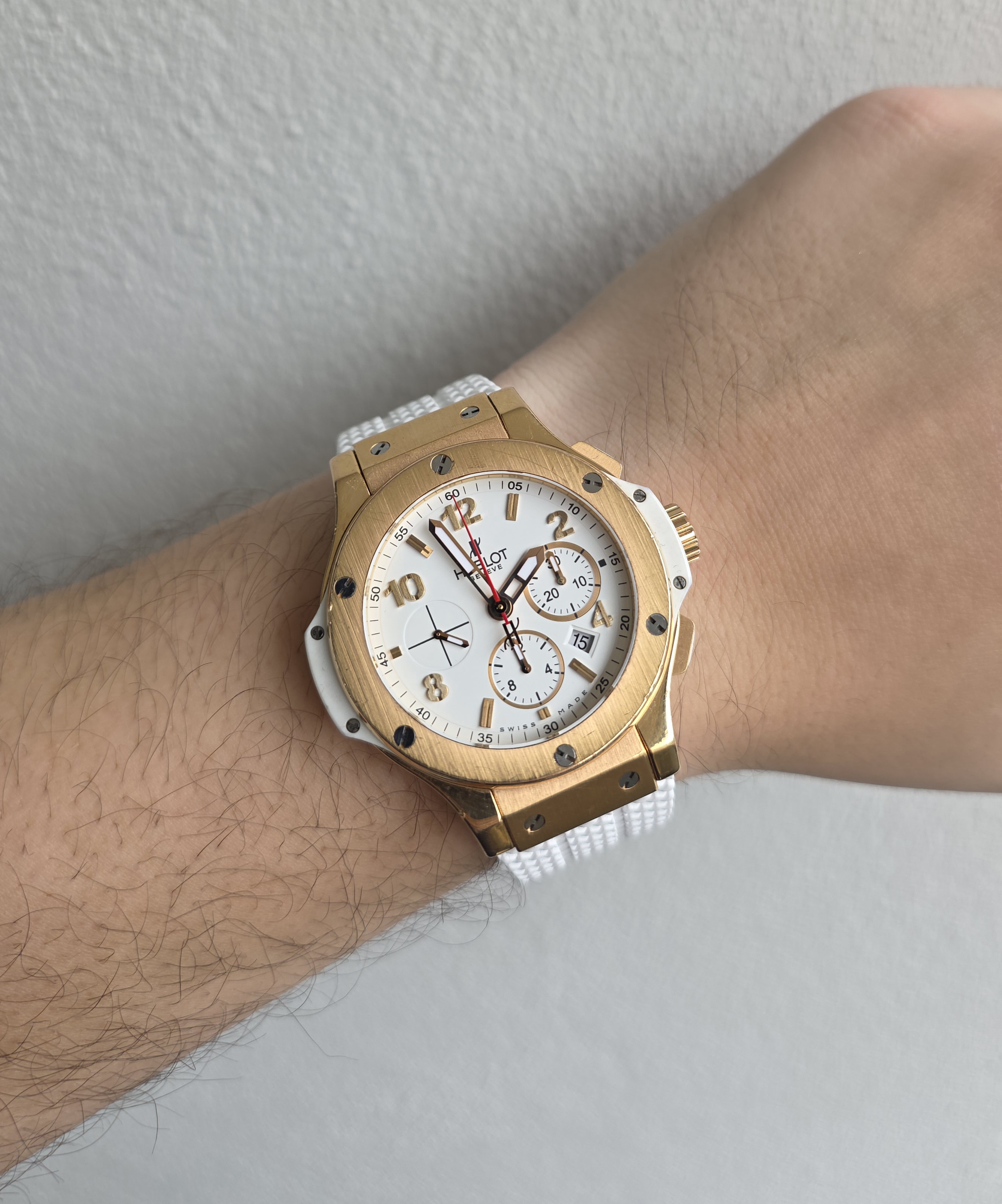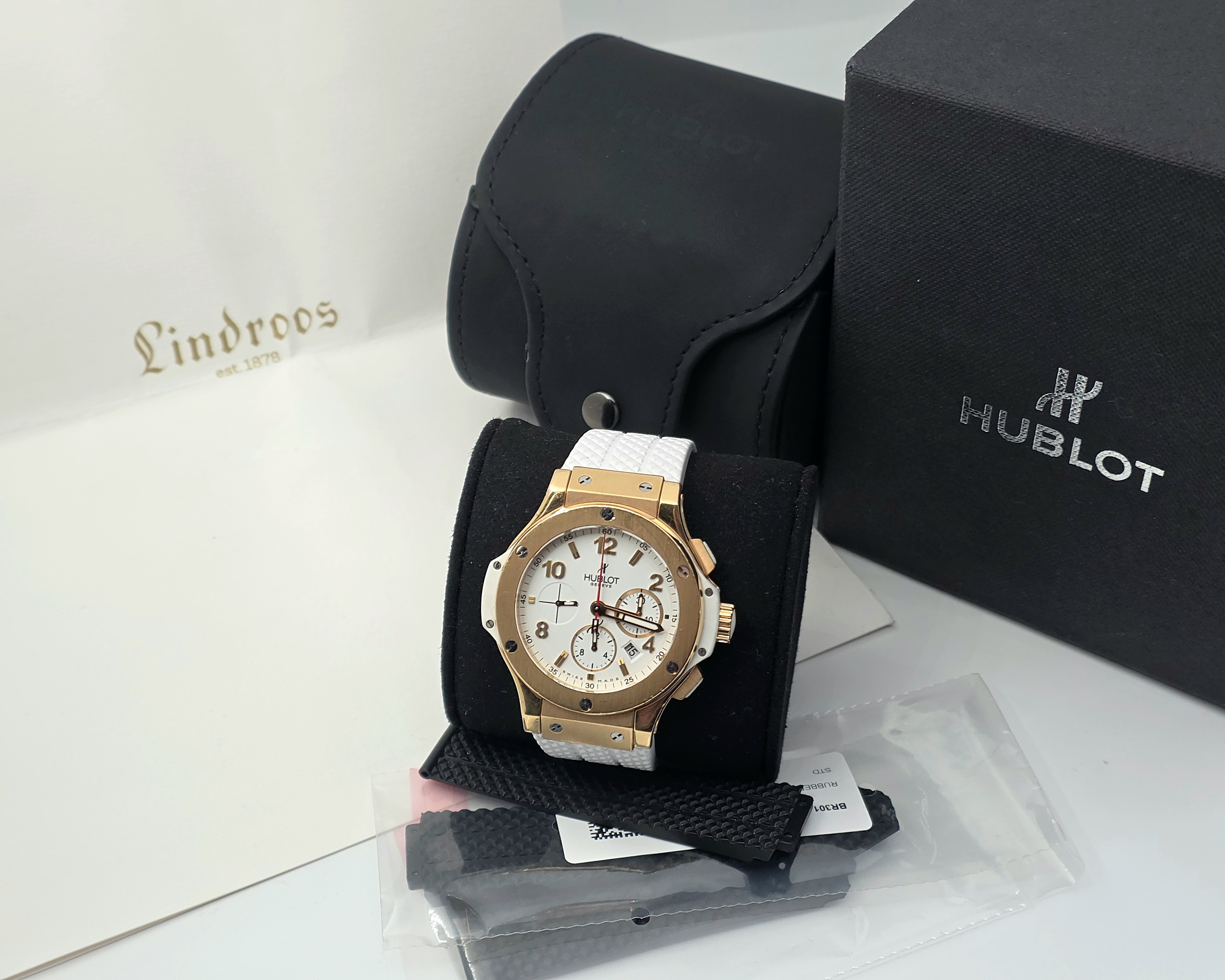 Todella näyttävä 18k kultainen Big Bang 44. Alkuperäistä laatikkoa tai papereita ei ole tallessa. Mukana on Hublotin huoltokotelo ja Lindroosin 01/2025 päivätty aitoustodistus. Kellossa on jonkin verran käytön jälkiä, toimivuus ja käynti on moitteetonta. Alkuperäisen valkoisen kumin lisäksi mukaan tulee käyttämätön, Hublotin samanlainen musta ranneke. Tämä upea kultainen Hublot on nyt saatavilla erittäin kilpailukykyiseen hintaan nopeimmalle! Ovh. 37 770e