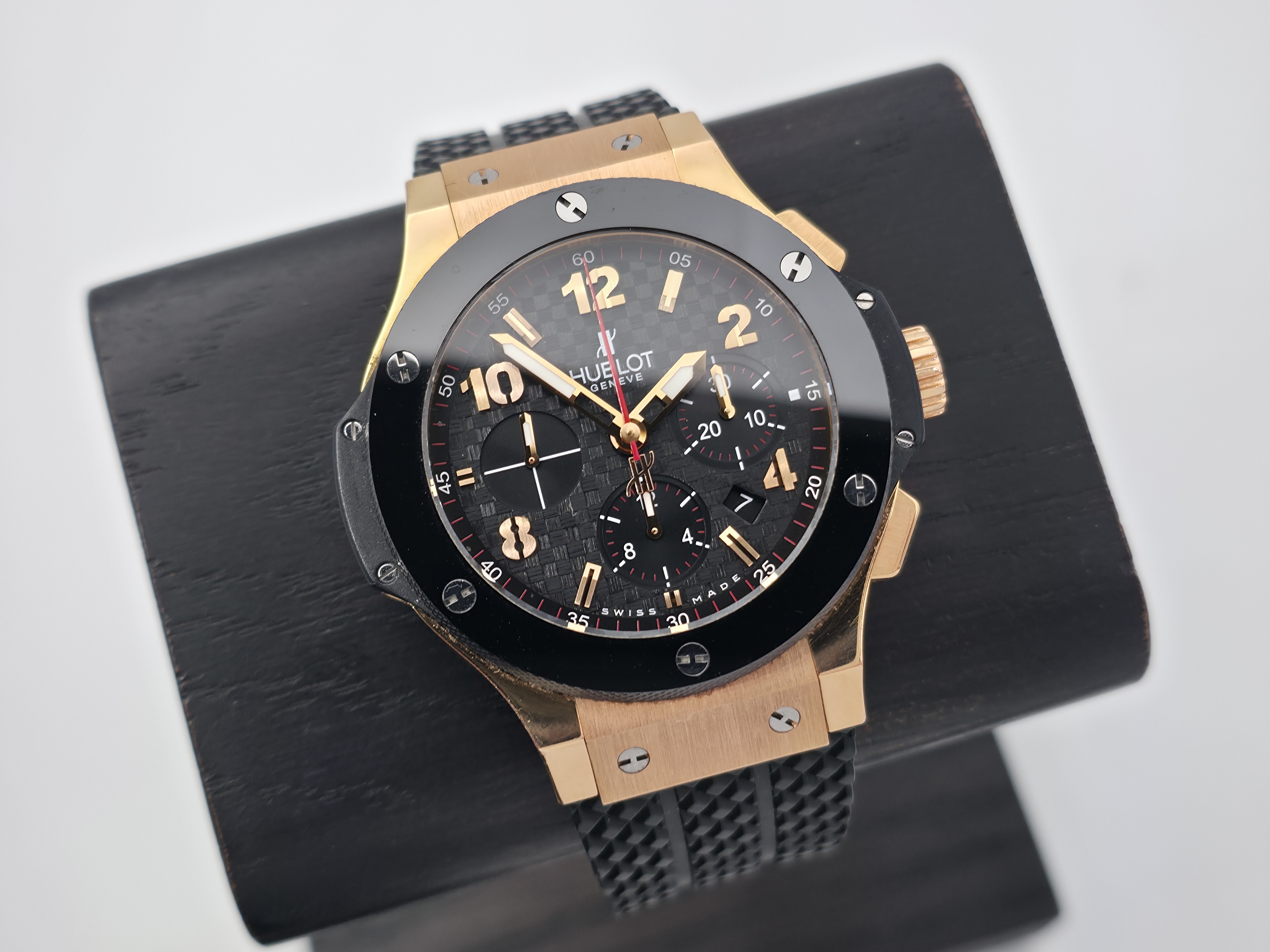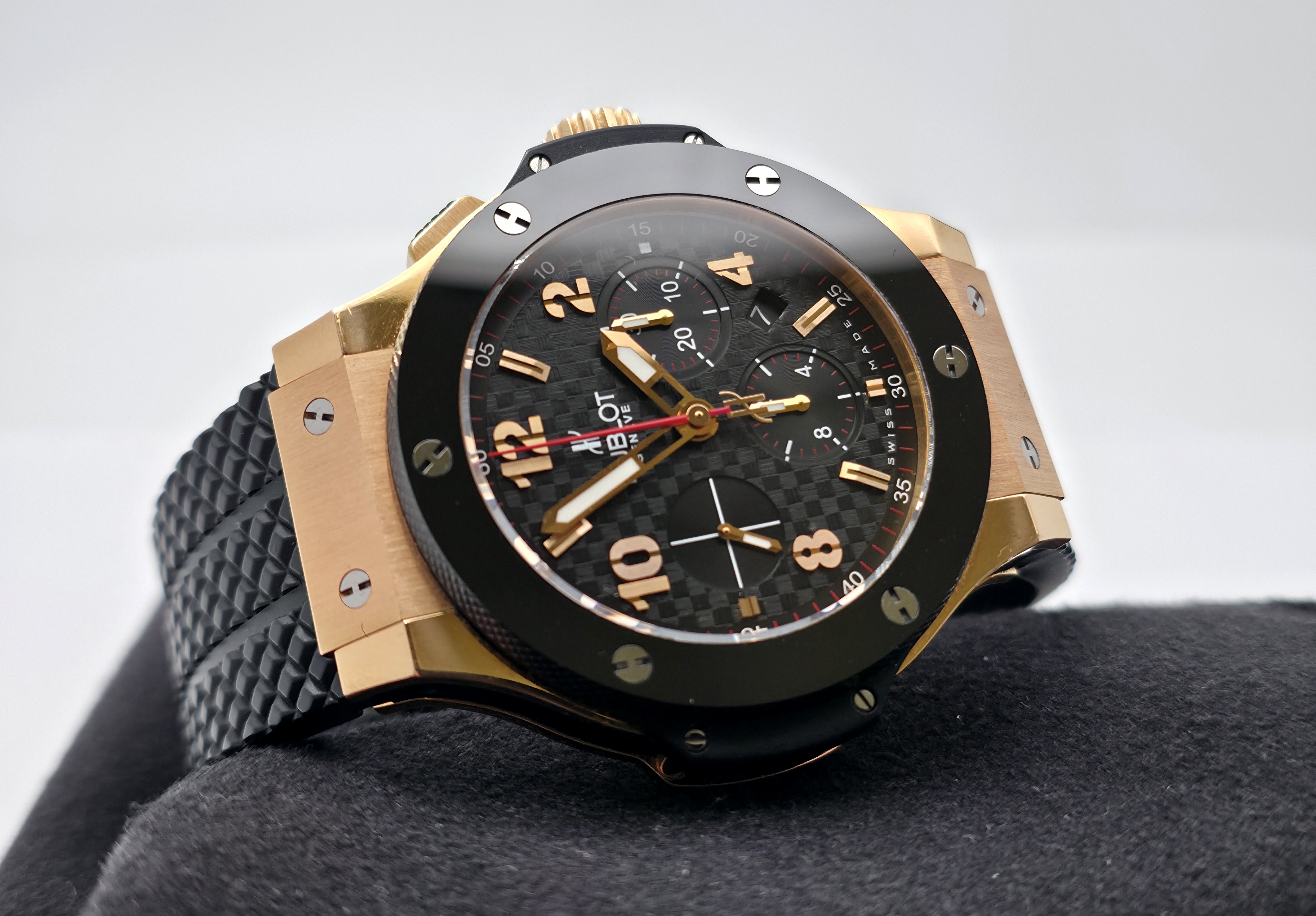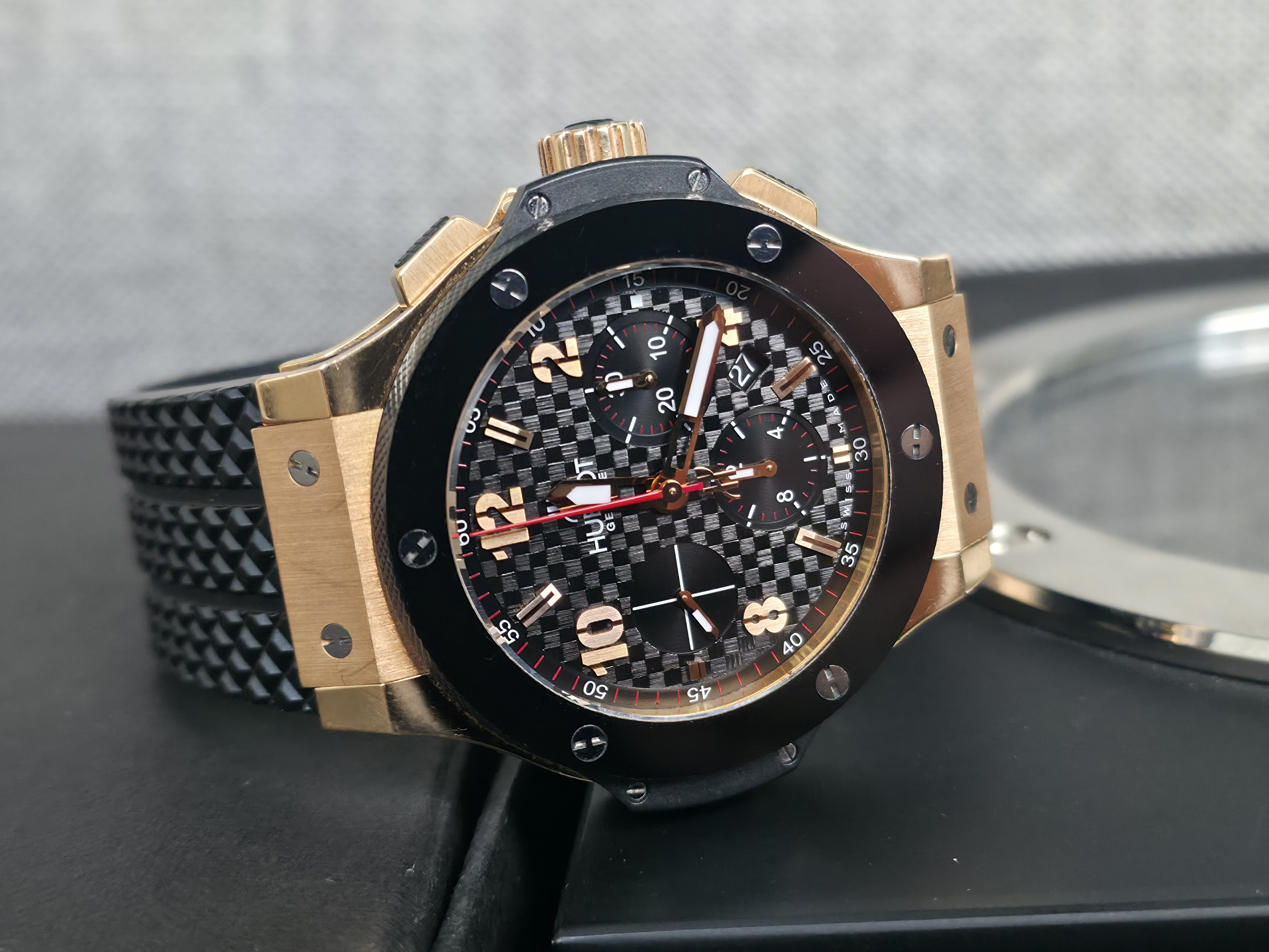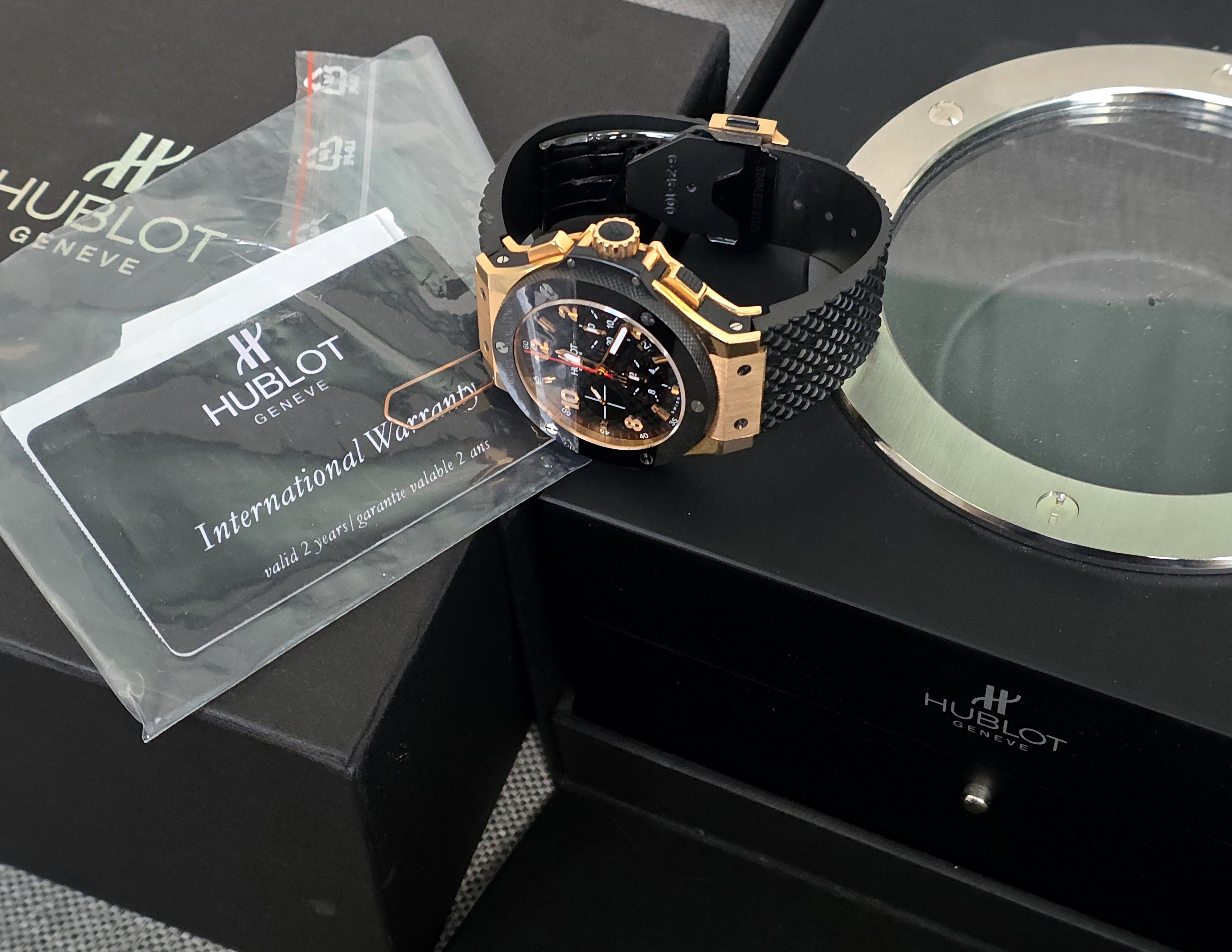 Röyhkeän upea Hublotin 18k kultainen Big Bang 44. Erittäin siistissä kunnossa oleva kulta Hublot, hiilikuitu taululla ja keraamisella bezelillä. Boksit ja kortti. Ostettu uutena 08/2015. Käy erinomaisin arvoin. Tästä hyvin edullisesti super hieno Big Bang! Ovh 34 200e