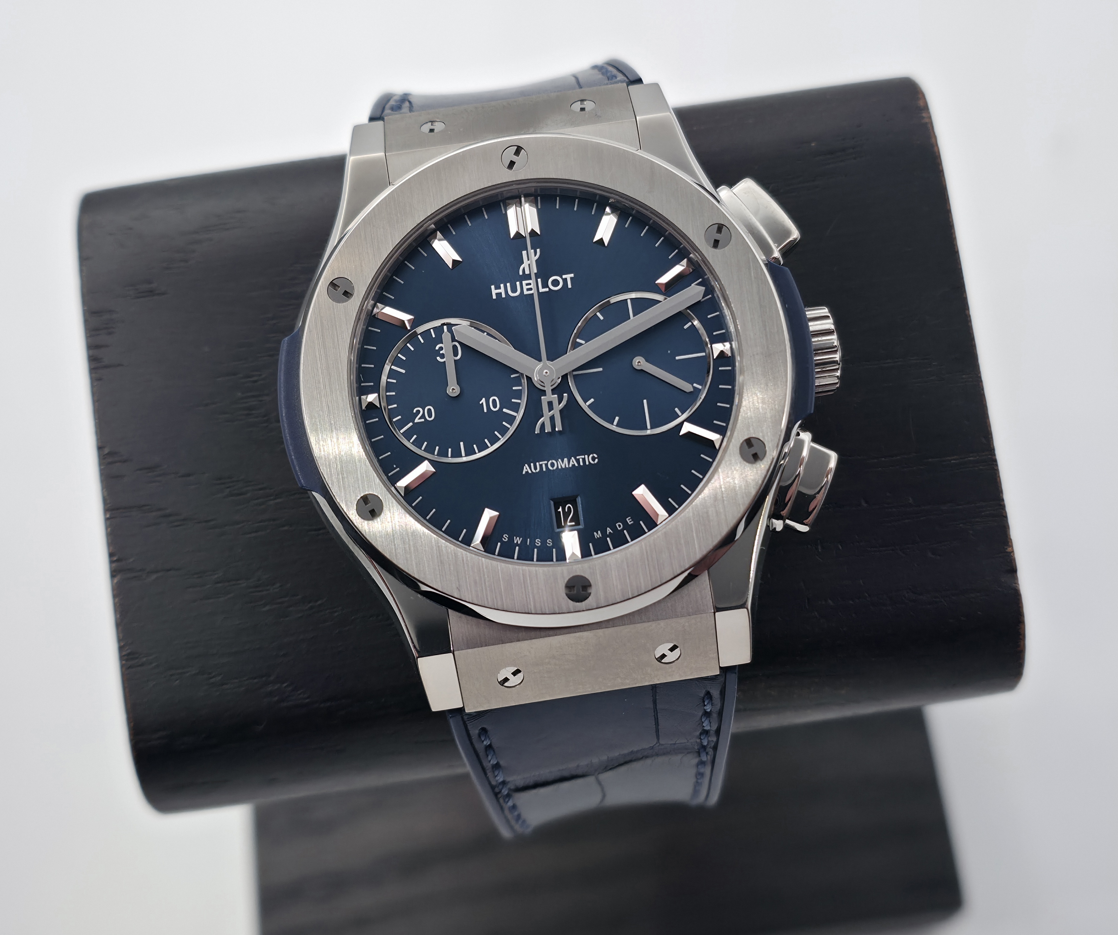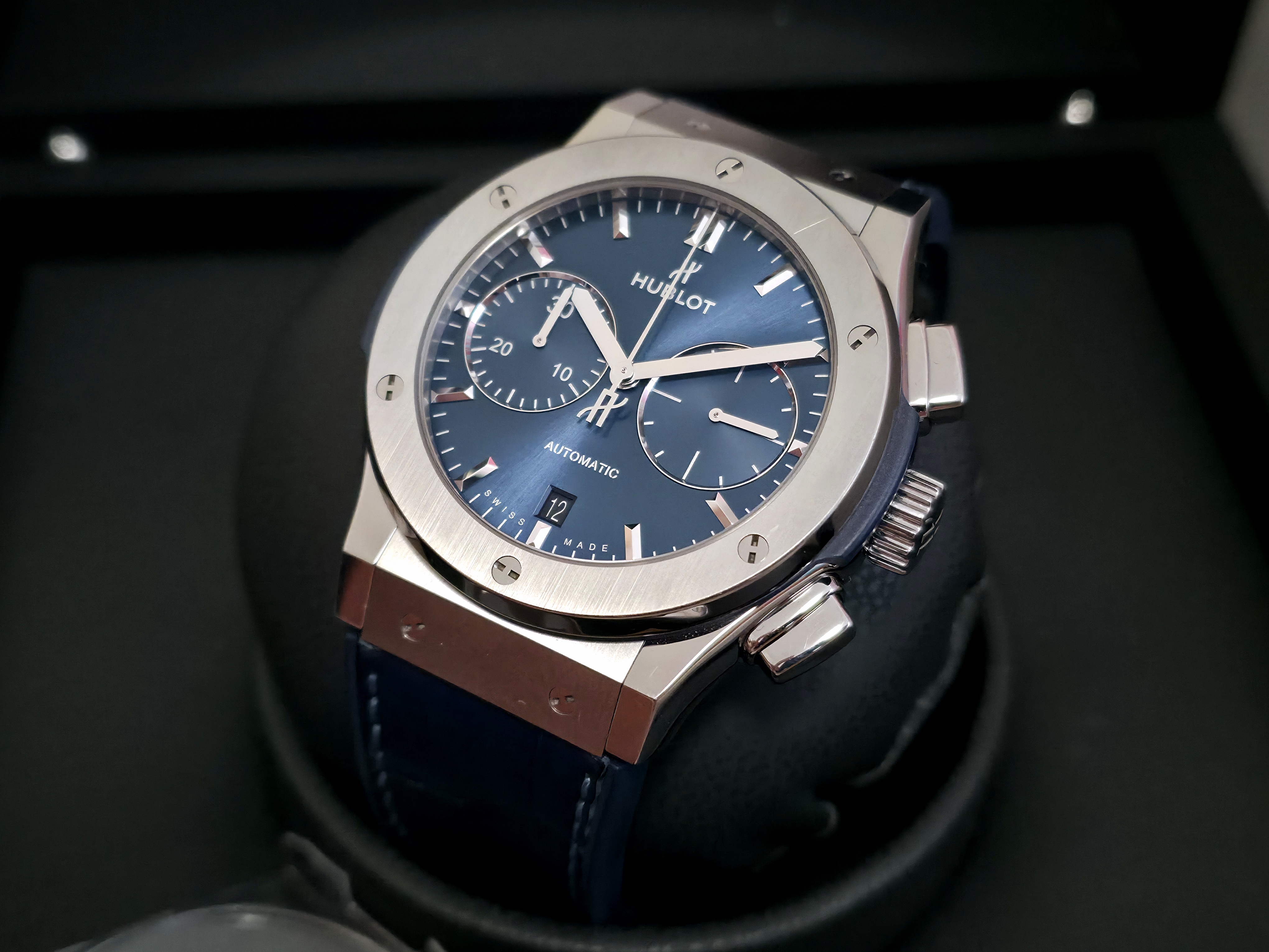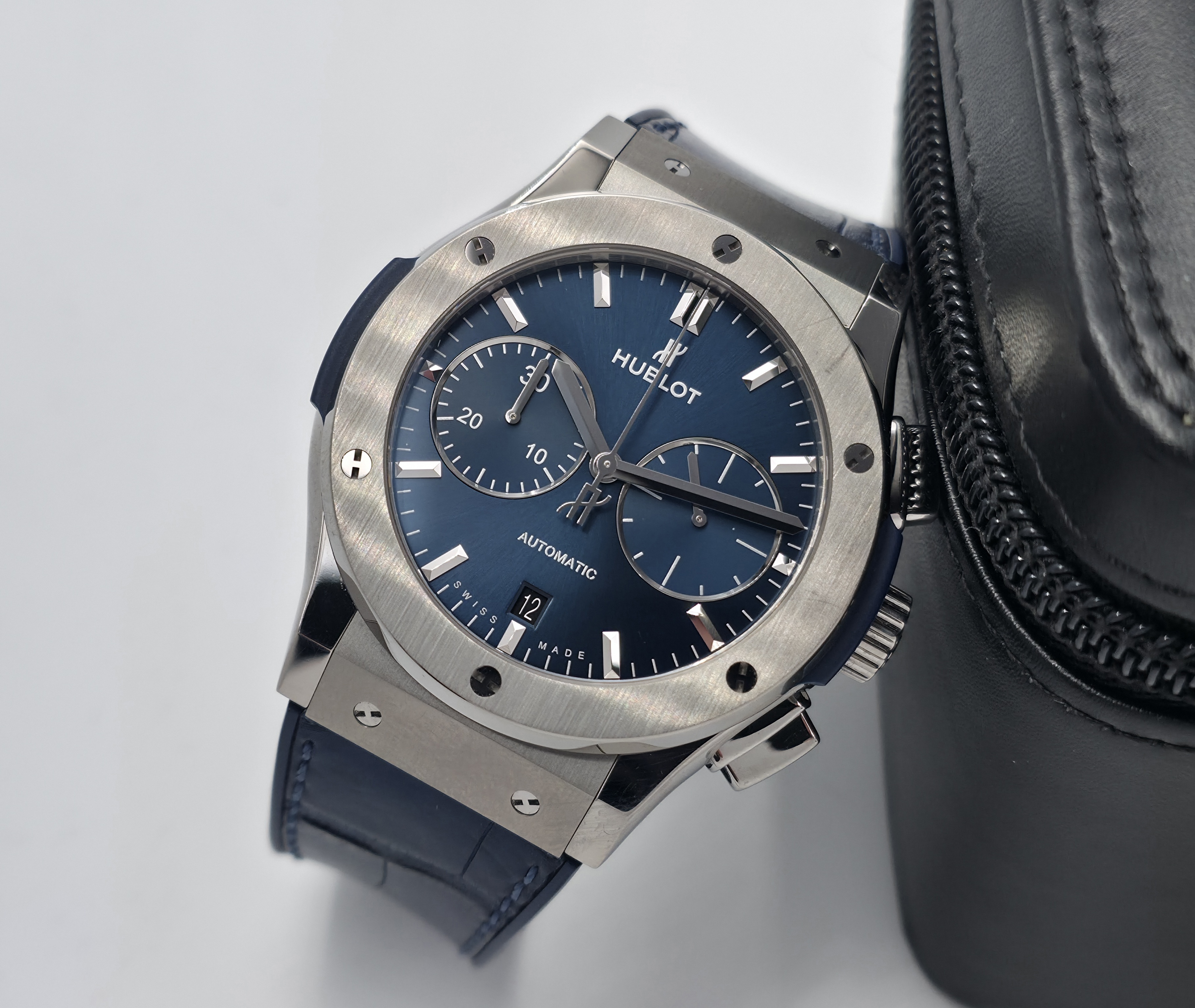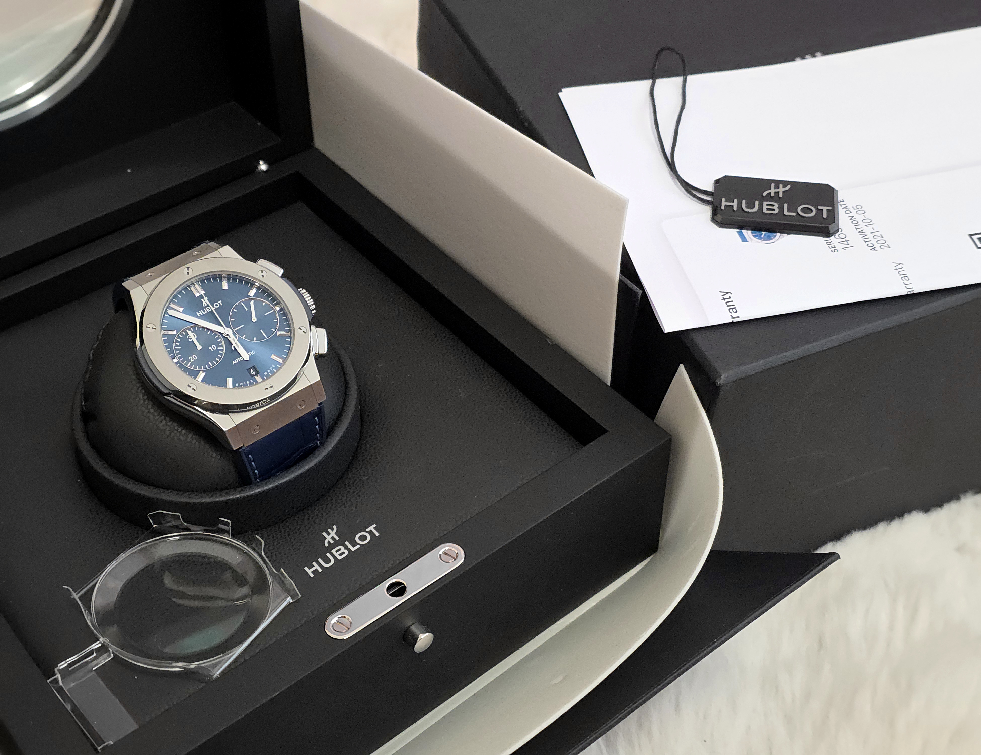 Hublot Classic Fusion Chronograph Titanium Blue 45mm. Minimalistinen mutta sporttinen design yhdistettynä kronografiin tekee tästä modernin ja monikäyttöisen kokonaisuuden. Kevyt titaanikuori tekee kellosta miellyttävän käyttää 45mm koosta huolimatta. Sininen sunburst-taulu ja nahkapäällysteinen kumiranneke tuo kokonaisuuteen mukavasti näyttävyyttä. Fullset (E-warranty aktivoitu 10/2021) Siistissä kunnossa. Ovh. 12 000e