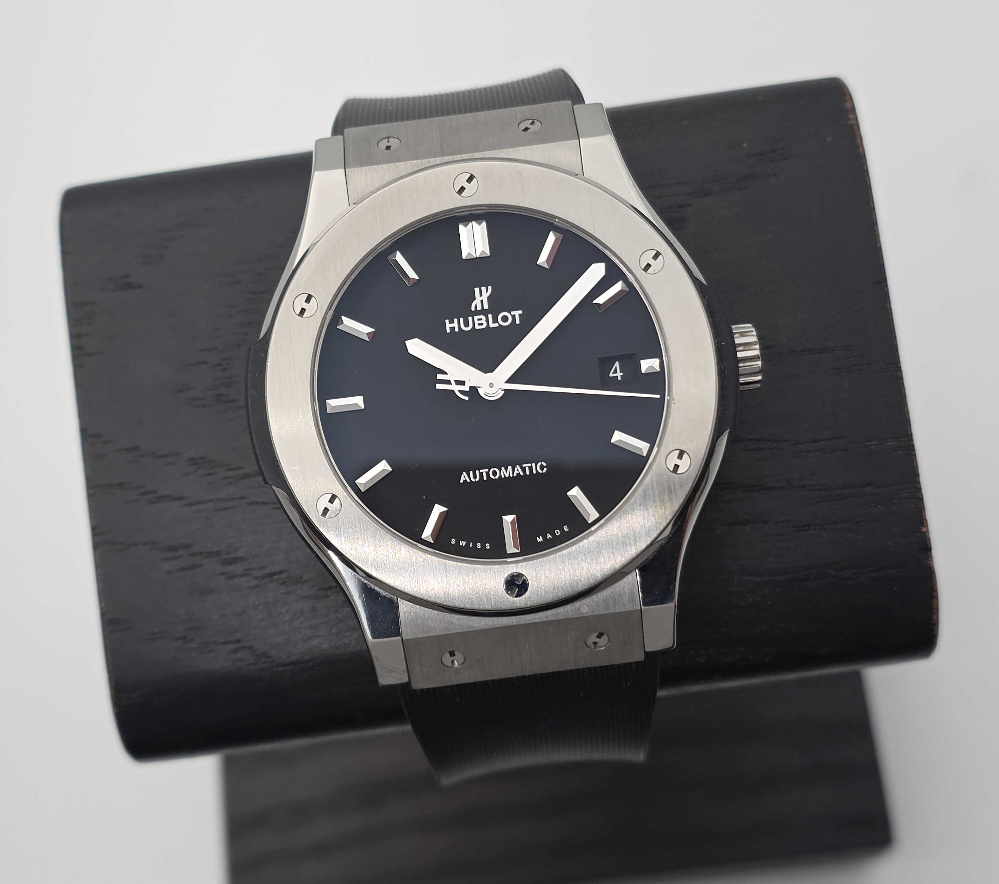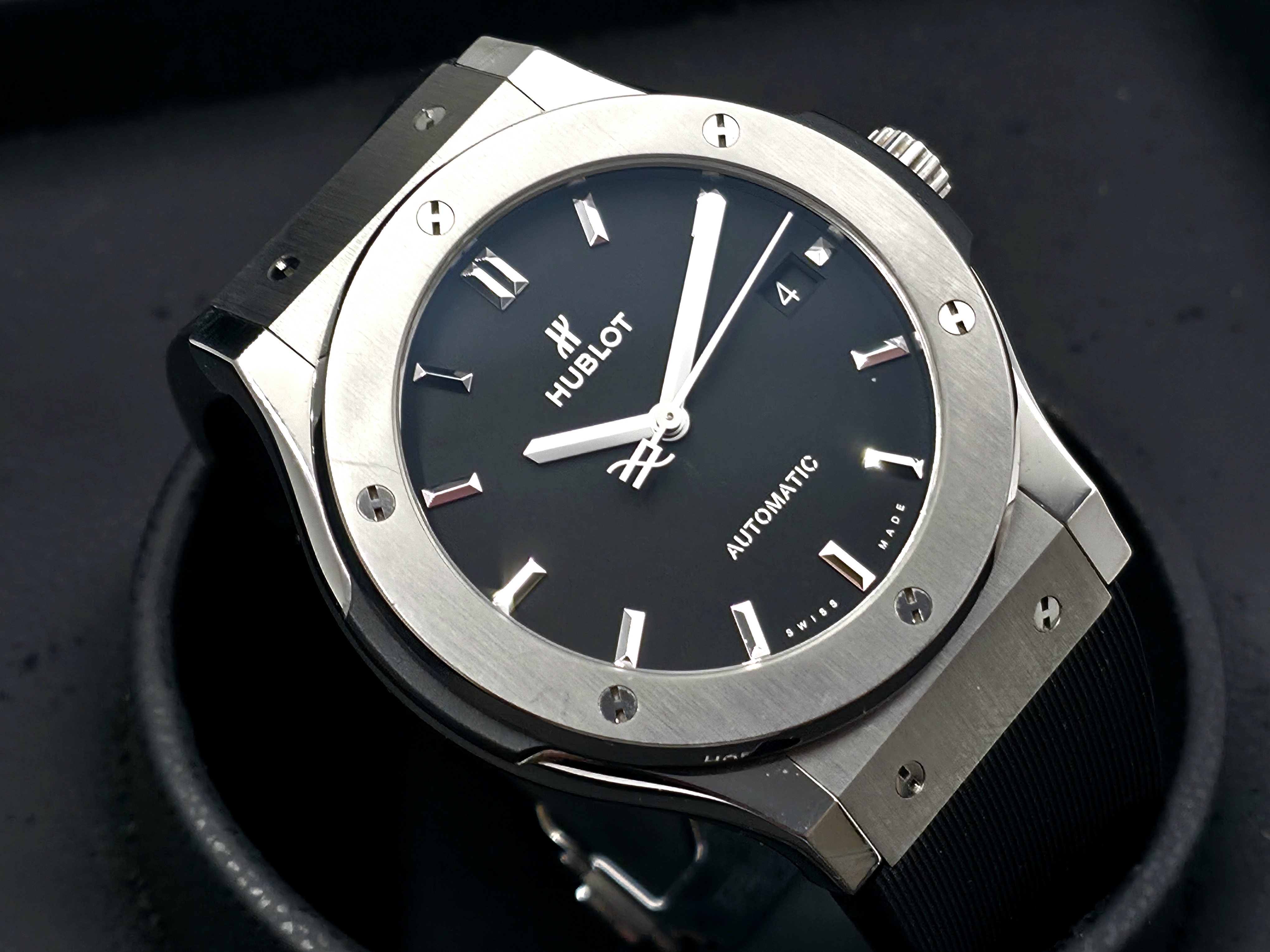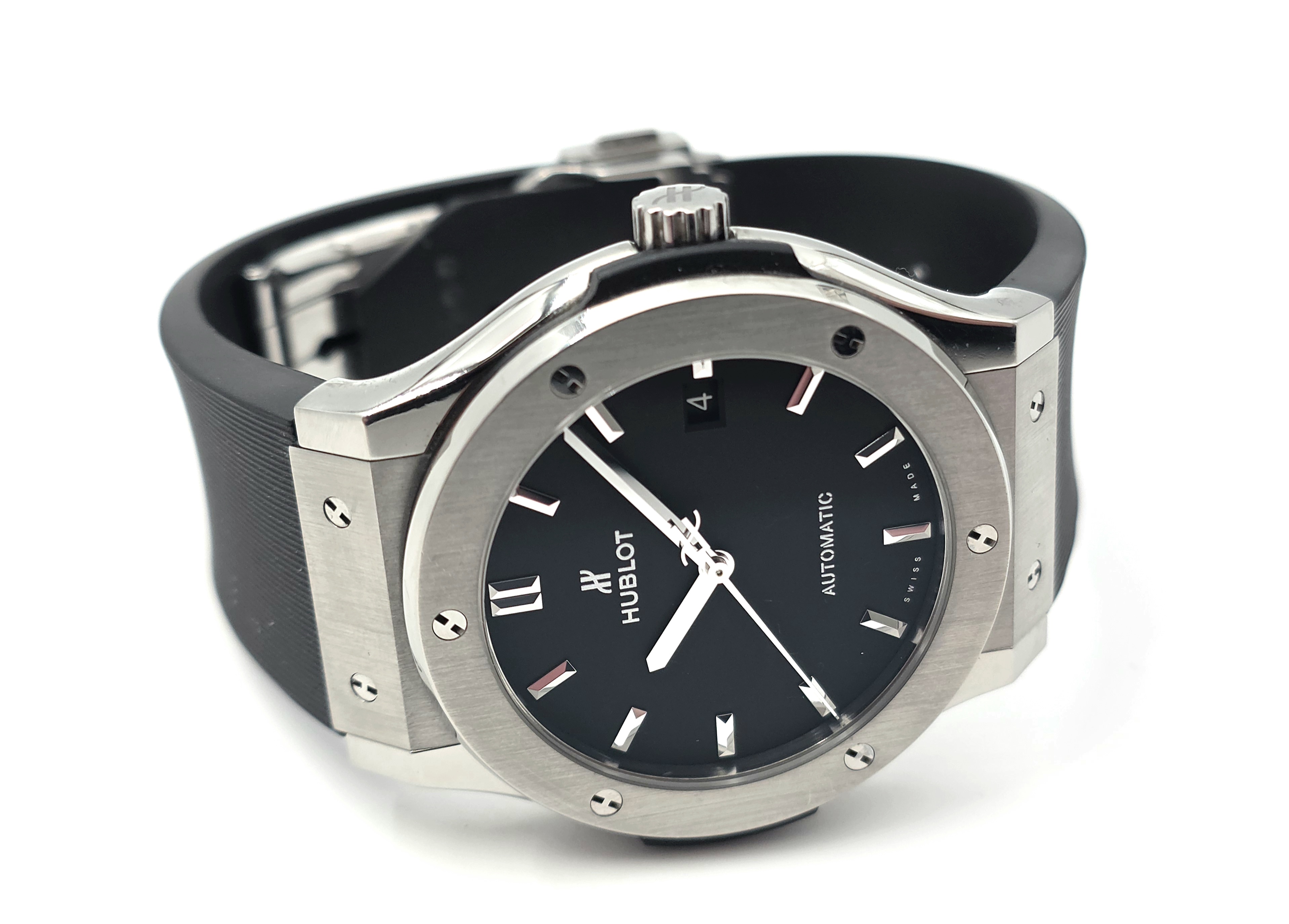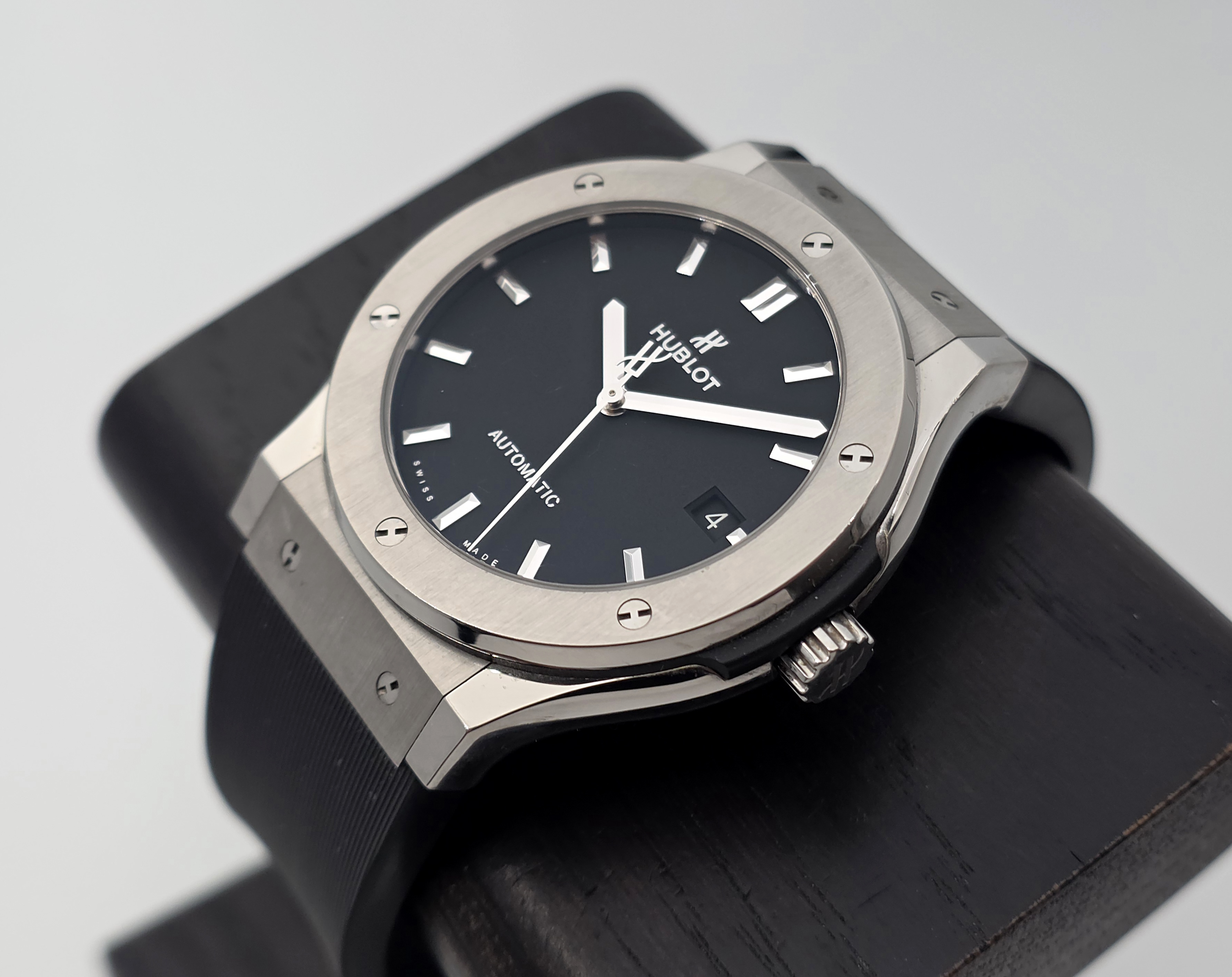 Klassinen mustalla taululla oleva titaaninen 45mm Classic Fusion. Kevyttä käytönjälkeä löytyy Setissä mukana boksi, kortti (06/2016) ja 01/2023 tehtaan huollosta dokumentit. Titaanin keveyden ansiosta erinomaista rannetuntumaa tarjoava simppelin tyylikäs malli! Ovh. 8500e