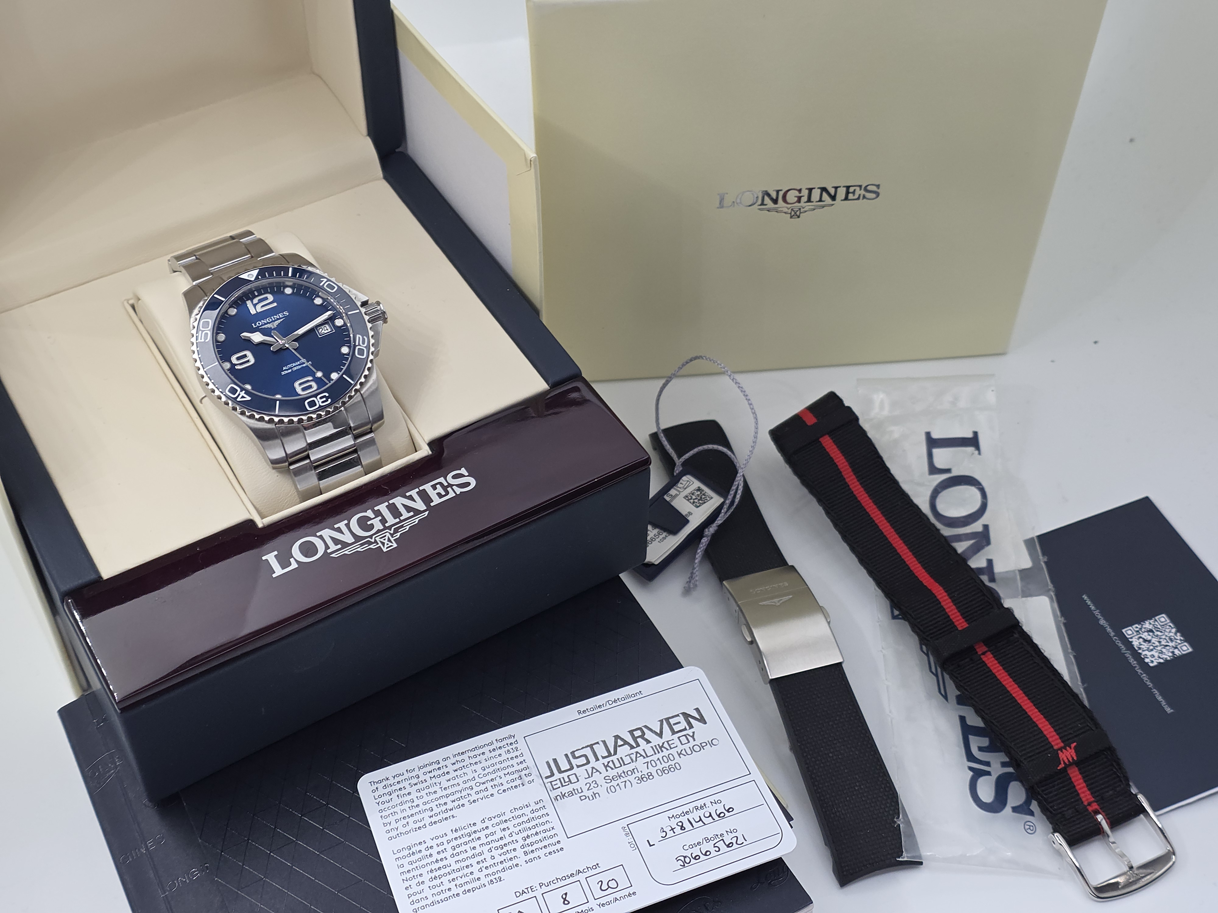 Uusimman mallin Hydroconquest 41mm keraamisella bezelillä ja 72h käyntivaran koneistolla. Todella hyvää vastinetta rahalle tarjoava diveri. Ominaisuuksia mm. 300m wr, L888 koneisto antimagneettisella piispiraalilla, sunburst taulu ja upea sininen lume. Fullset 08/2020. Mukana myös erikseen ostetut valmistajan kumi- ja kangasrannekkeet. Ovh. 2050e