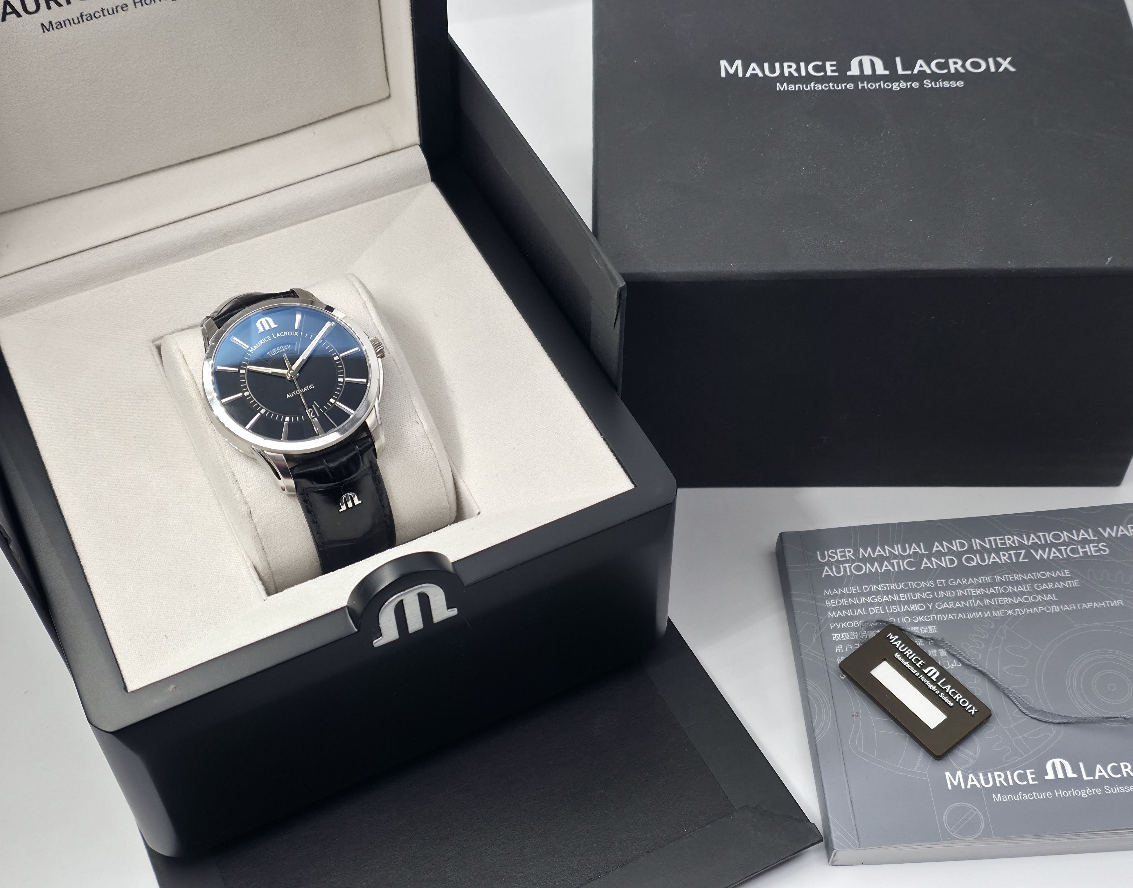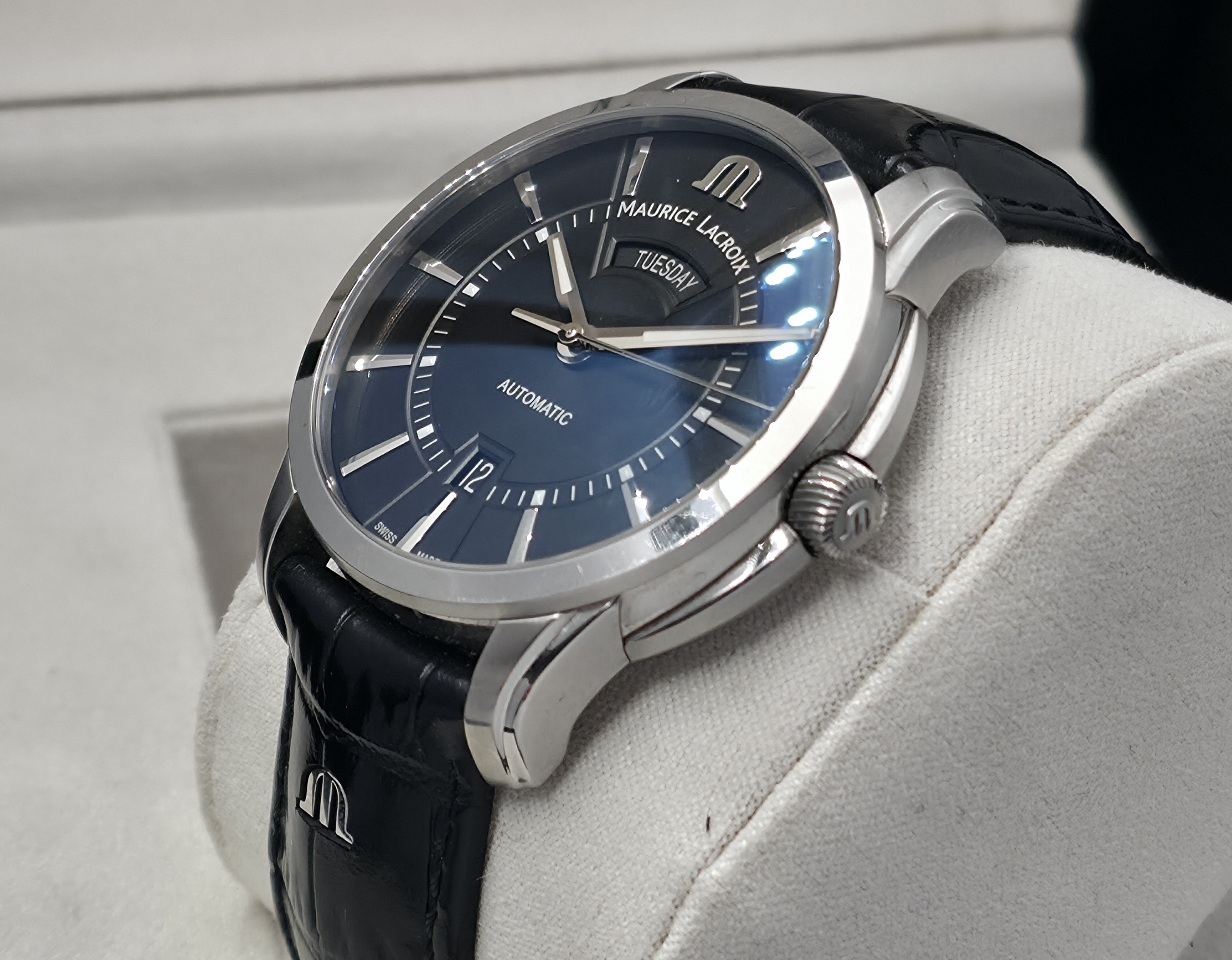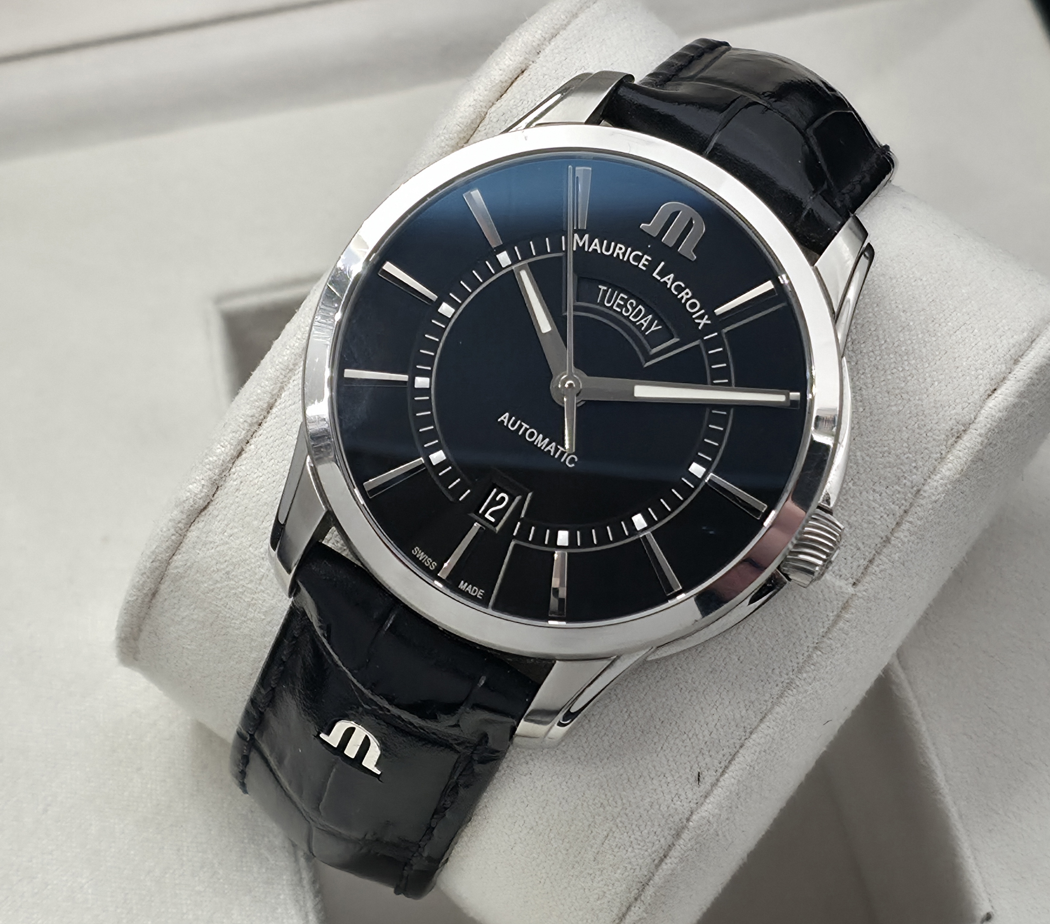 Maurice Lacroix Pontos Day-Date tyylikkäällä mustalla taululla. Selkeä ja tasapainoinen design yhdistettynä day-date -toimintoon tekee kellosta erittäin käytännöllisen kokonaisuuden. Siistikuntoinen ja tarkasti käyvä fullset 07/2022. Tästä laadukas ja elegantti Pontos suoraan ranteeseen! Ovh. 1990e