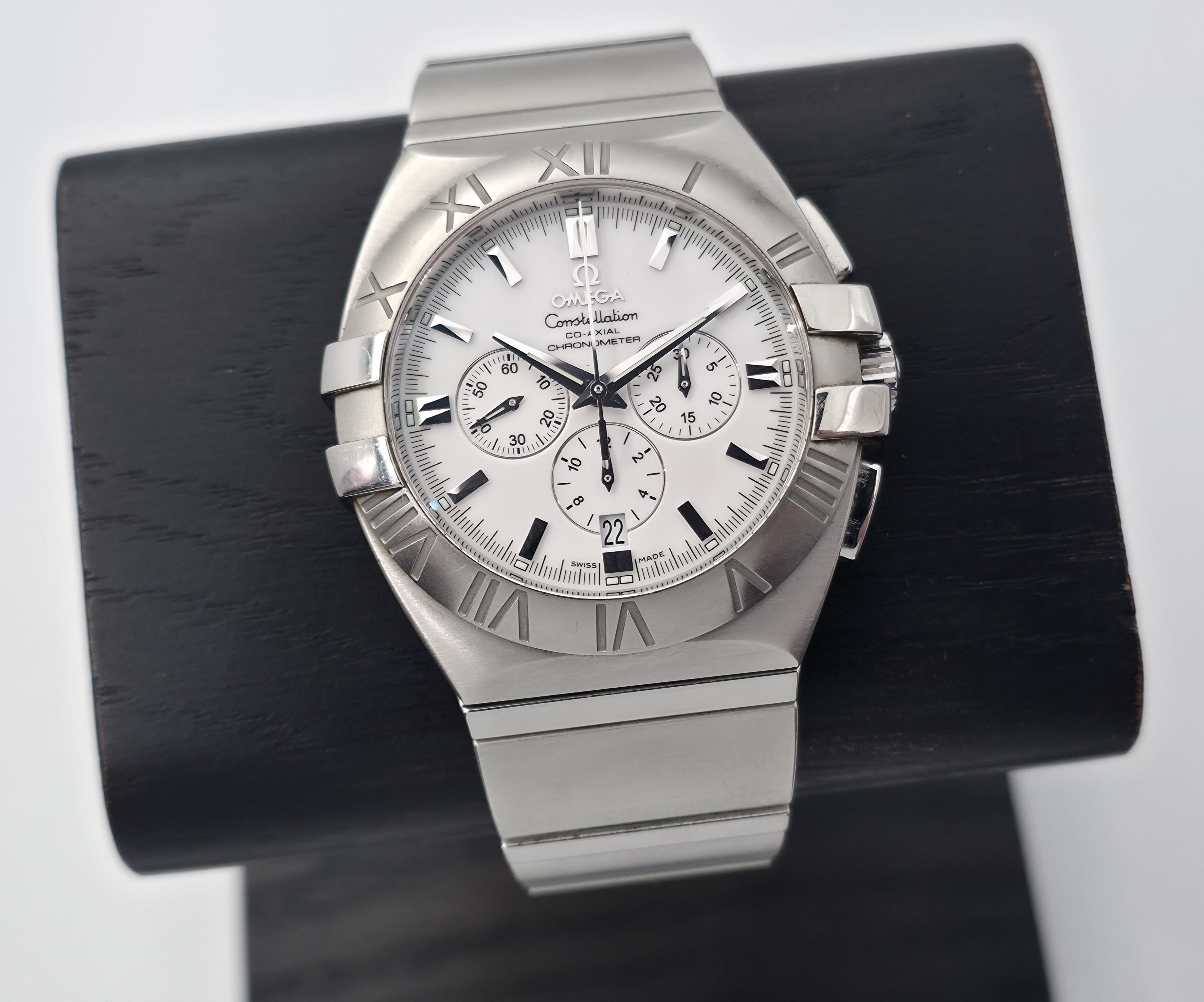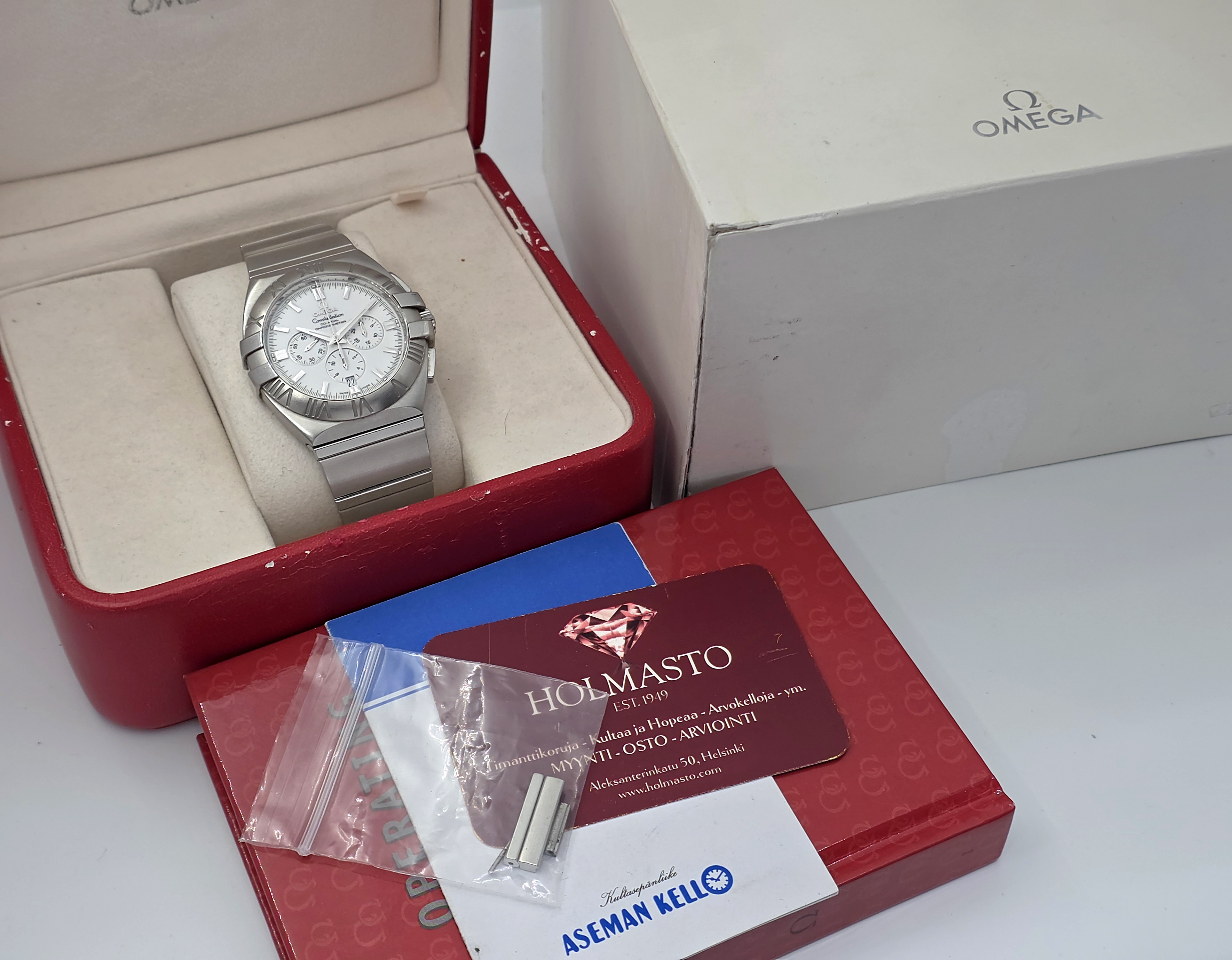 Tarjolla on harvinainen Omega Constellation Double Eagle -malli, automaattikoneistolla ja 41 mm:n koossa. Kellossa on tyylikäs valkoinen kellotaulu. Mukana alkuperäiset laatikot, käyttöohje sekä huoltotosite maaliskuulta 2018. Tästä näyttävä Constellation Chrono Double Eagle!