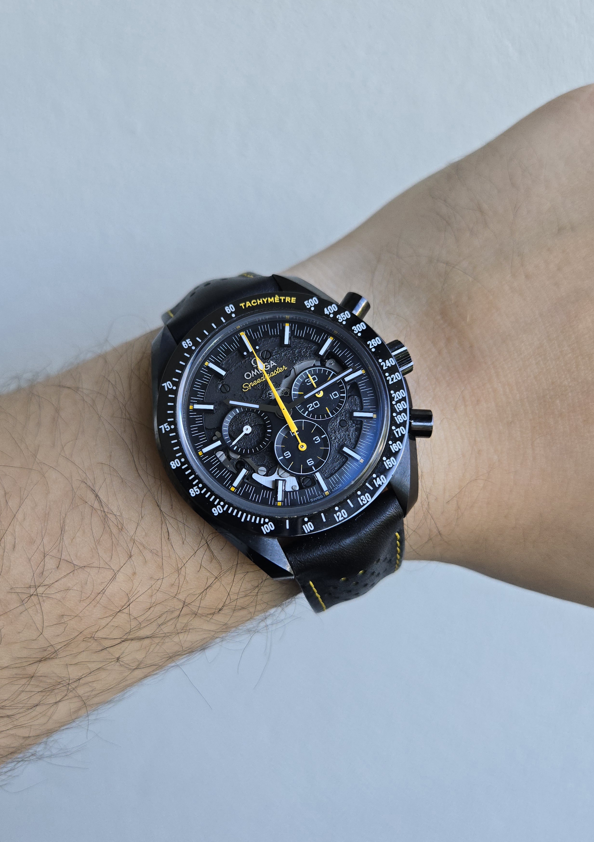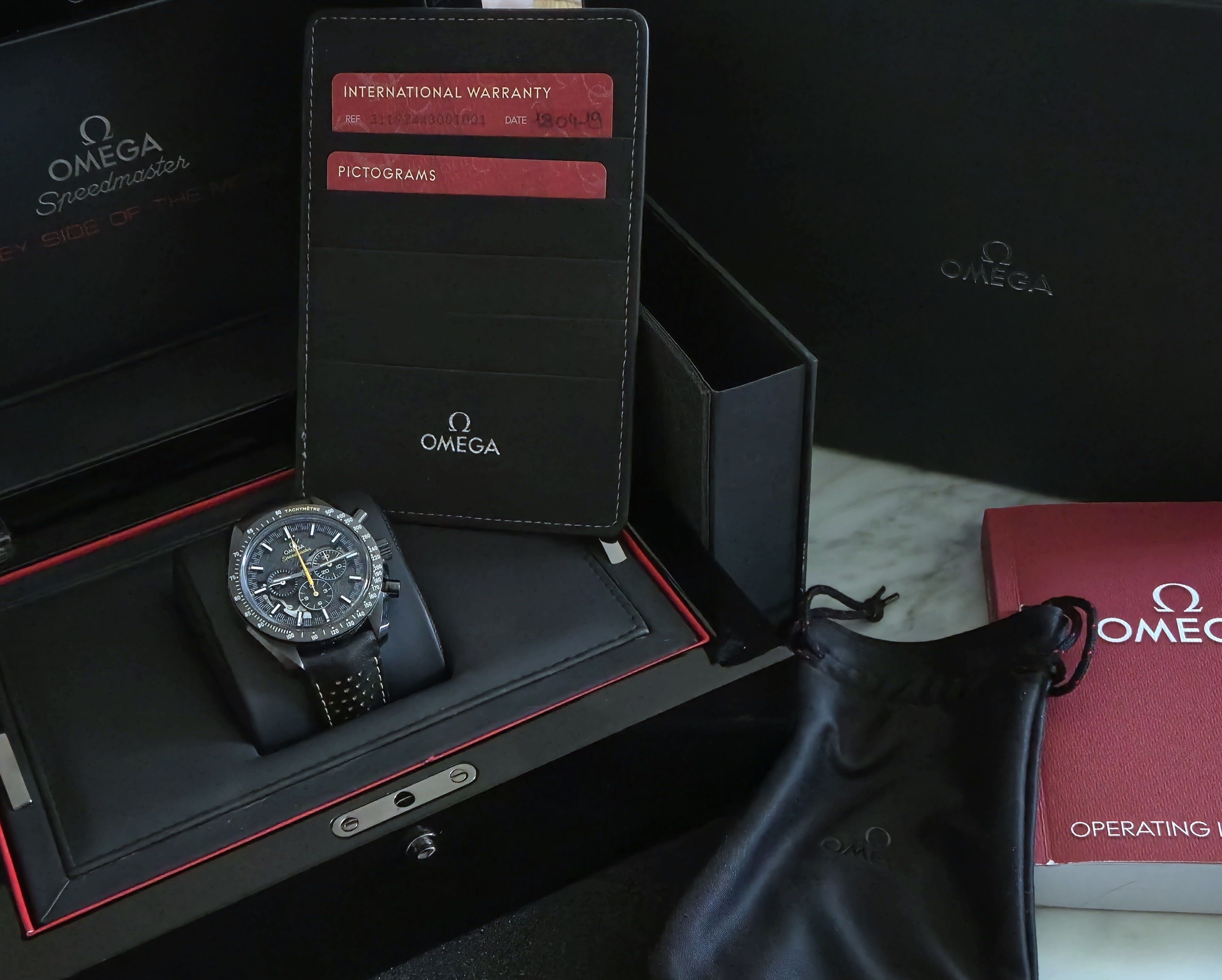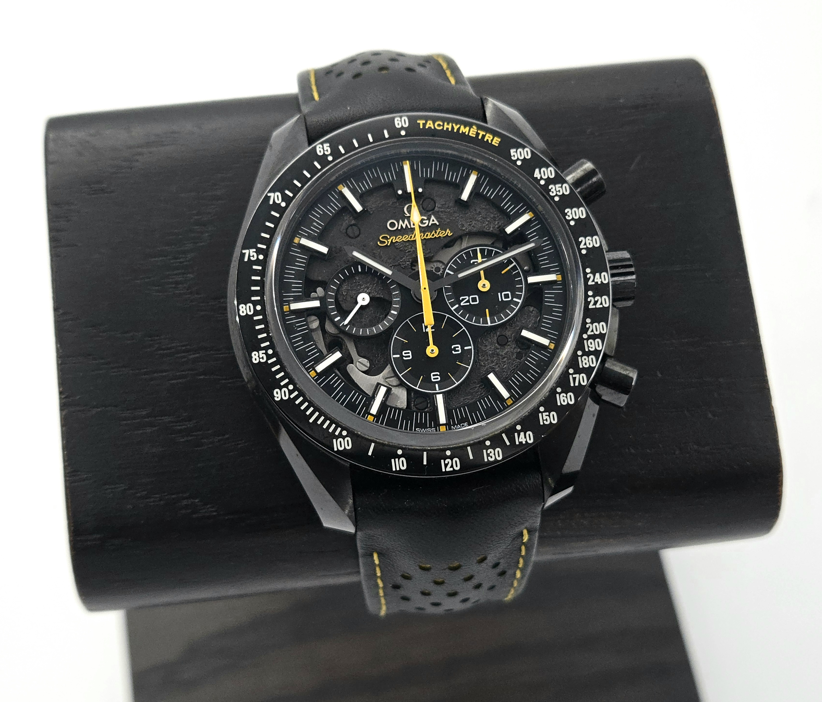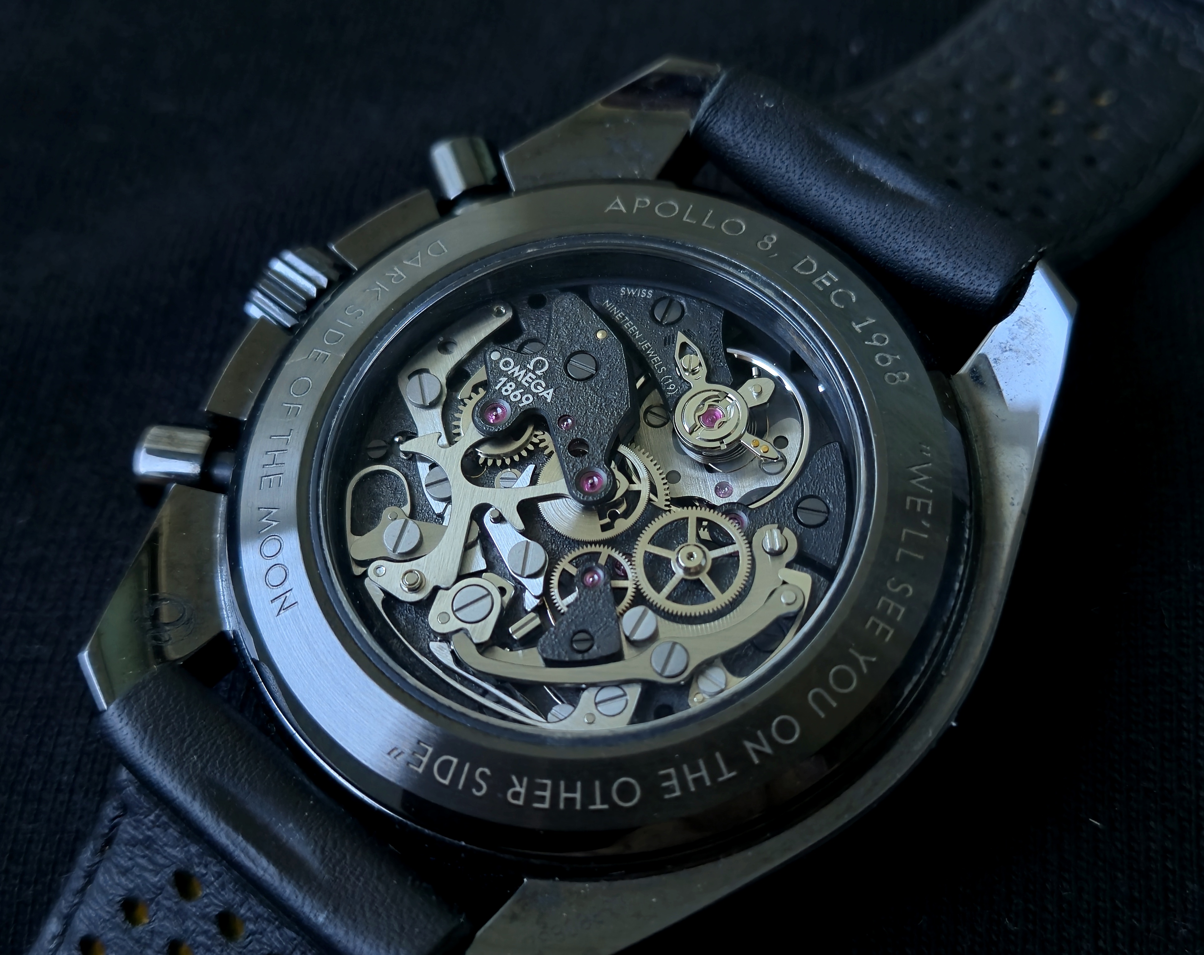 Upea Speedmaster Dark Side of the Moon Apollo 8 Erikoismalli. Todella hieno keraamisella kuorella oleva Speedy täynnä hienoja yksityiskohtia! Bezelissä pieni, hyvin huomaamaton osuma, muuten erinomaisessa kunnossa. Fullset 04/2019.