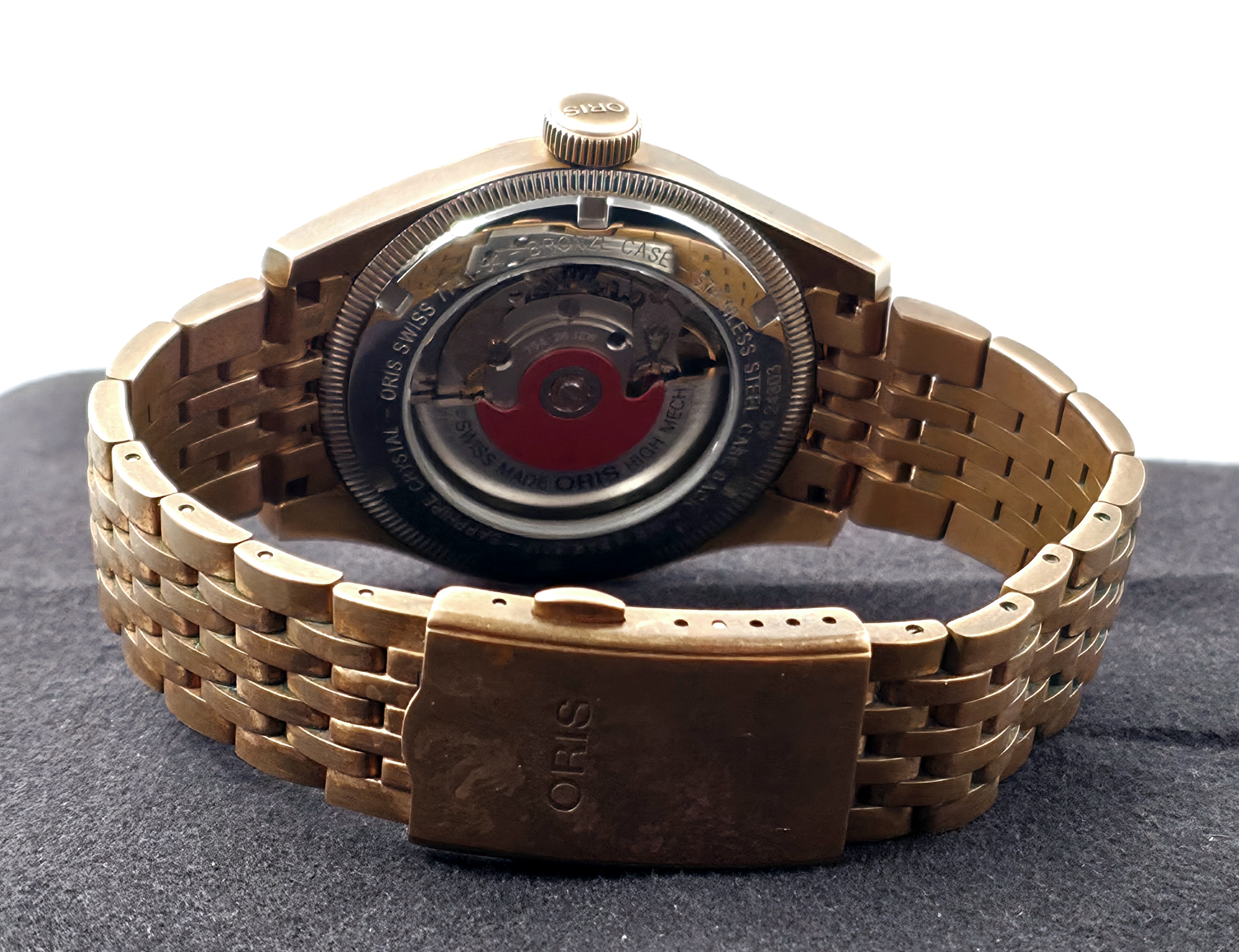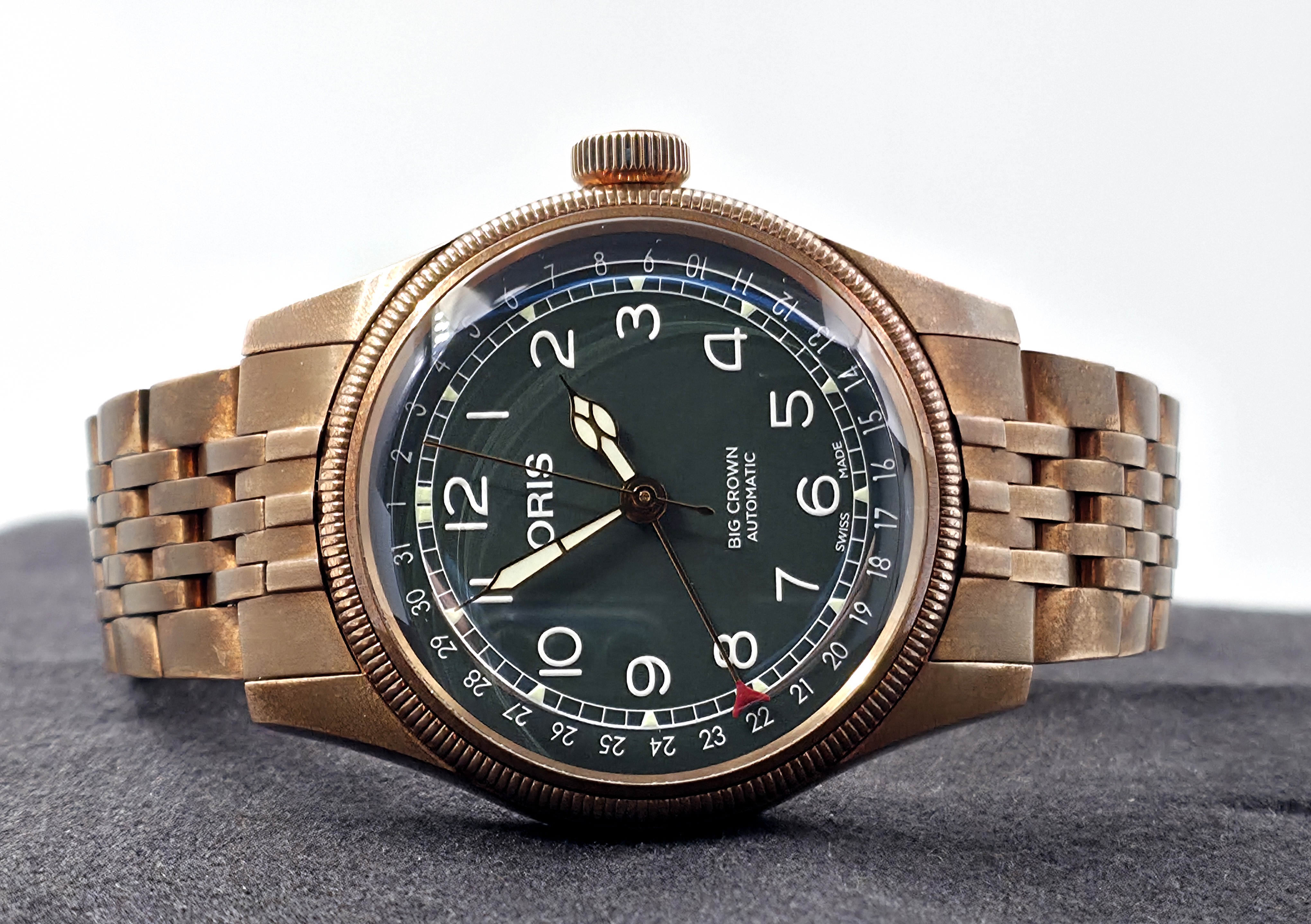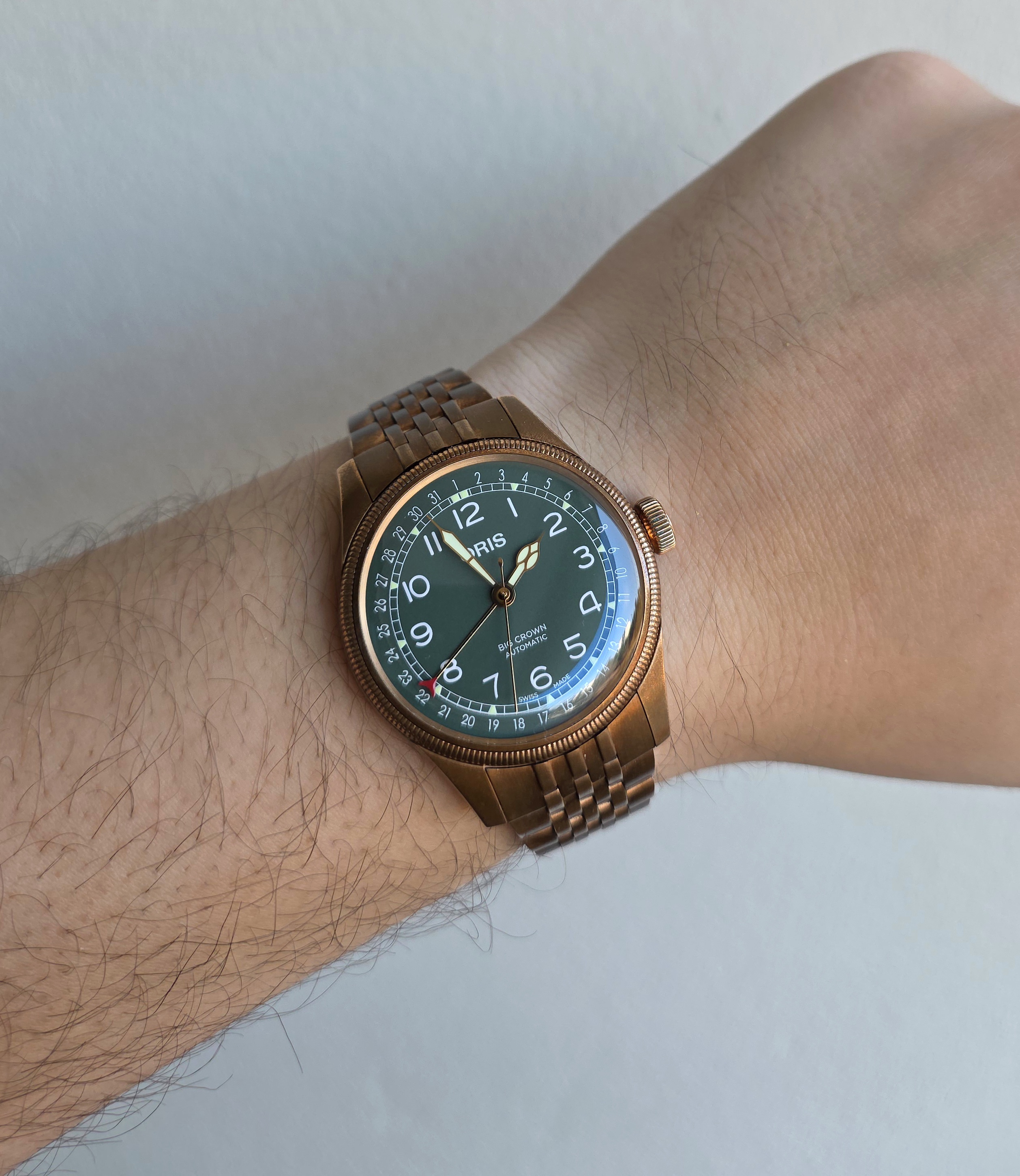 Tyylikäs Oris Big Crown Pointer Date pronssikuorella ja vihreällä taululla. Klassinen pilot-henkinen design yhdistettynä pointer date -toimintoon. Pronssikuori patinoituu käytössä yksilöllisesti, mikä antaa kellolle uniikin ilmeen. Kompakti 40mm koko istuu erinomaisesti ranteeseen. Fullset 07/2025. Takuu voimassa 07/2027 asti. Ovh. 2900e