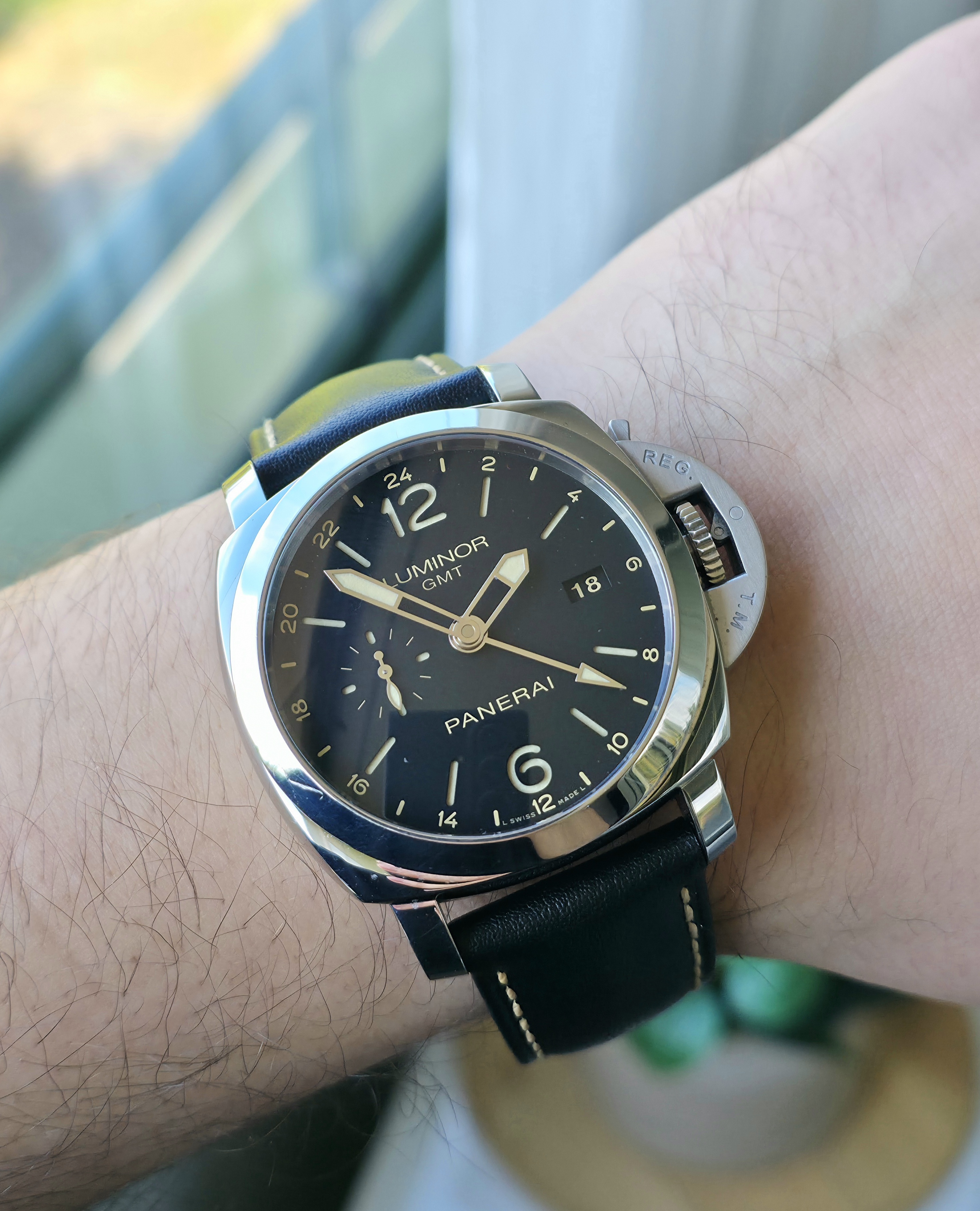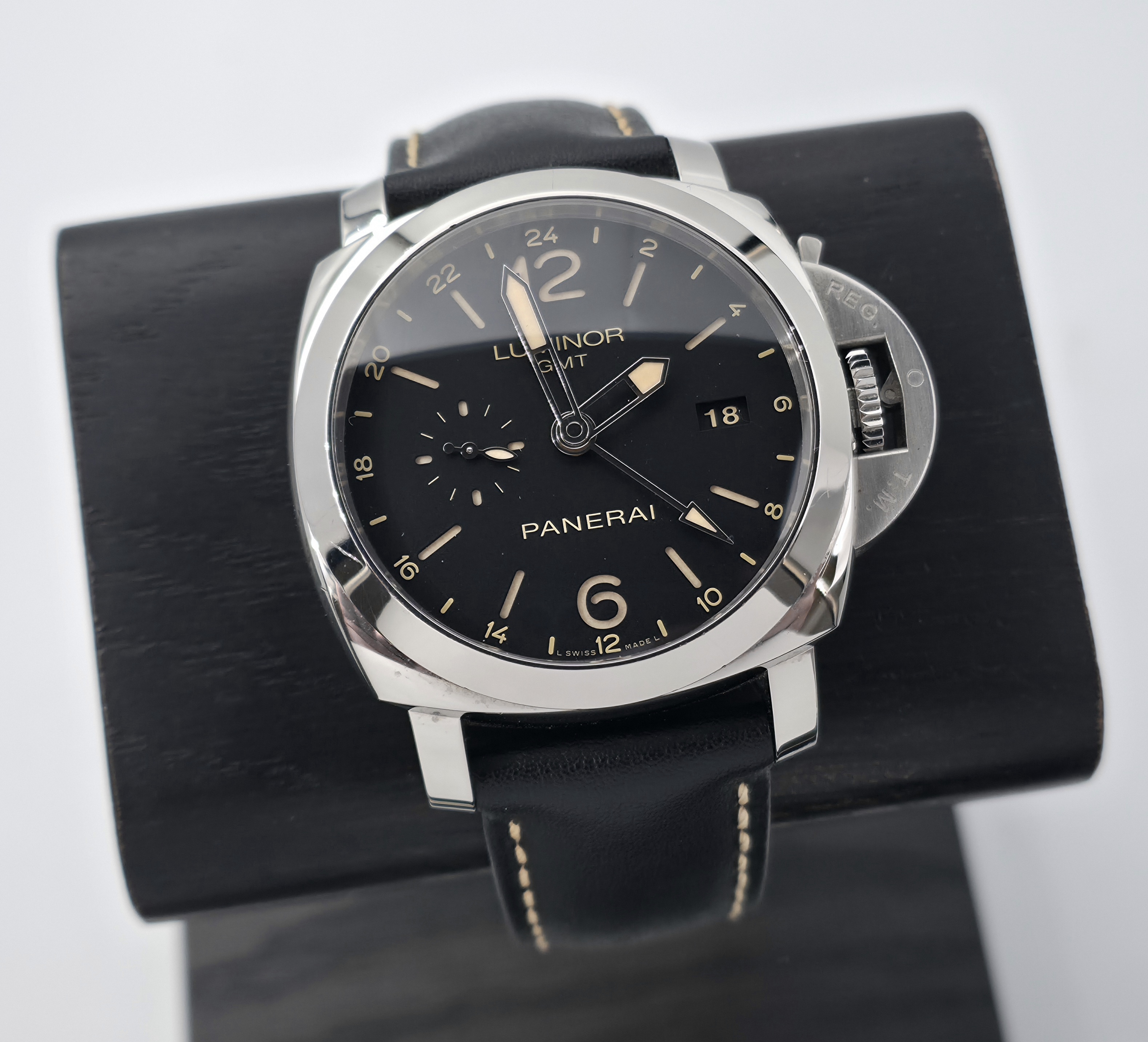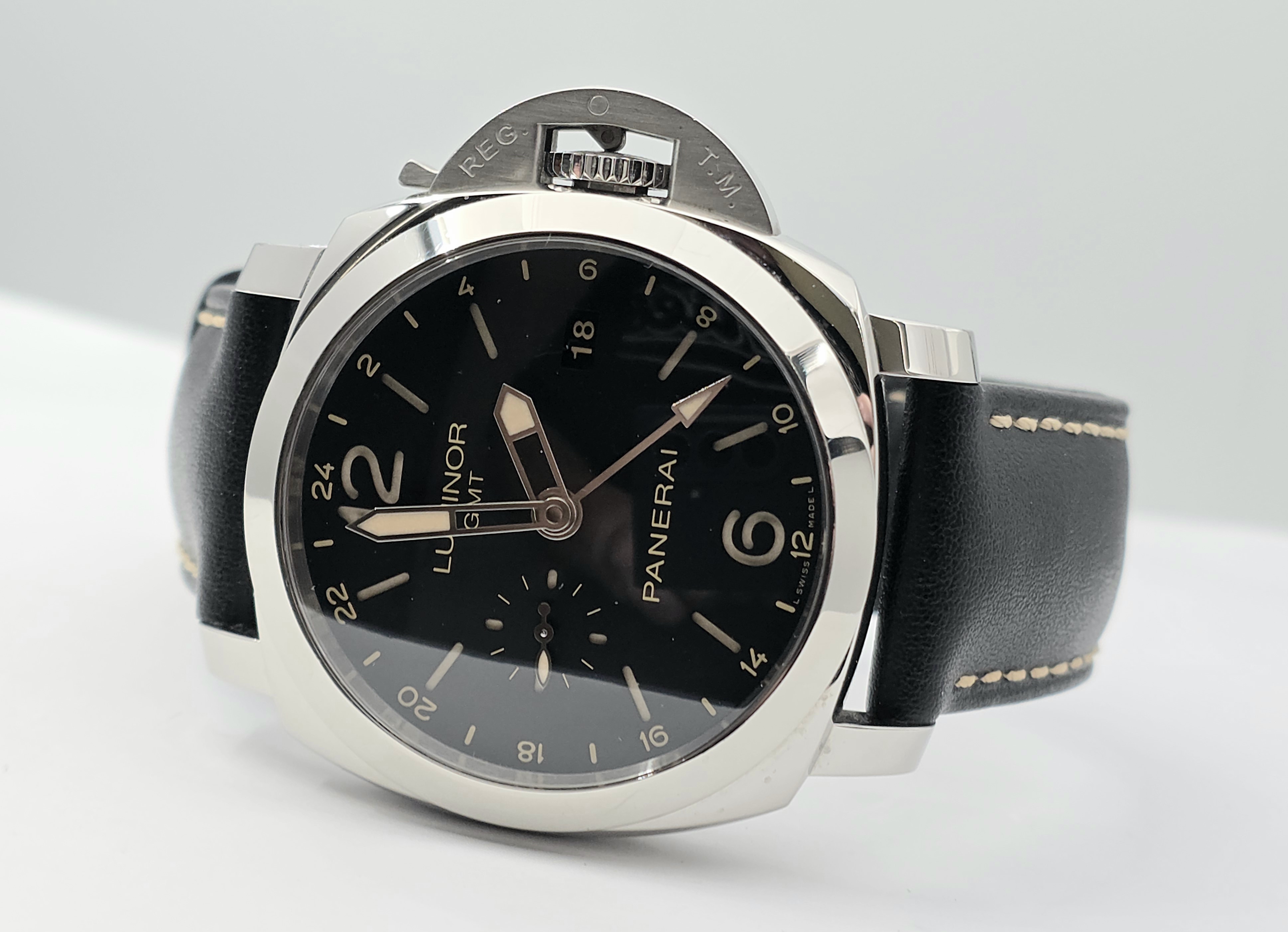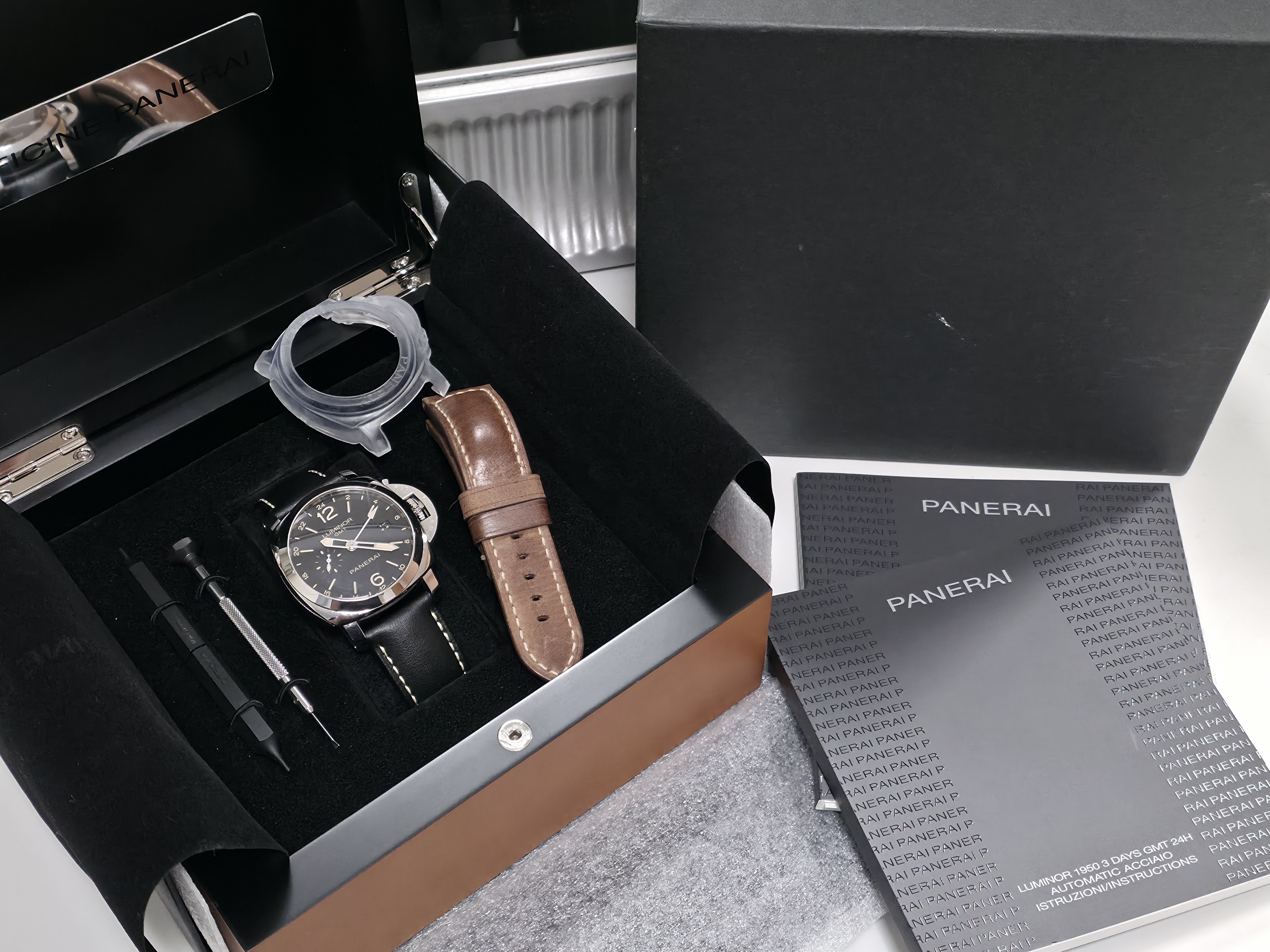 Panerai Luminor Marina 1950 GMT 44mm. Tämä harvinaisempi PAM00531 -malli tarjoaa mm. 44mm rungon, P.9003 automaattikoneiston, Gmt.n, 300 metrin vesitiiviyden, sandwich kellotaulun päivyrillä ja erinomaisella lumella, rannekkeen pikavaihtopainikkeet sekä koneiston puolelta näkyvän käyntivara-indikaattorin. Kellossa on ainoastaan tavanomaista, kevyttä käytönjälkeä. Huoltohistoriasta ei ole dokumentaatiota, mutta käynti on tarkka ja kello toimii kaikin puolin moitteettomasti. Fullset 04/2015. Mukana alkuperäisen mustan nahkarannekkeen lisäksi laadukas ja kelloon erinomaisesti soveltuva ruskea nahkaranneke.