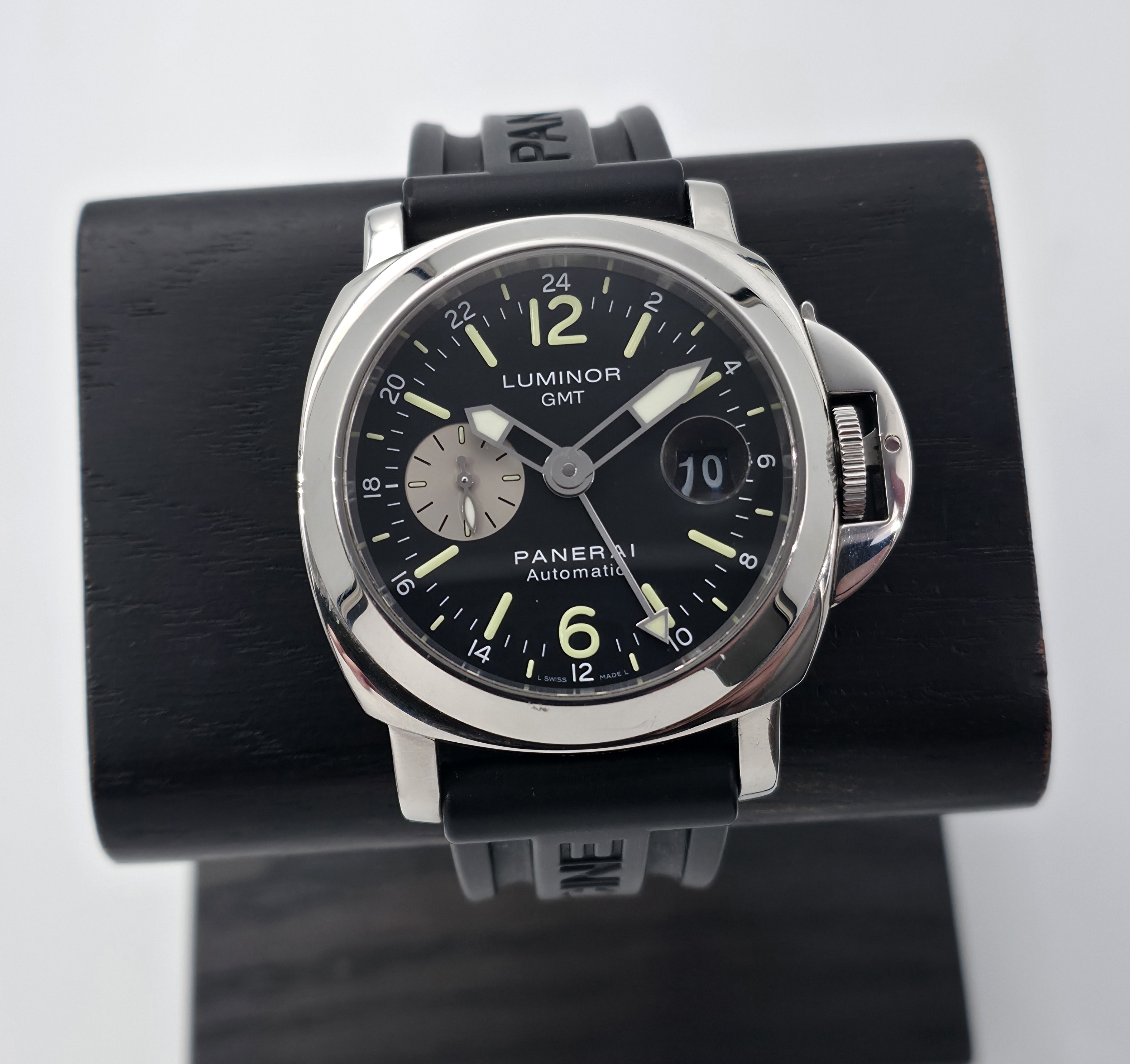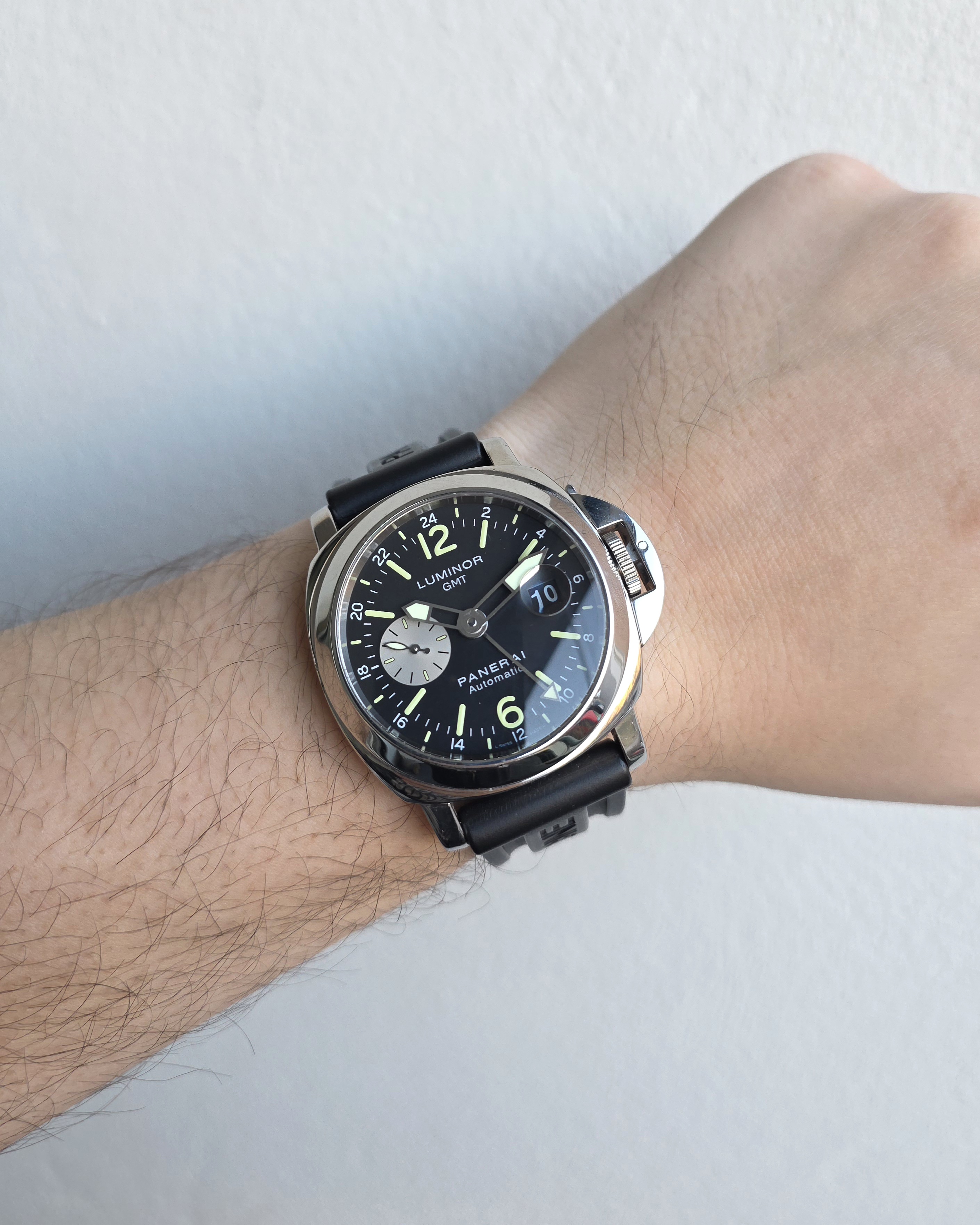 Hieno ja haluttu automaatti Luminor 44mm GMT, PAM00088. Boksit, paperit ja huoltokuitti 10/2023. Panerain nahka- ja kumirannekkeet + tarvikenahka. Kello on ikäisekseen siistissä kunnossa. Käynti erinomainen. Ominaisuuksina mm. GMT, päivyri, 300 wr ja loistava vahva lume. Tästä haluttu GMT Luminor hyvällä setillä.