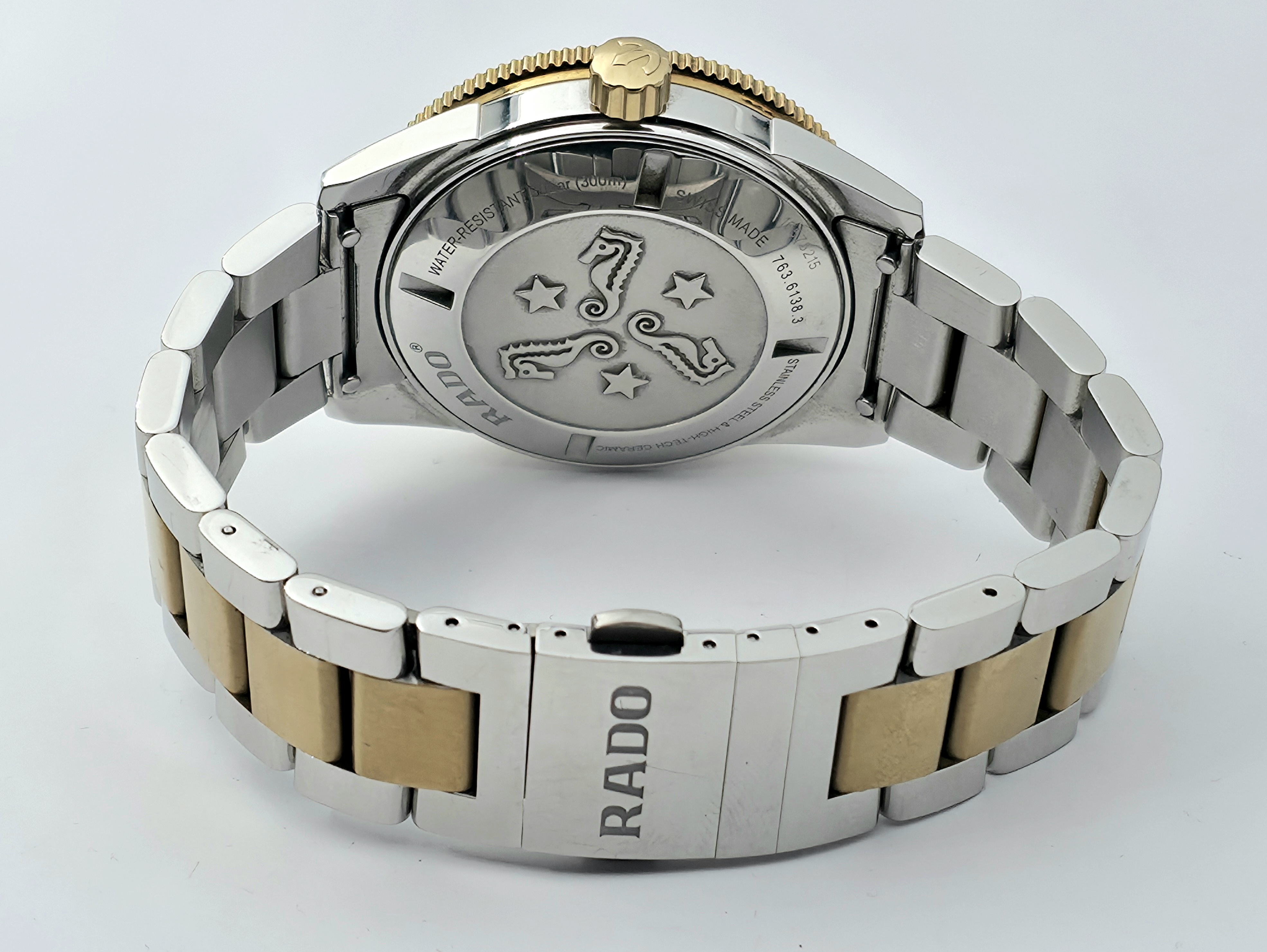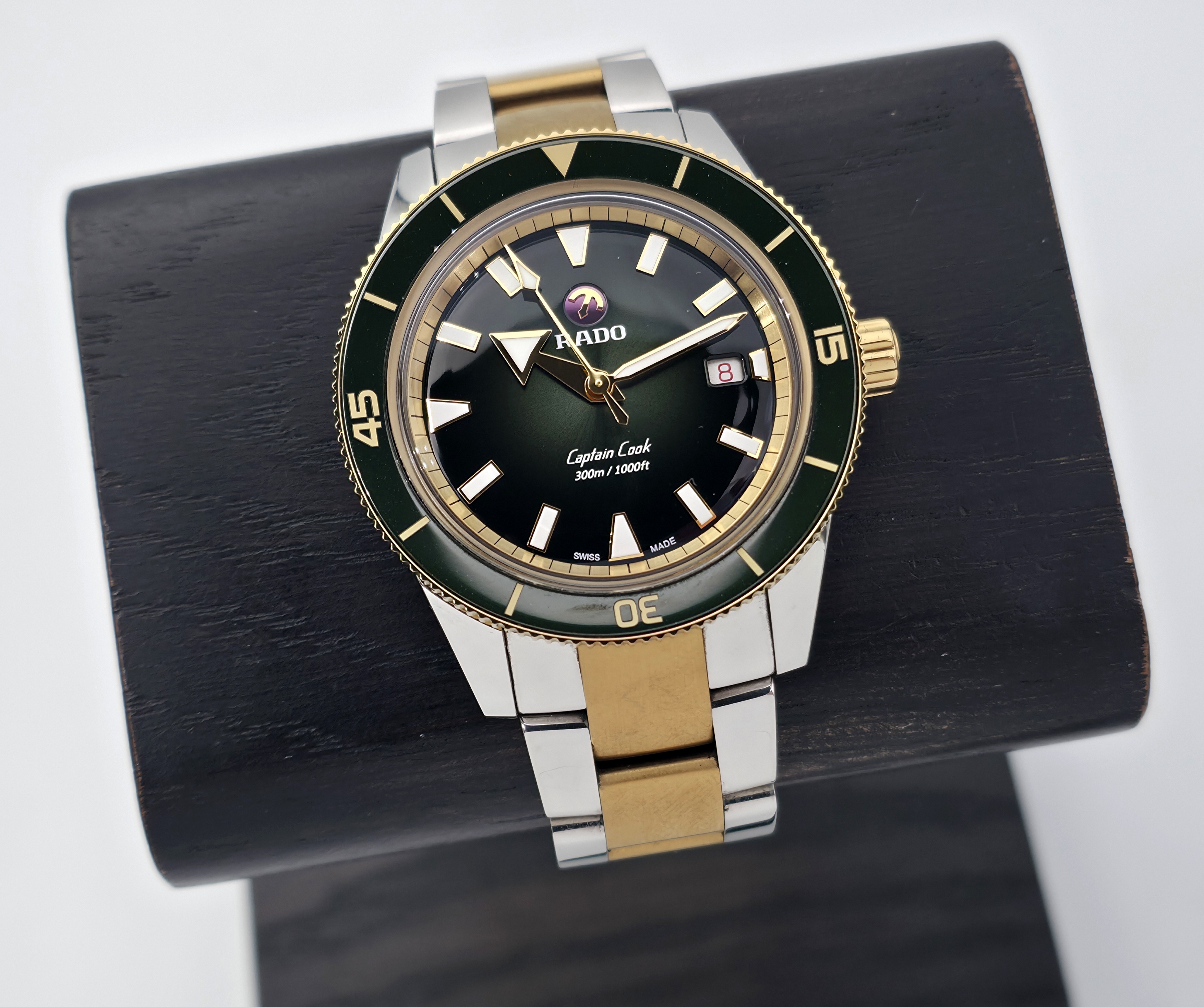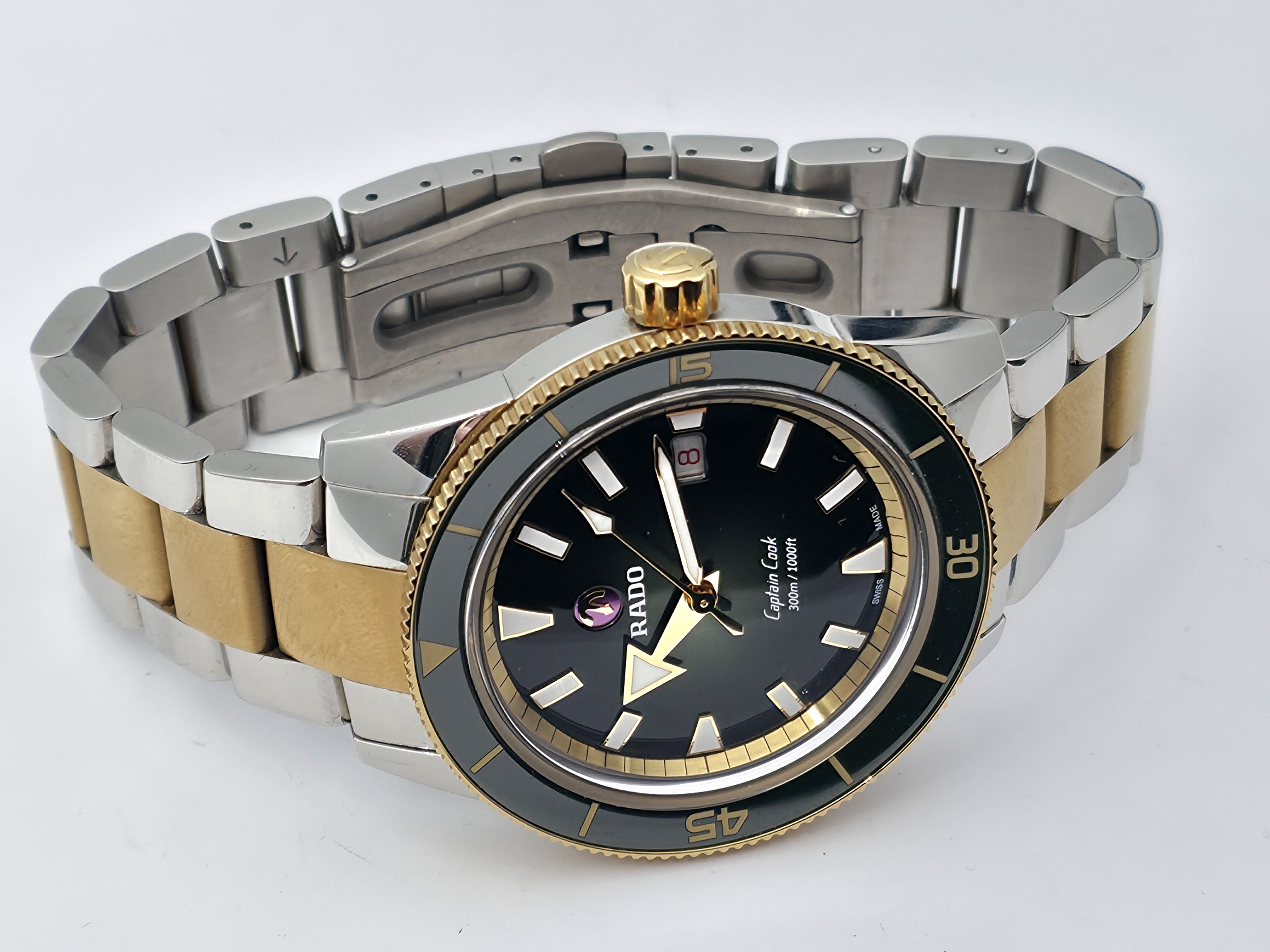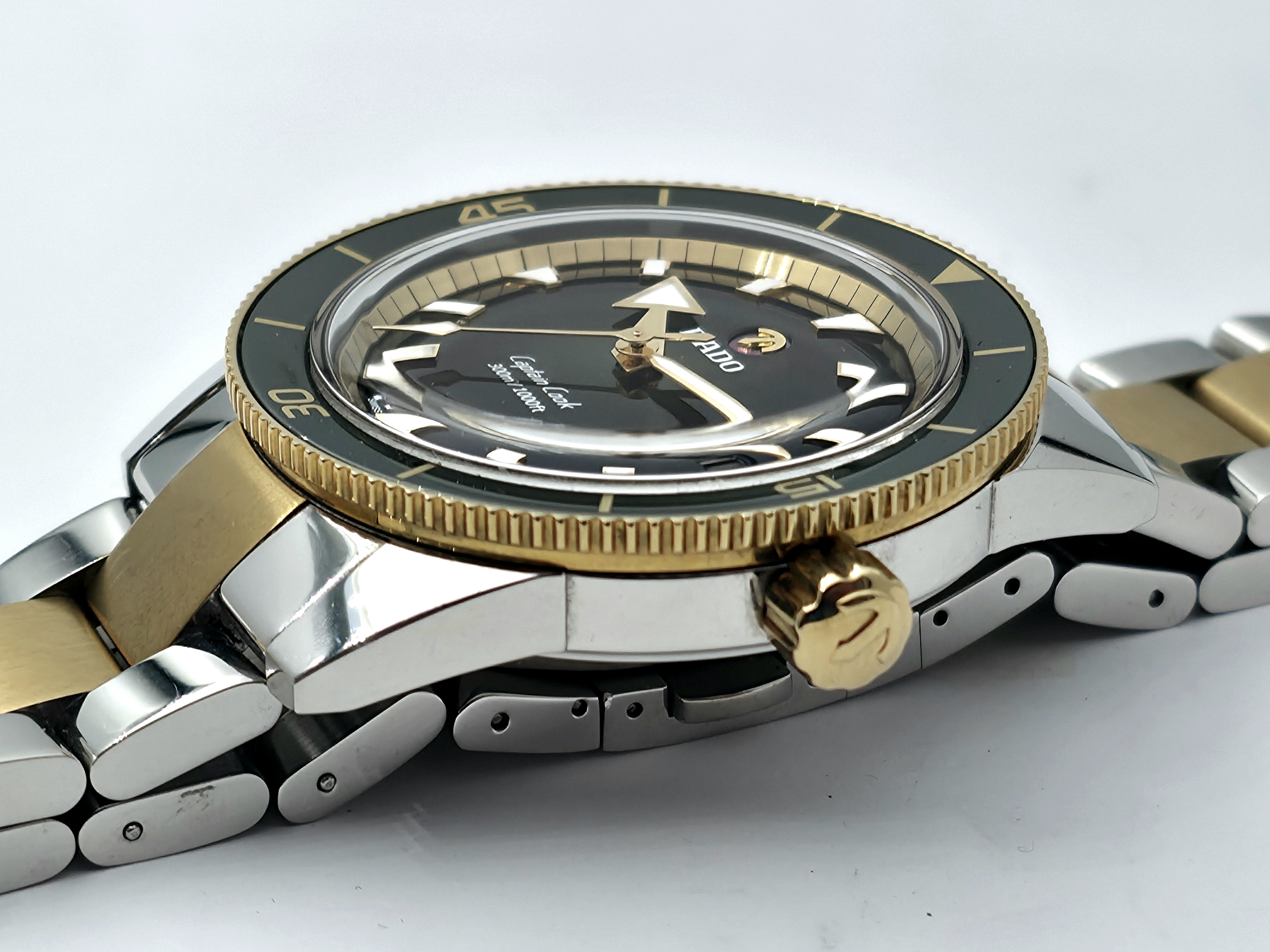 Mieletöntä hinta-laatua tarjoava Rado Captain Cook -diveri. Näyttävä teräs/kullanvärinen malli vihreällä sunburst-taululla ja keraamisella bezelillä. Käynnistä vastaa 80h käyntivaralla oleva automaattikoneisto. Fullset 08/2023. Siistissä kunnossa ja hyvin tarkkaan käyvä yksilö. Ovh. 2750e.
