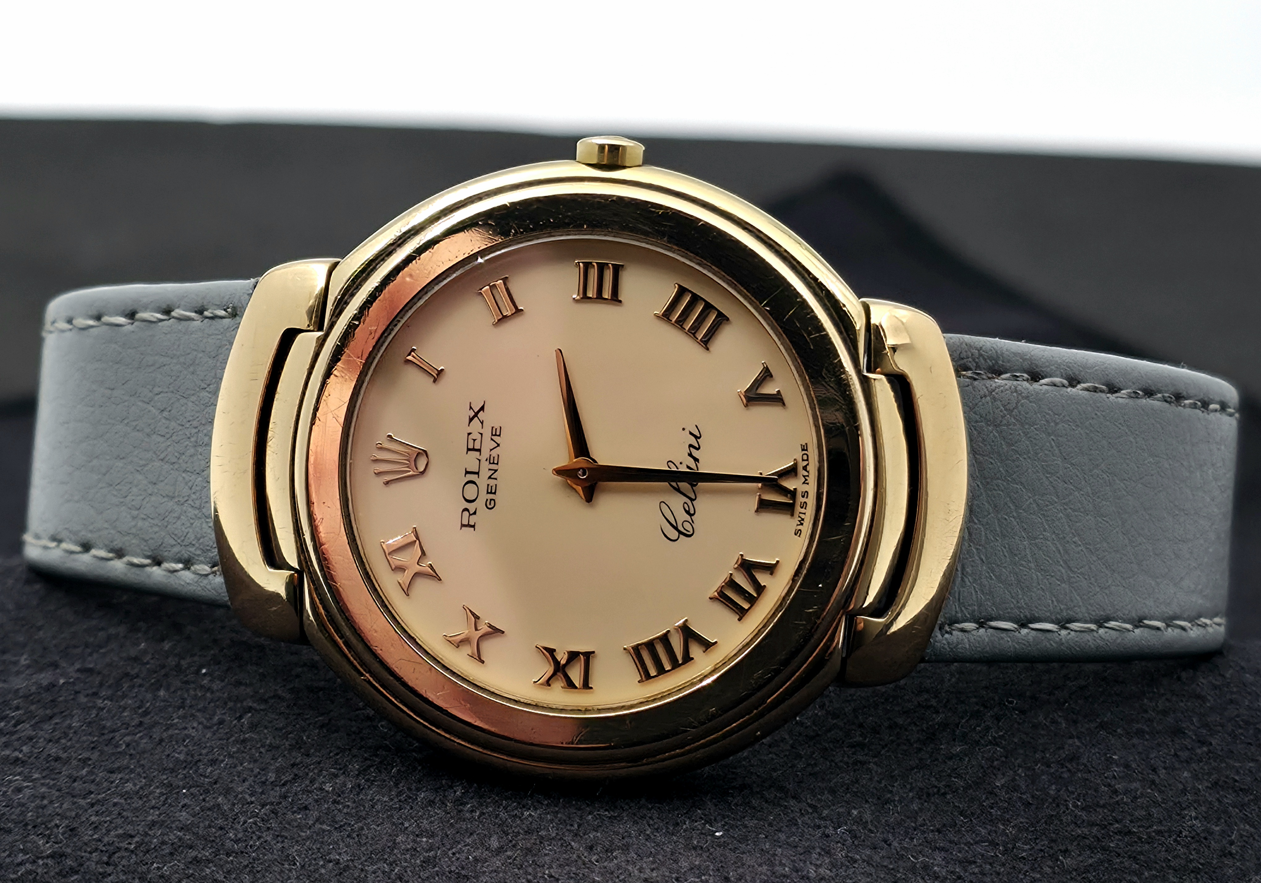 Tyylikäs ja klassinen Rolex Cellini 18k täyskultaisena. Hillitty ja elegantti design, pelkistetty taulu ja siro kuori tekevät kokonaisuudesta arvokkaan ja ajattoman. Sarjanumeron perusteella vuodelta 1994 oleva yksilö. Nahkaranneke ei ole alkuperäinen. Bruttopaino 71.8g. Tästä tyylikäs kultainen Rolex!