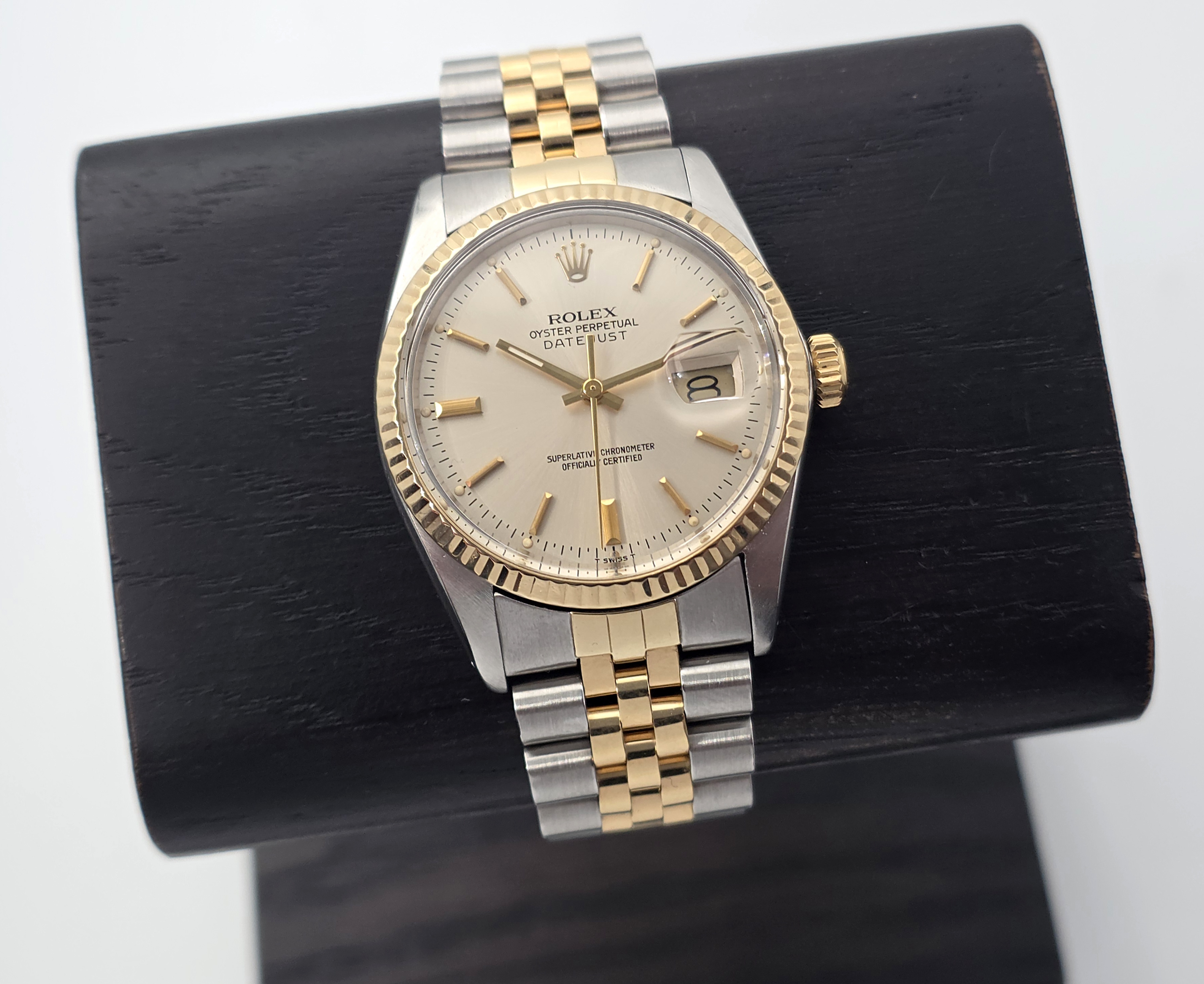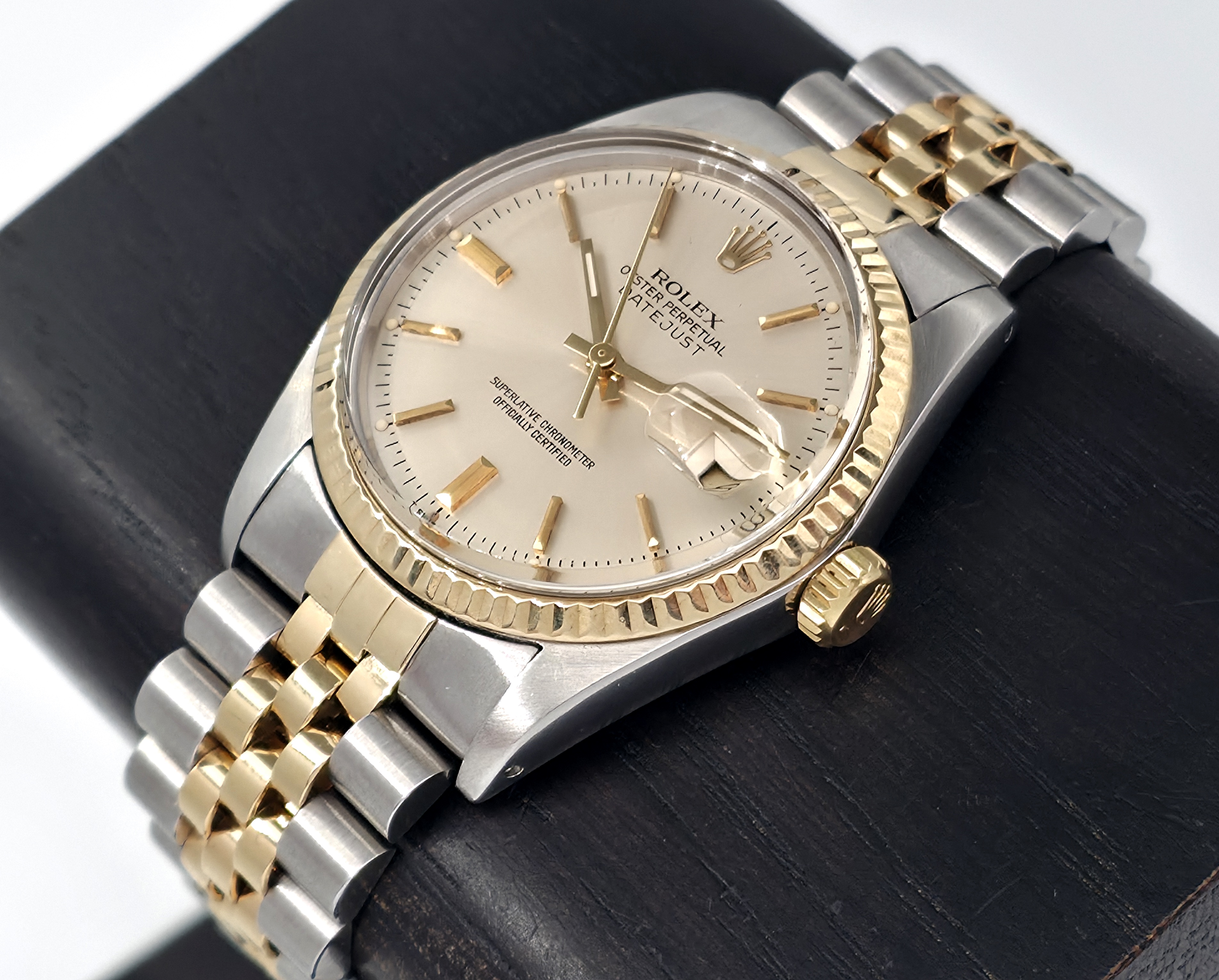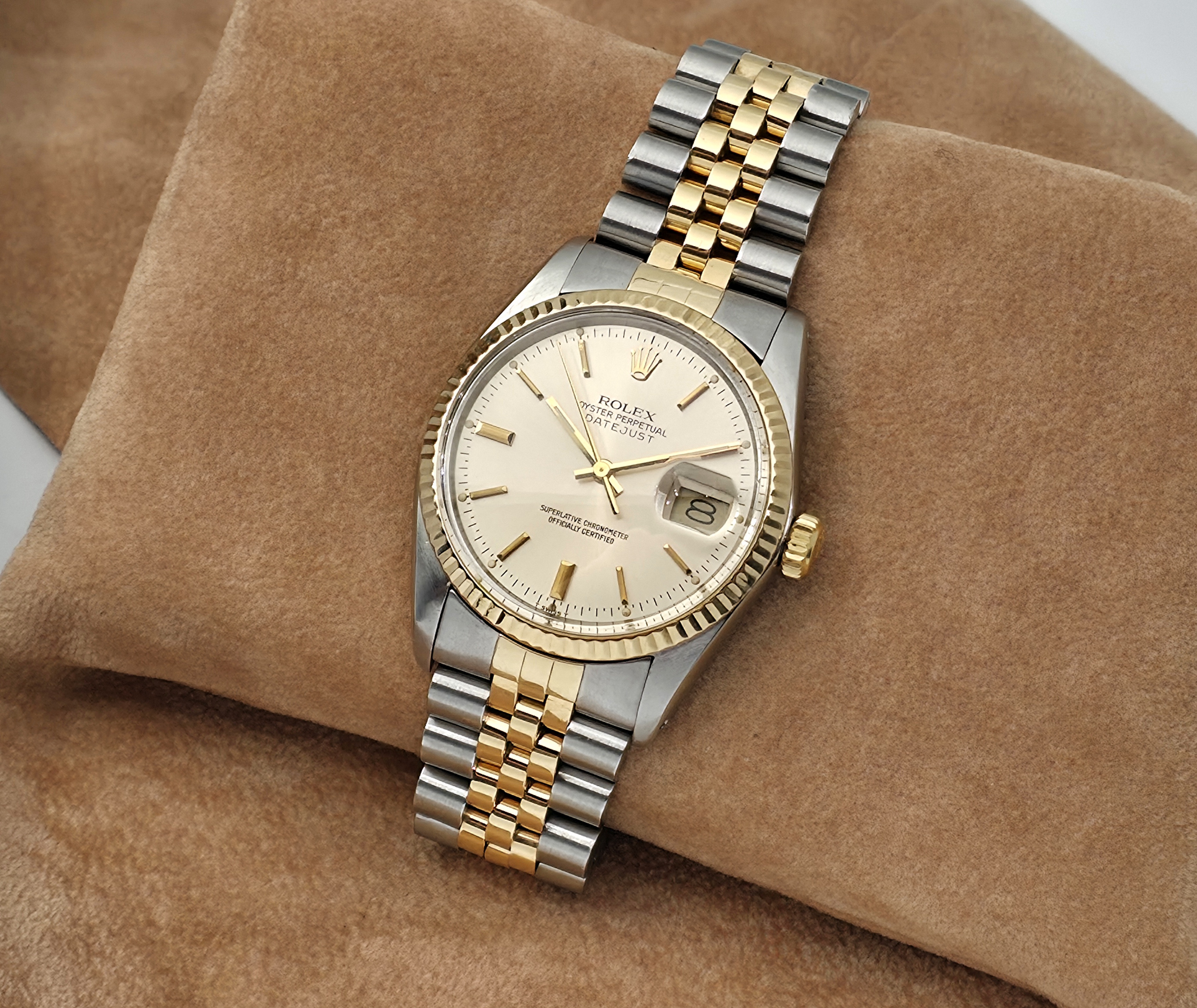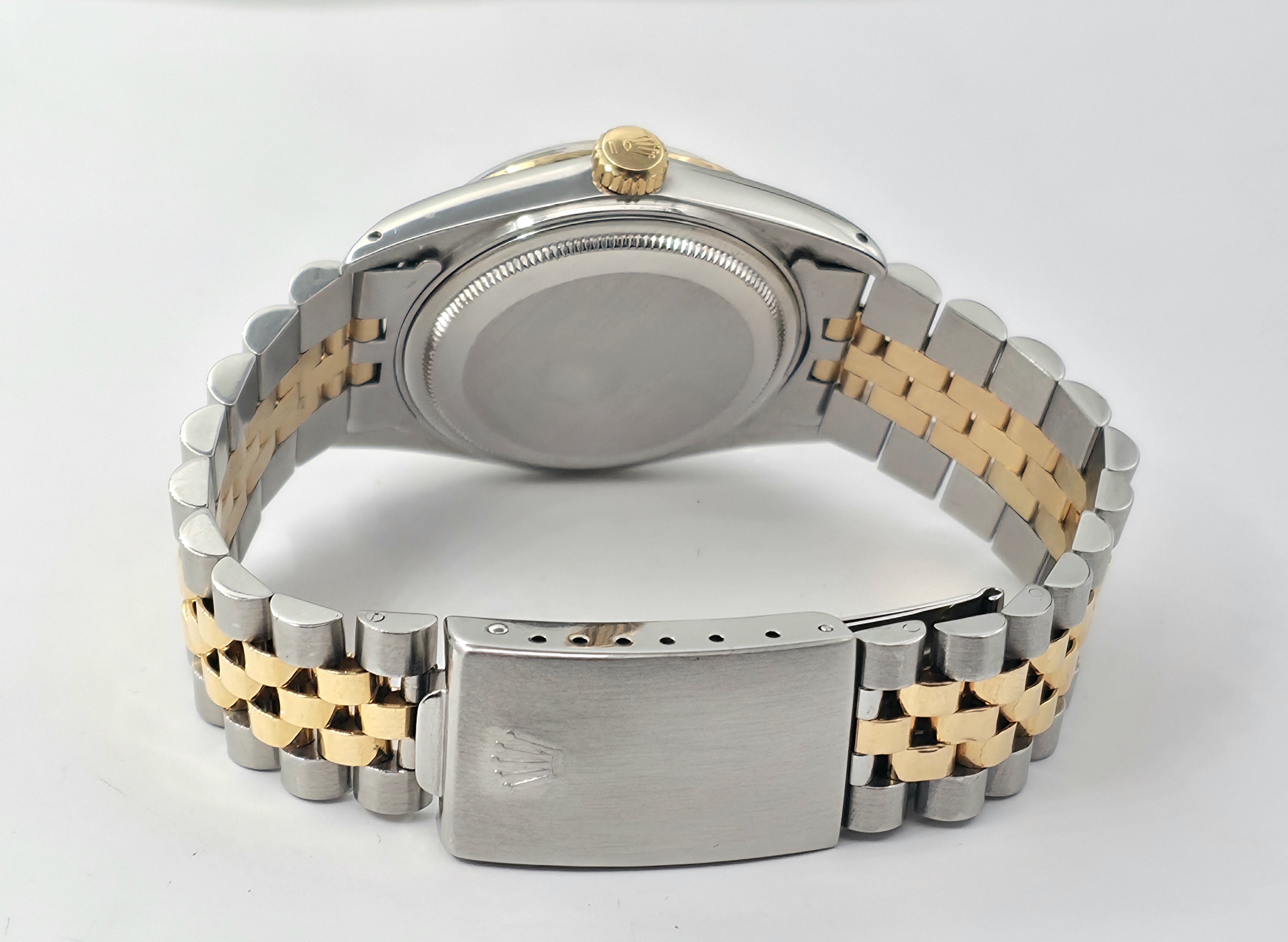 Klassinen, teräs/kultainen Rolex Datejust 36. Mukana alkuperäinen laatikko sekä dokumentaatio koneiston huollosta (08/2025) ja rannekkeen huollosta (04/2025). Sarjanumeron perusteella kello on vuodelta 1979. Tämä on varmasti yksi kellomaailman ikonisimmista malleista.