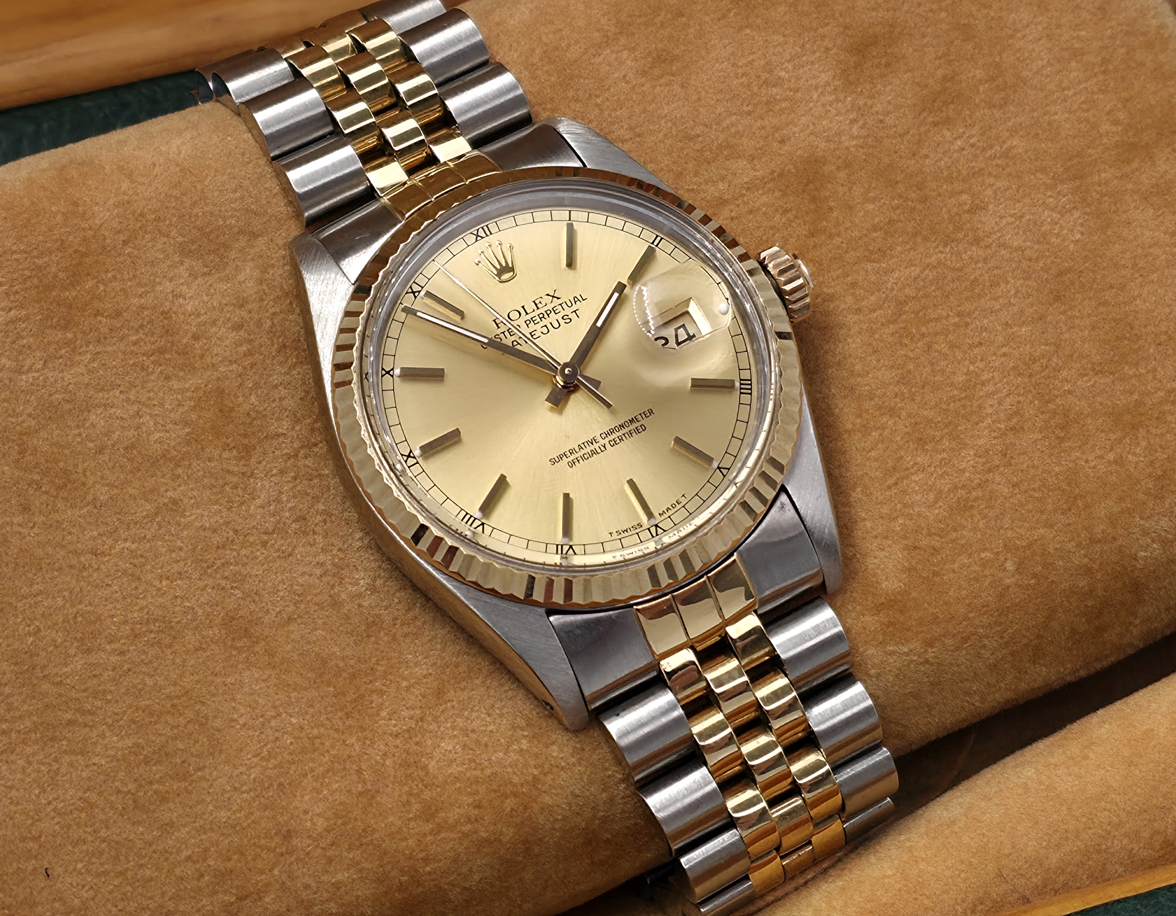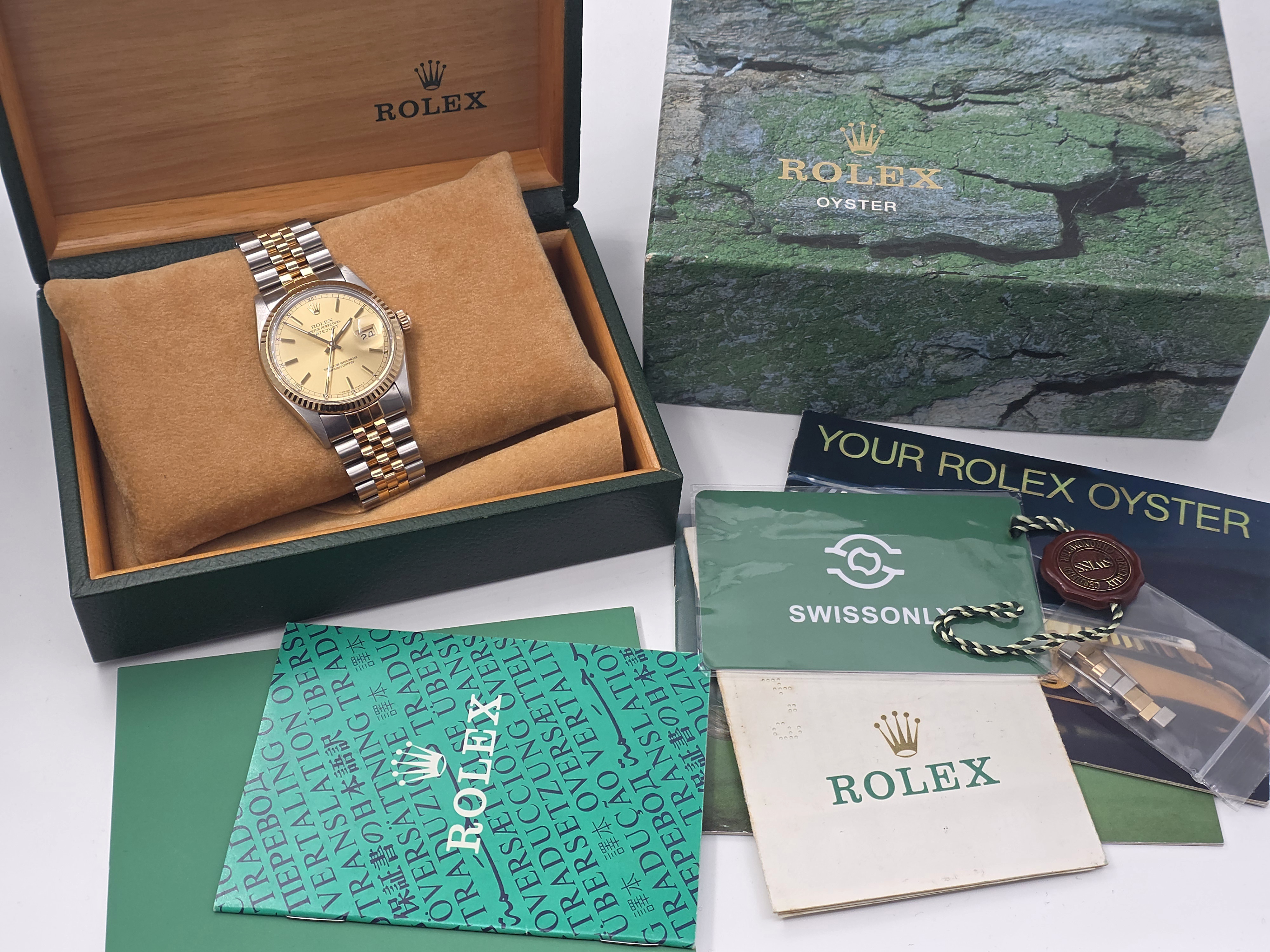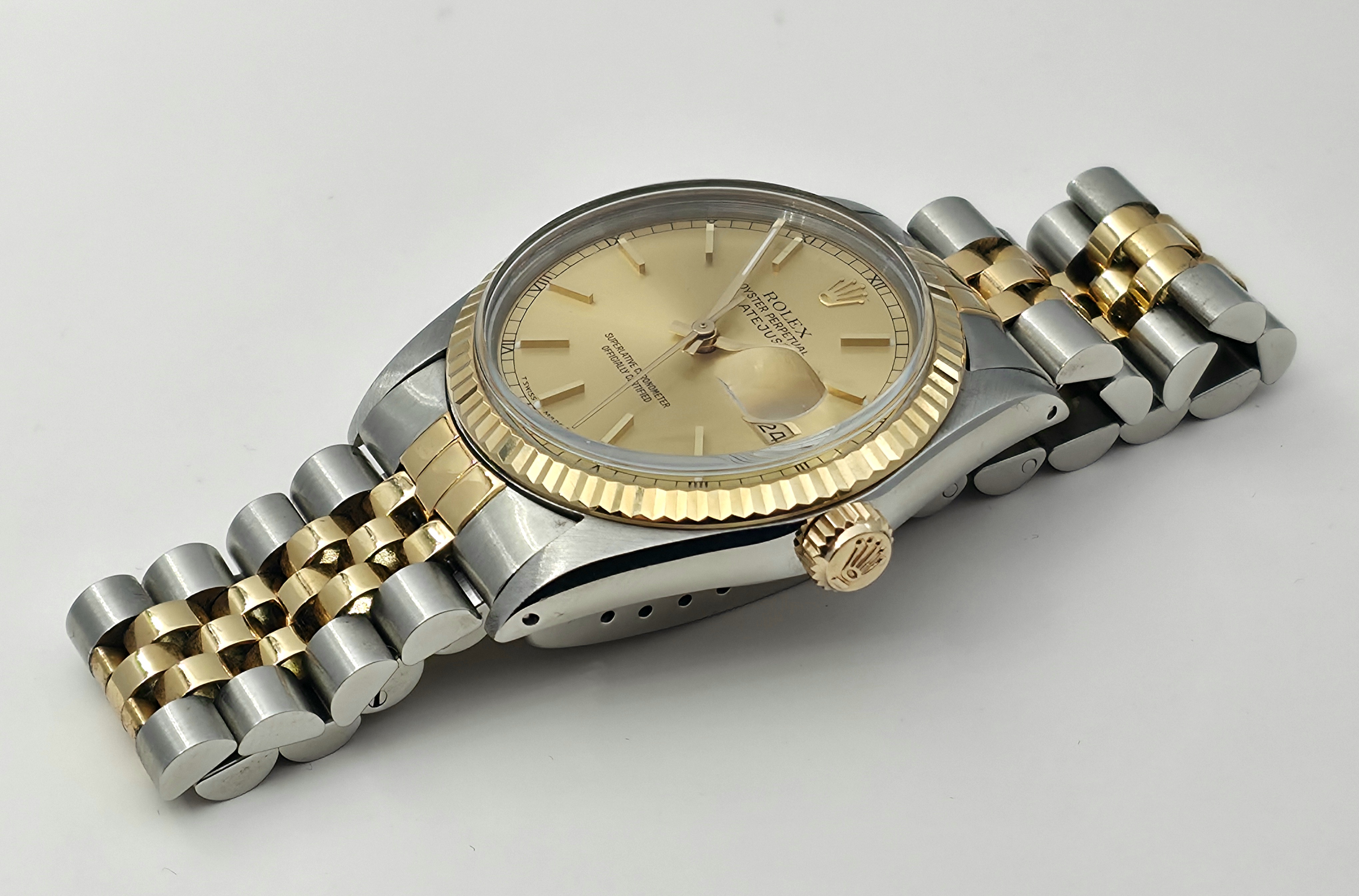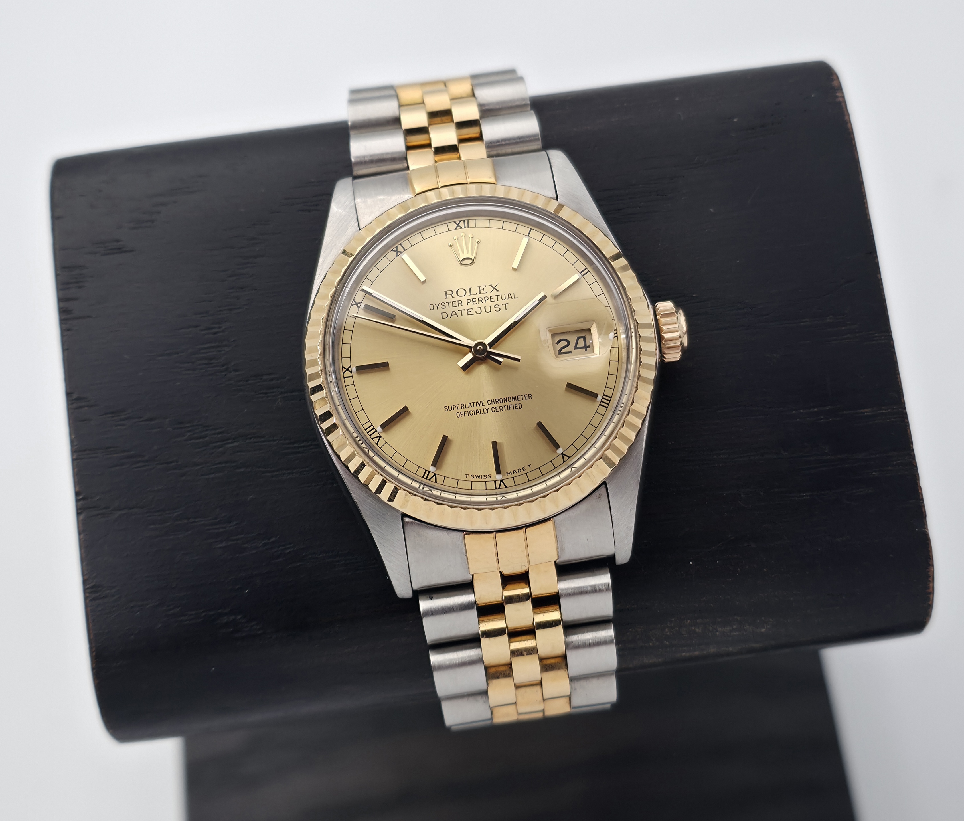 Klassikkojen klassikko! Rolex Datejust 36mm. Erinomaisessa kunnossa oleva fullset (04/1988). Käynti on tarkka, käyntiraportti mukaan. Ranneke on jämäkkä, ja kuori sekä bezel ovat moitteettomassa kunnossa. Tästä yksi kellomaailman ikonisimmista malleista!