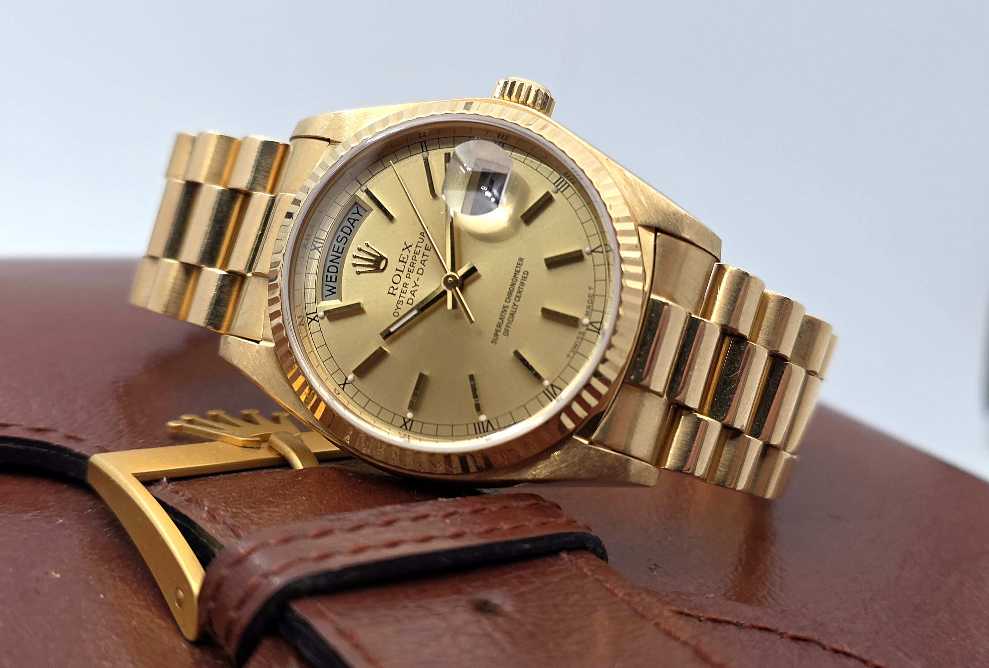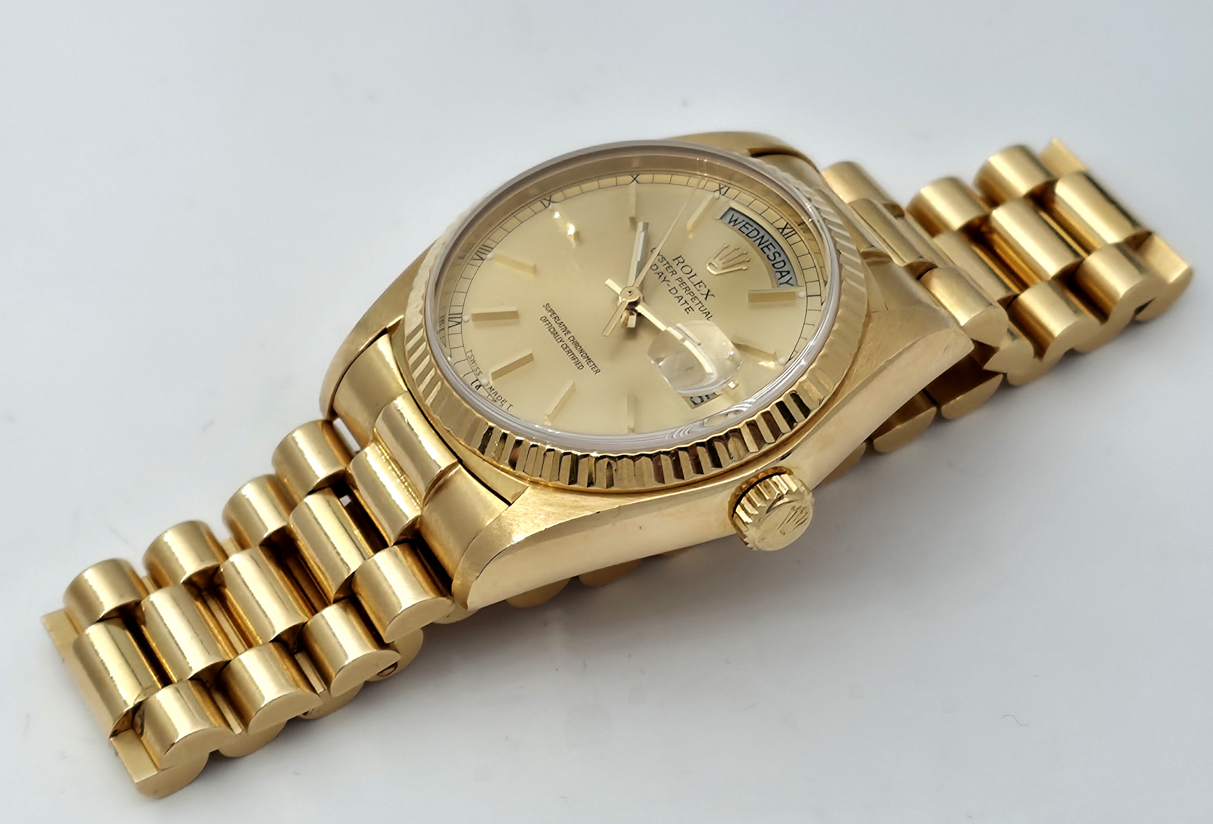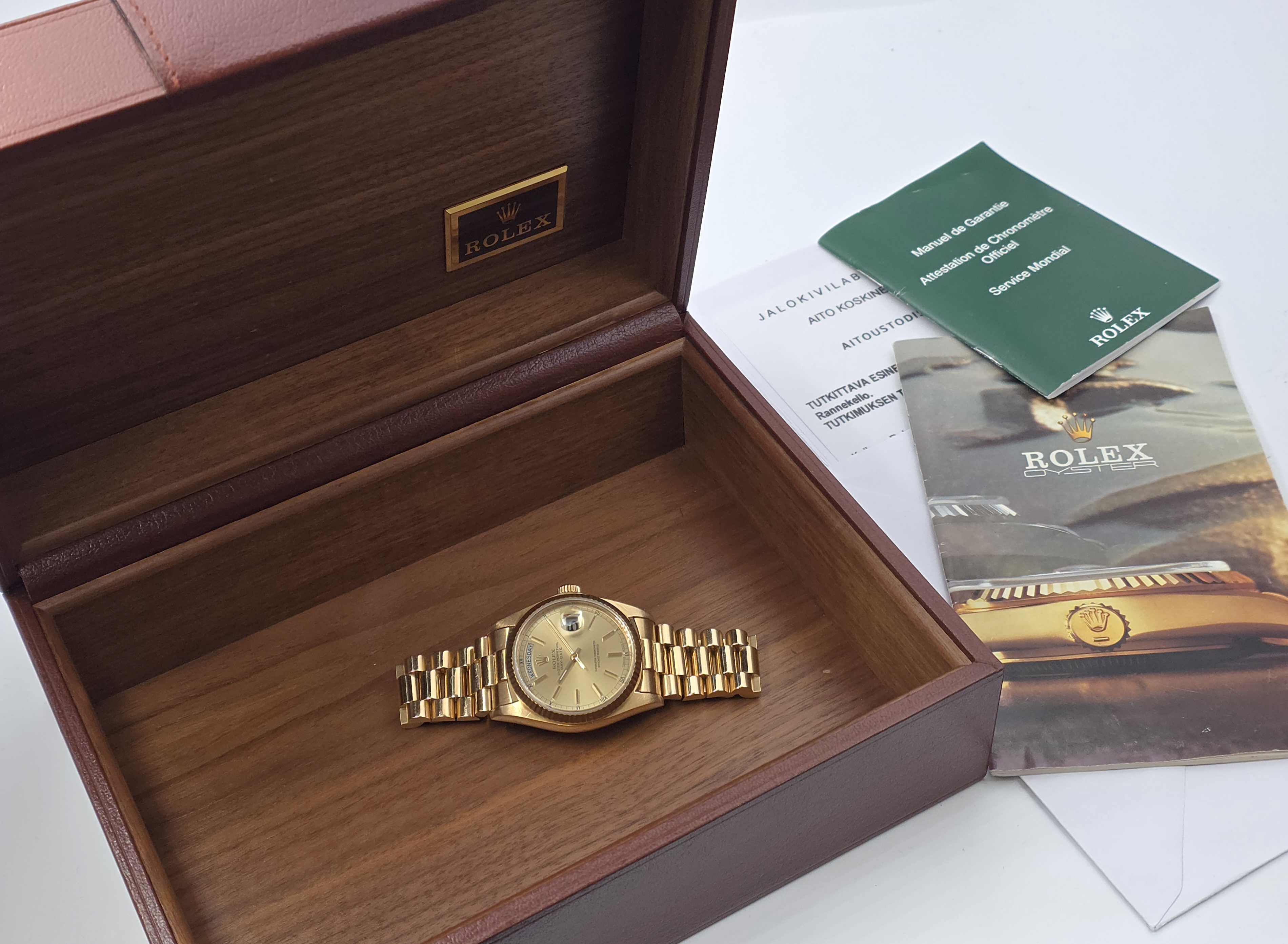 Tarjolla on upea 18k kultainen 36mm Day-Date -kello samppanjataululla. Sarjanumeron perusteella kello on vuodelta 1979. Mukana alkuperäinen laatikko ja aitoustodistus (Aito Koskinen). Kello on ikäisekseen erittäin hyvässä kunnossa. Rannekkeessa ei ole merkittävää venymää, ja se sopii noin 19.5 cm ranteeseen. Tästä ikoninen kultakellojen kuningas!