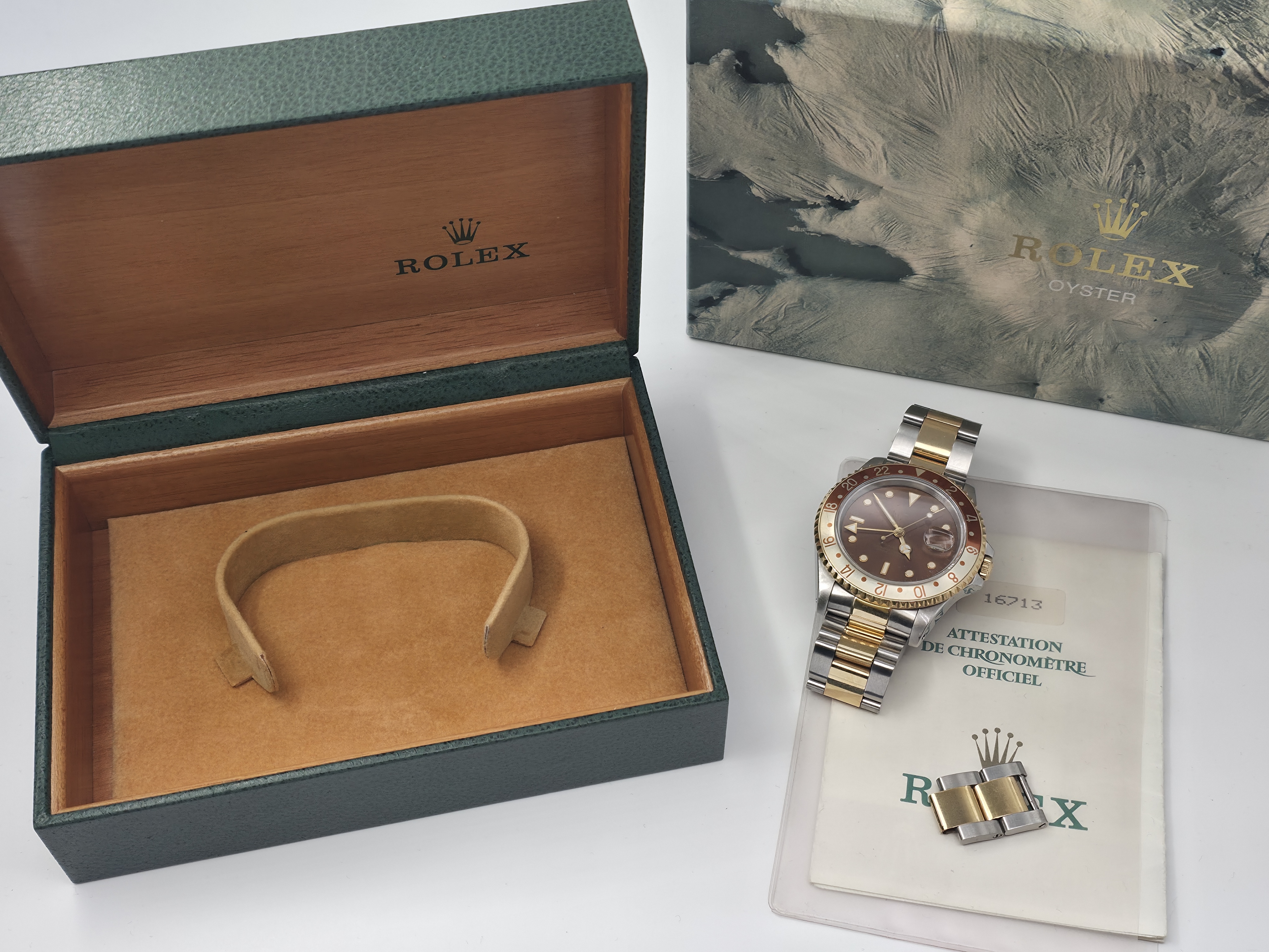 Rolex GMT-Master II "Root Beer". Eleganssi teräs/kultainen malli, upealla ruskealla sunburst-taululla. Erittäin hieno setti, alkuperäisillä 08/1991 leimatuilla Lindroosin papereilla. Käy erinomaisesti, huolloista ei ole dokumentteja. Tästä todella upea, harvinaisempi Rootbeer GMT-Master.