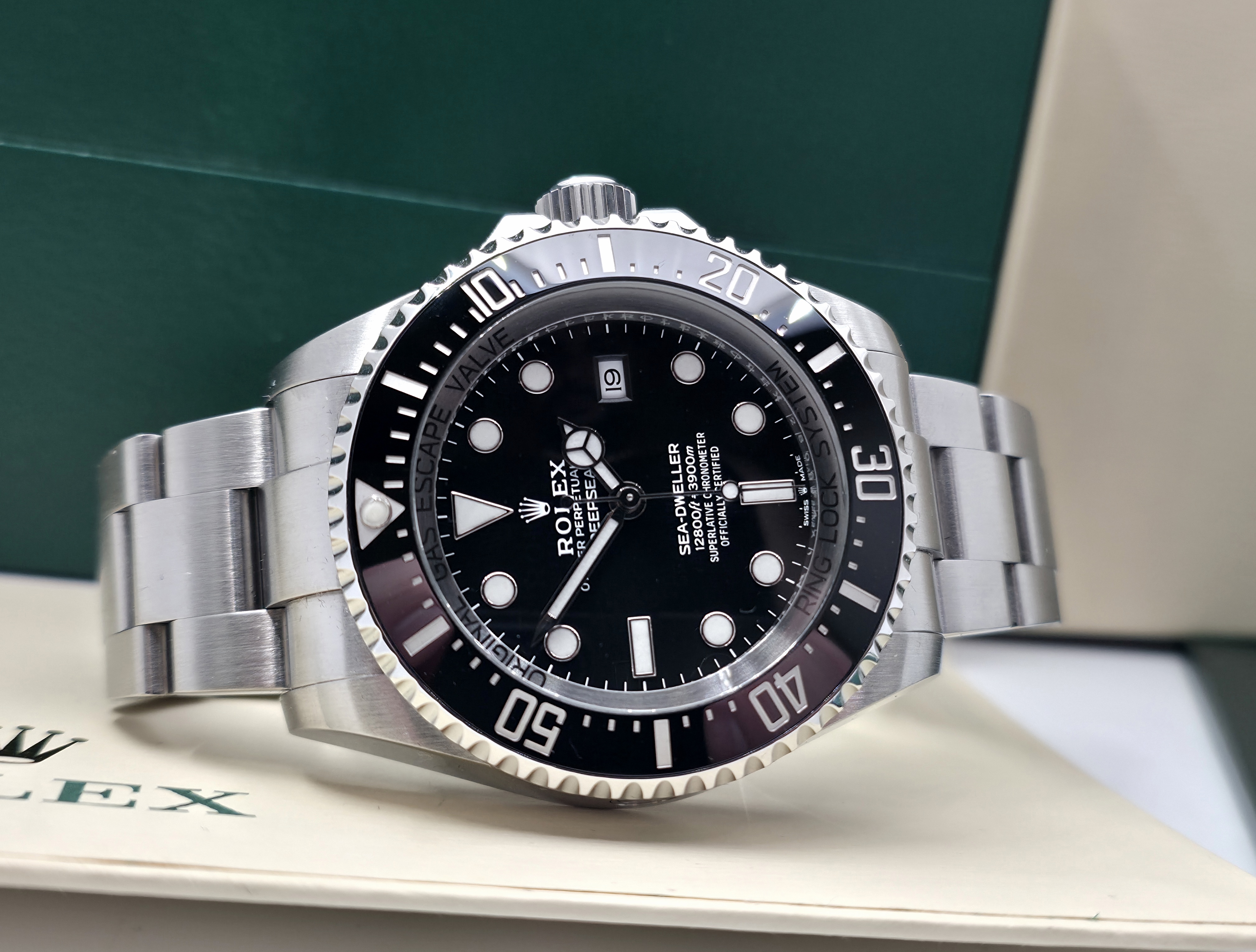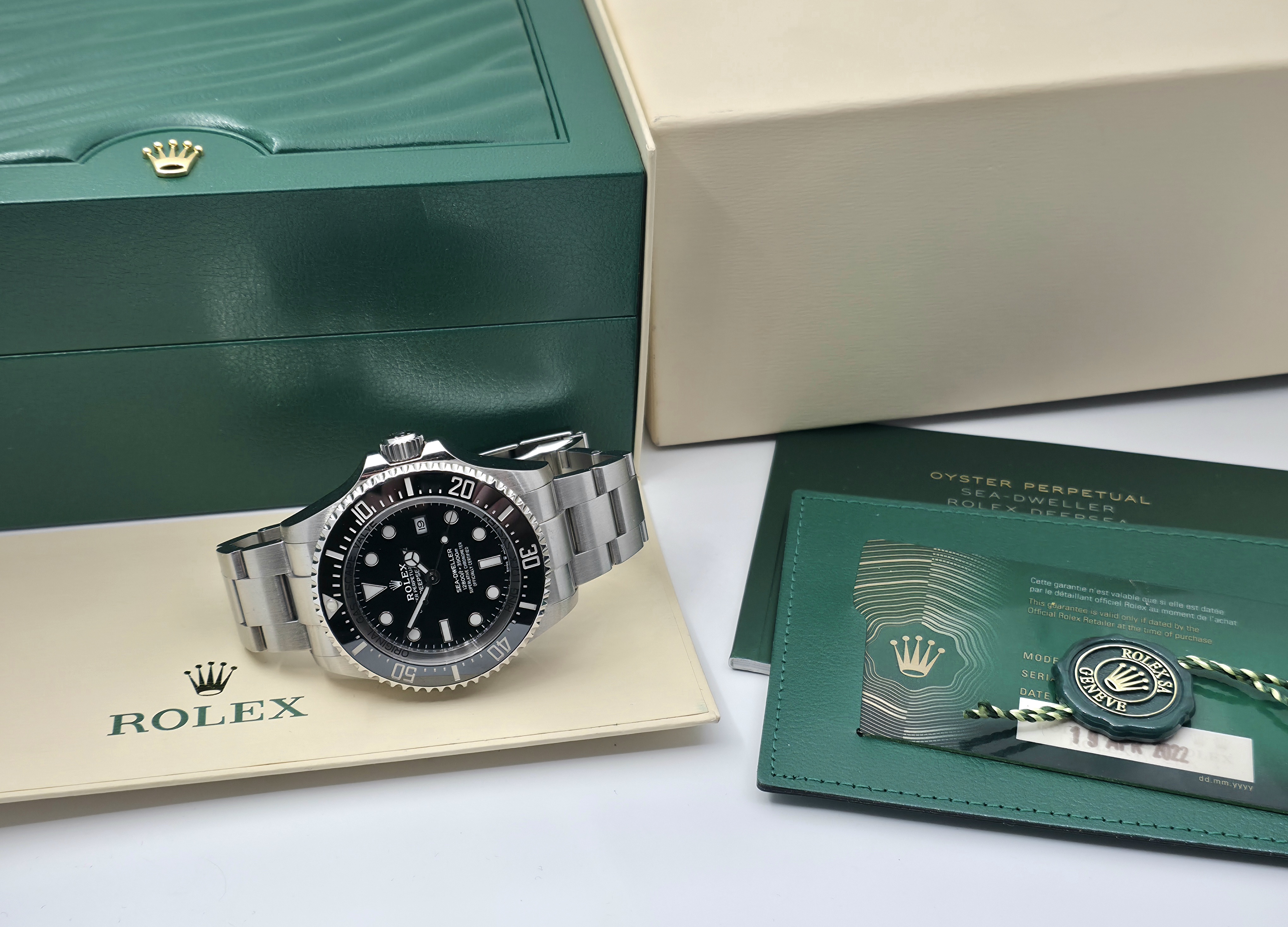 Rolexin Sea-Dweller Deepsea huippu diveri. Siistissä kunnossa oleva fullset 04/2022, Tehdastakuu 04/2027 asti. Tämä Deepsen päivitetty (126660) versio tarjoaa mm. 70 tunnin käyntivaran koneiston ja leveämmän rannekkeen, mikä tekee kellosta tasapainoisemman ja mukavamman ranteessa. Muita merkittäviä ominaisuuksia ovat 3900 metrin vesitiiviys, näyttävä lume ja erinomainen Glidelock-pikasäätö.