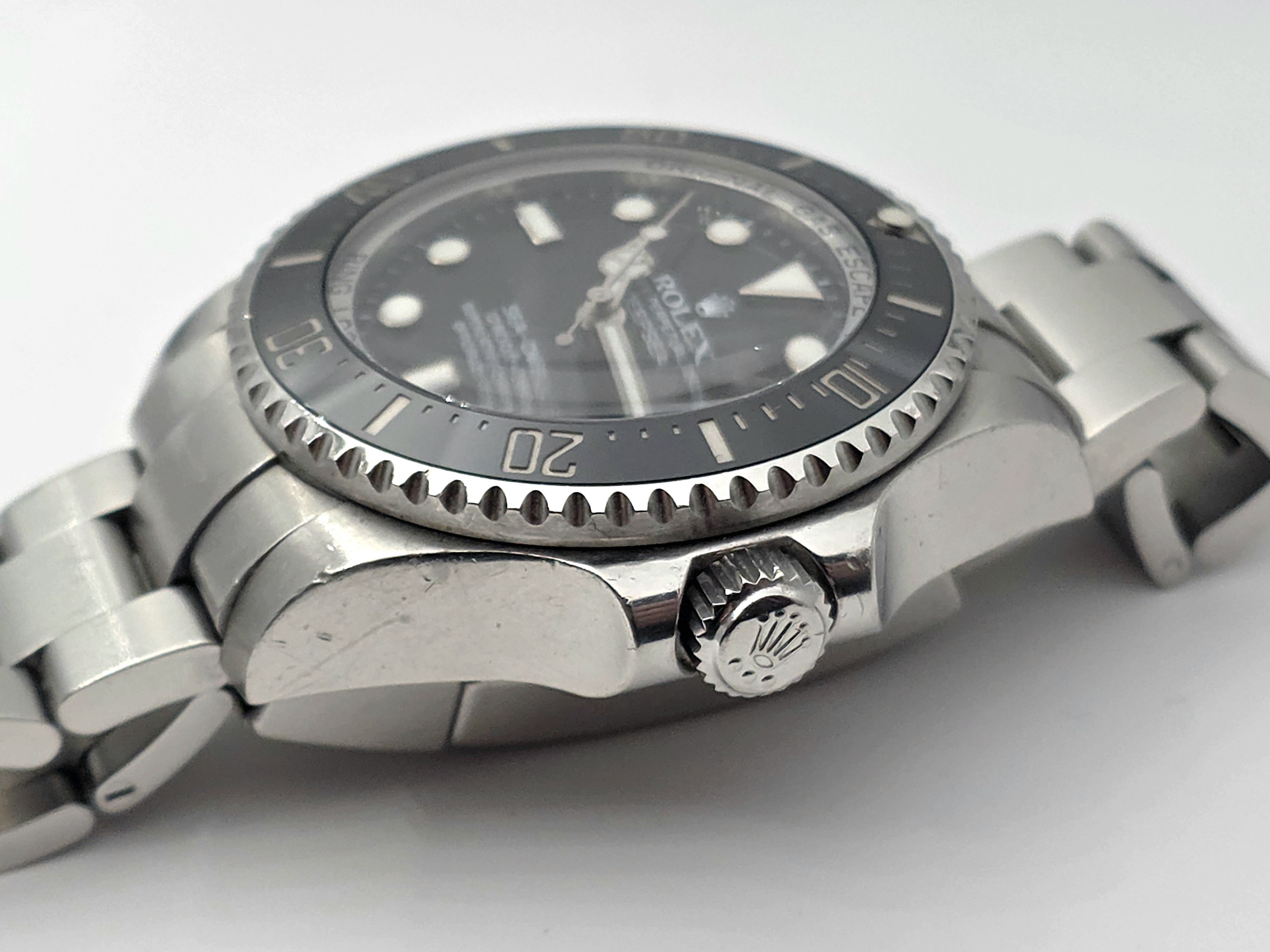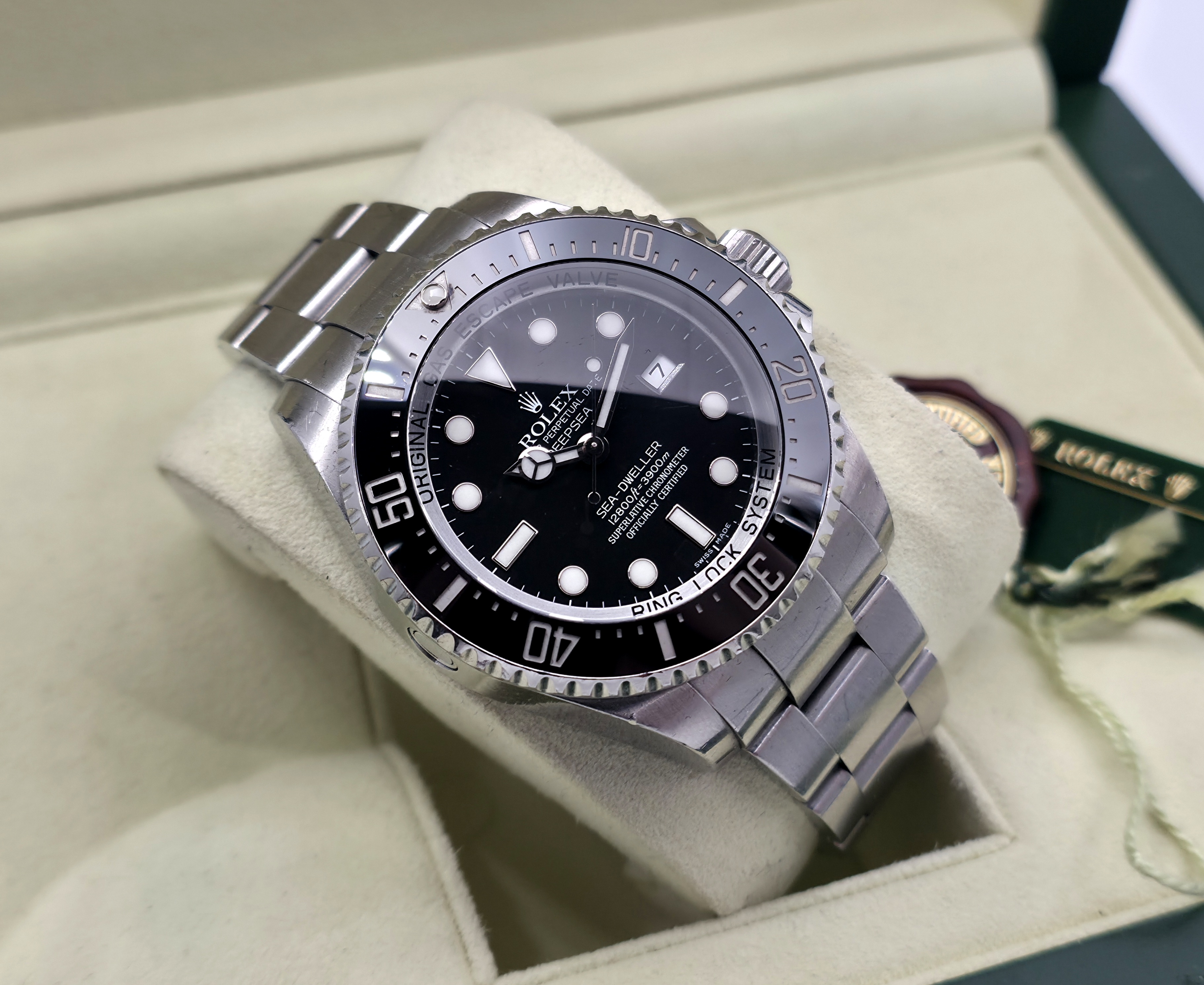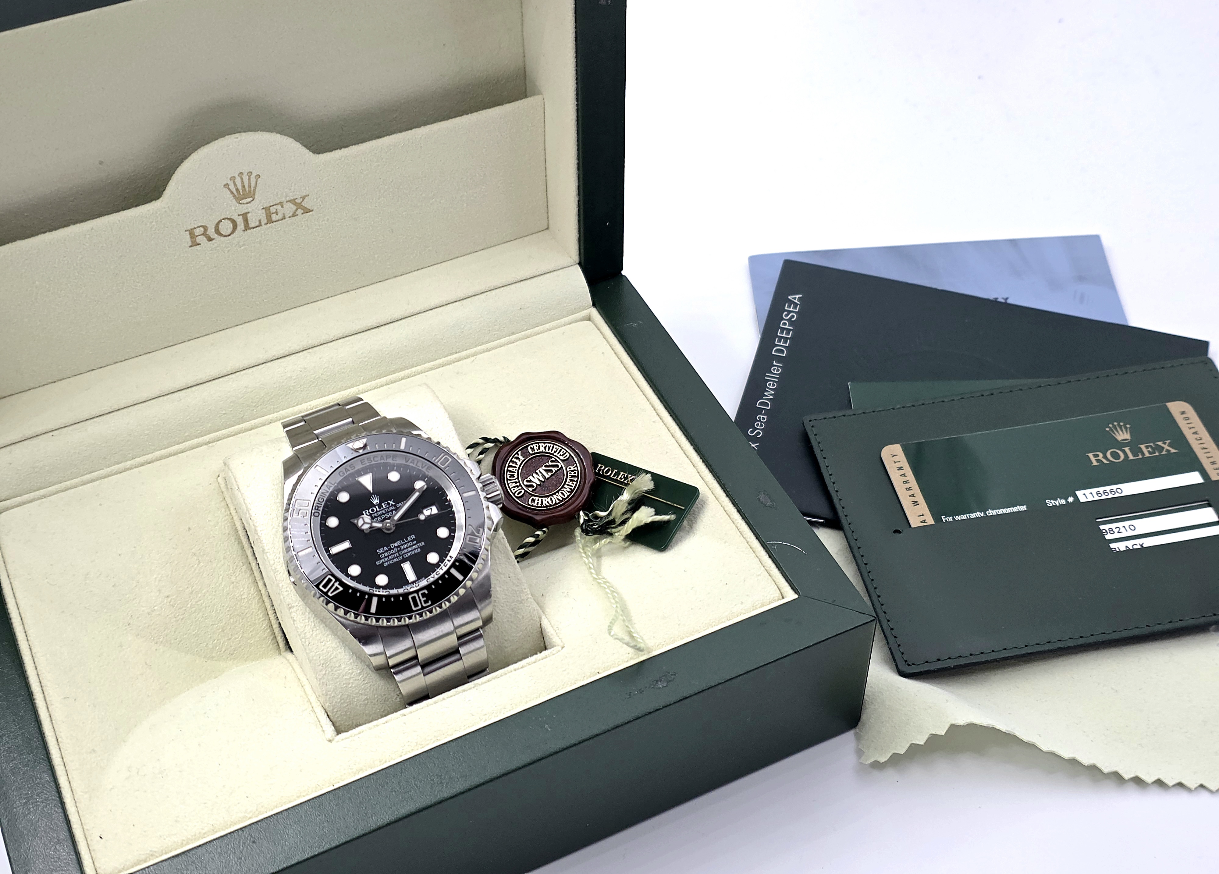 Rolexin järeä Deepsea. Mukaan boksi, manuaali, tagi ja 2010 päivätty takuukortti. Aktiivisessa käytössä ollut ja käytönjälkeä löytyy, tämä yksilö ei ole heille jotka etsivät naarmutonta. Lasi ja bezeli tosi siistit, käynti erinomainen. Tästä edullisesti huippuominaisuuksilla varustettu diveri, jossa mm. wr. 3900m, upea lume ja erinomainen Glidelock pikasäätö!