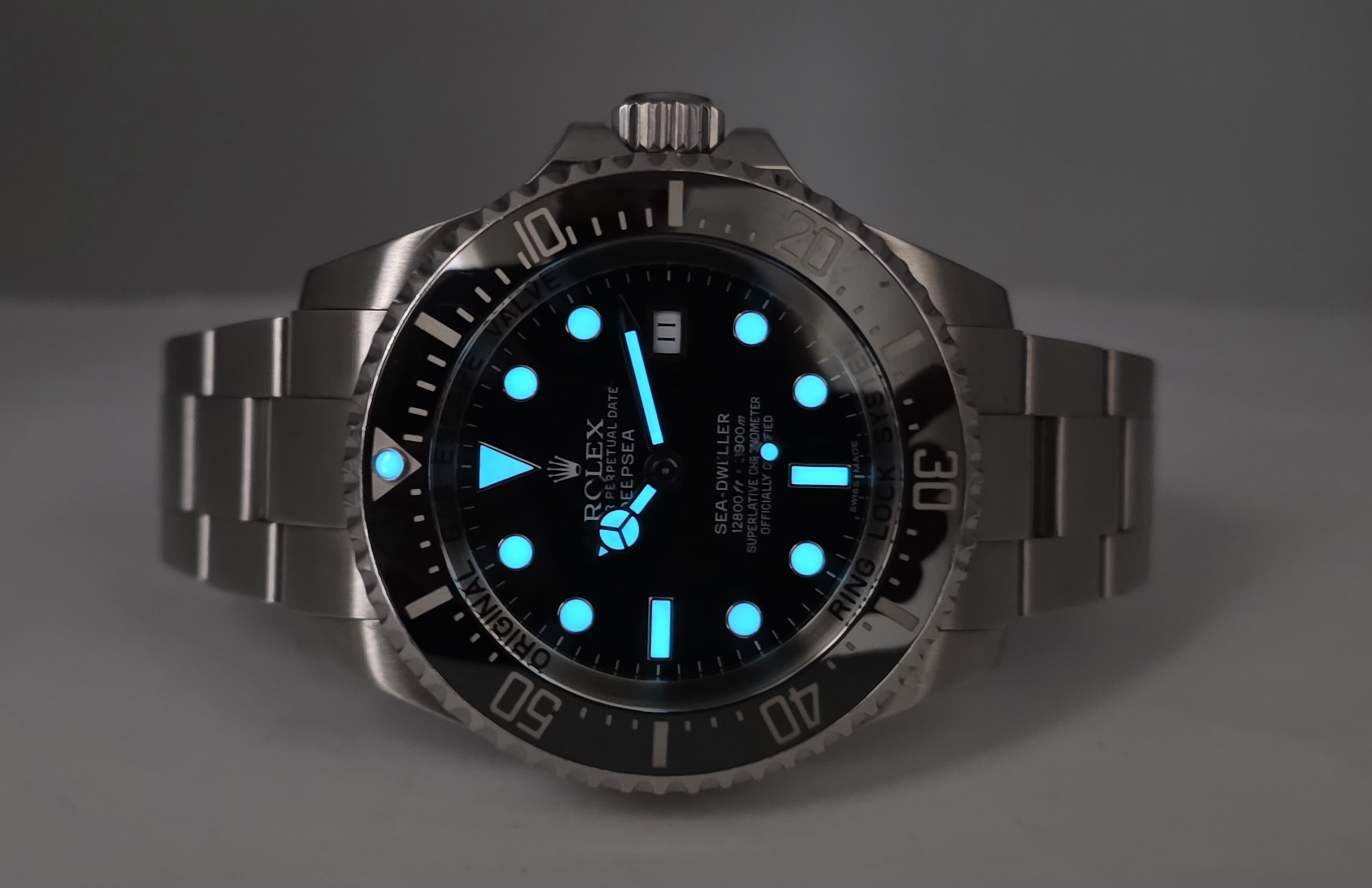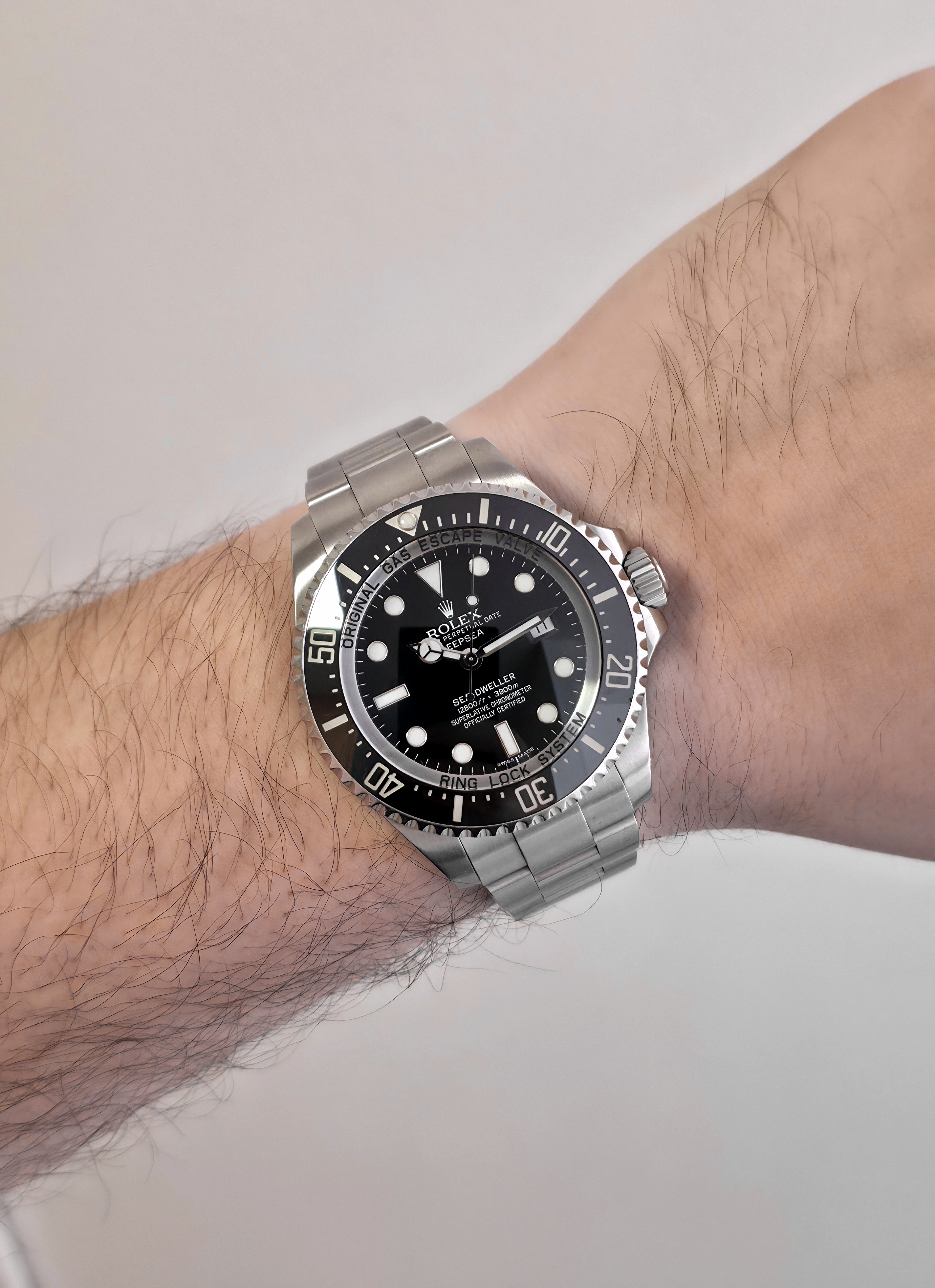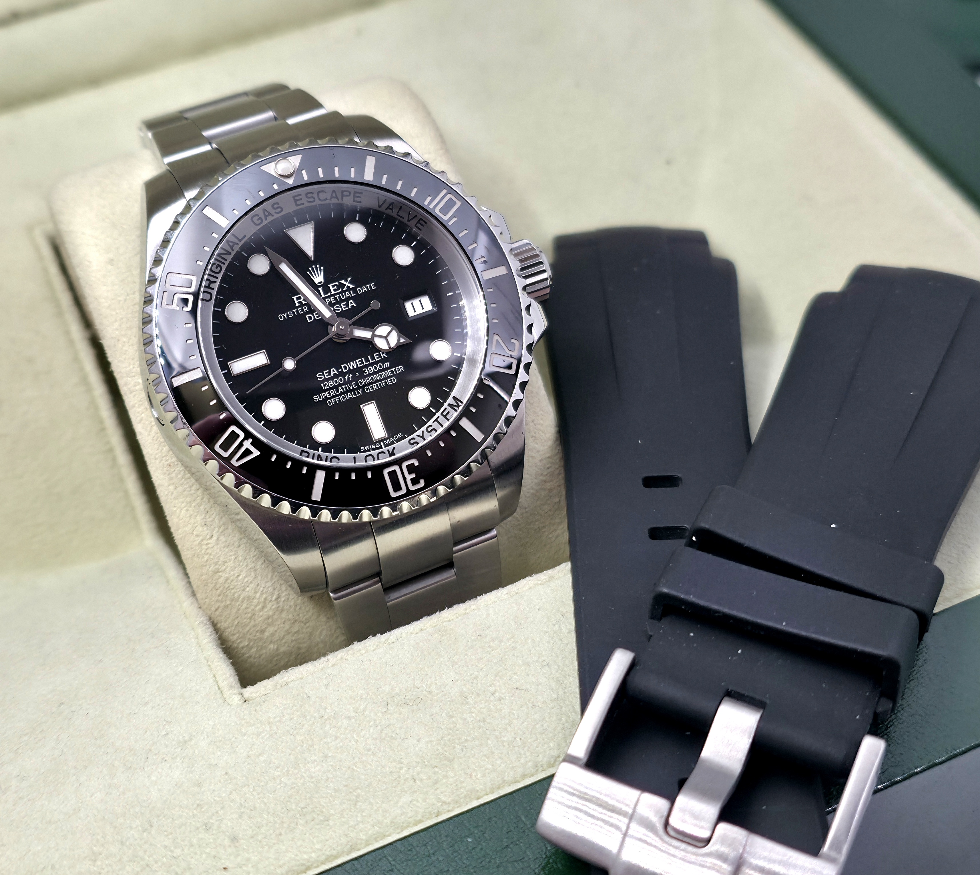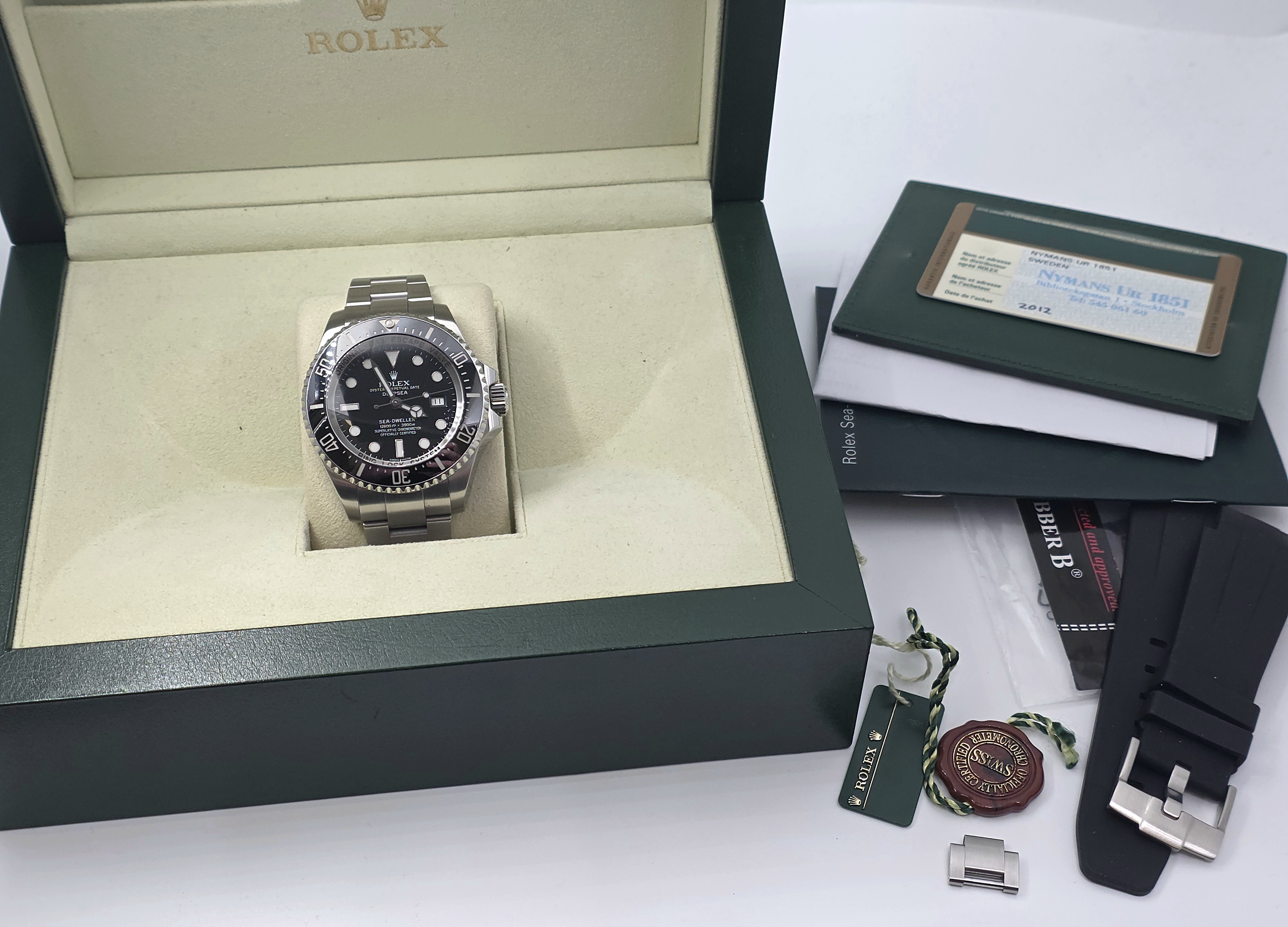 Rolexin järeä huippu diveri 44mm Deepsea! Mukaan boksi, manuaali, 2012 päivätty takuukortti ja RubberB.n malliin suunniteltu kumiranneke. Huollettu 2020. Huippu ominaisuuksilla varustettu diveri, jossa mm. wr. 3900m, upea lume ja erinomainen Glidelock pikasäätö! Siistissä kunnossa ja käynti erinomainen.