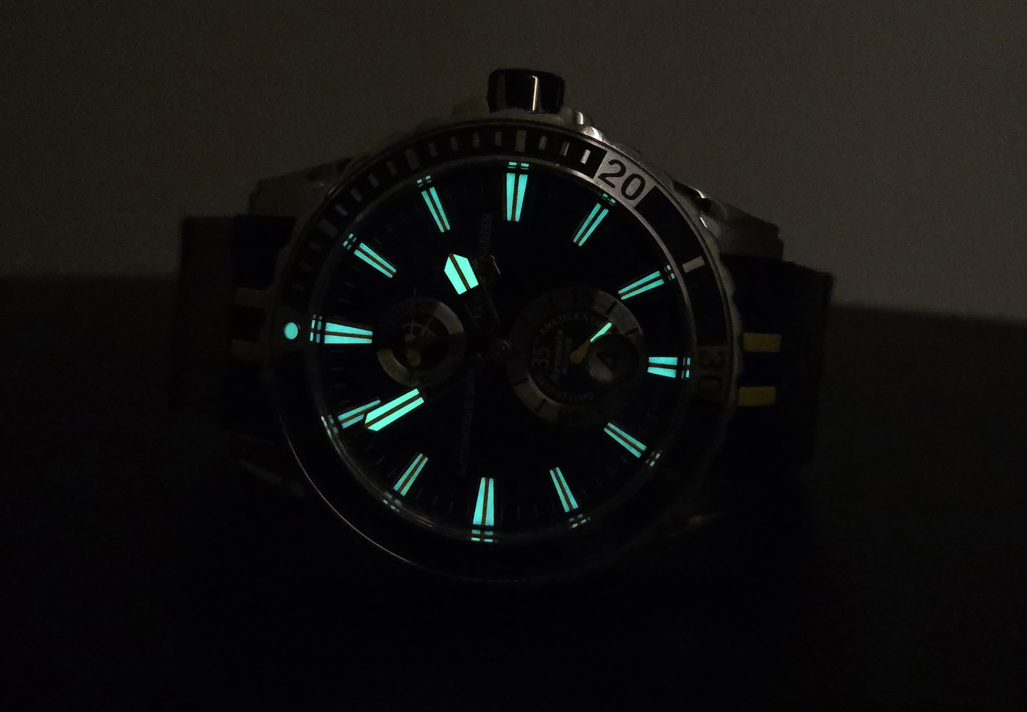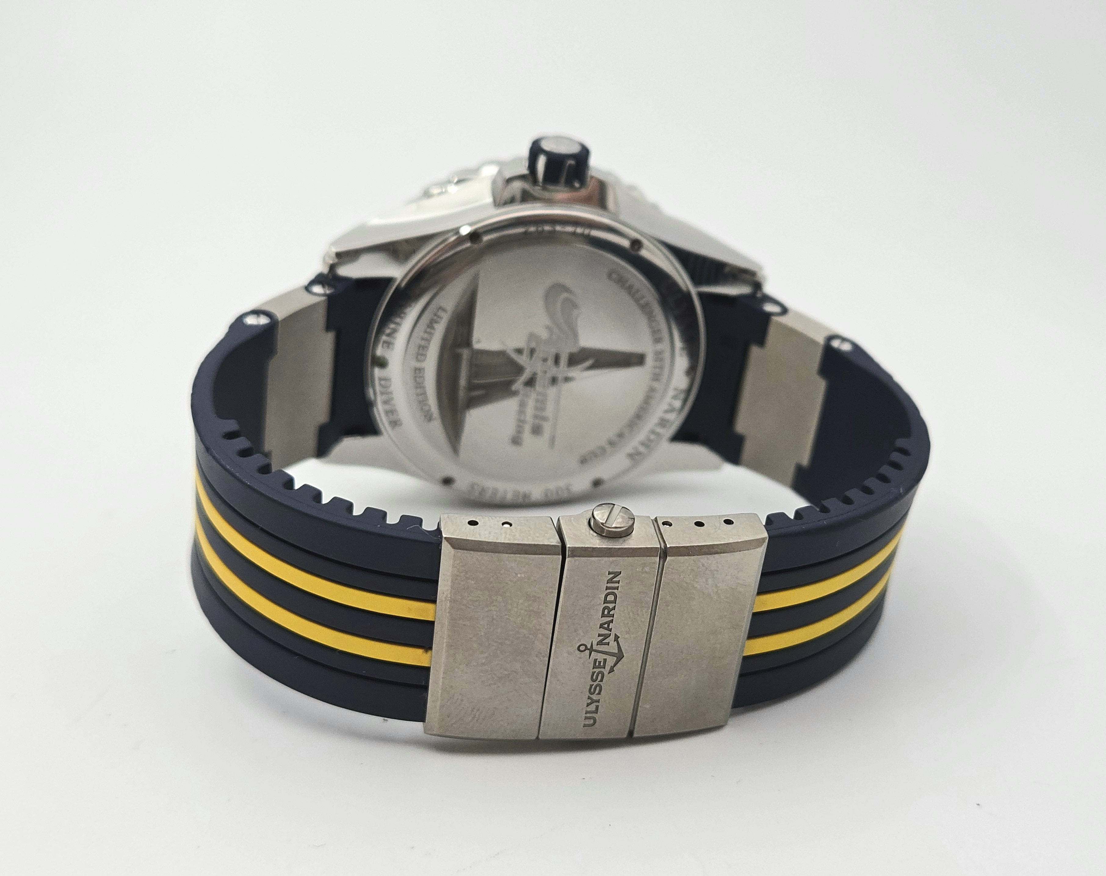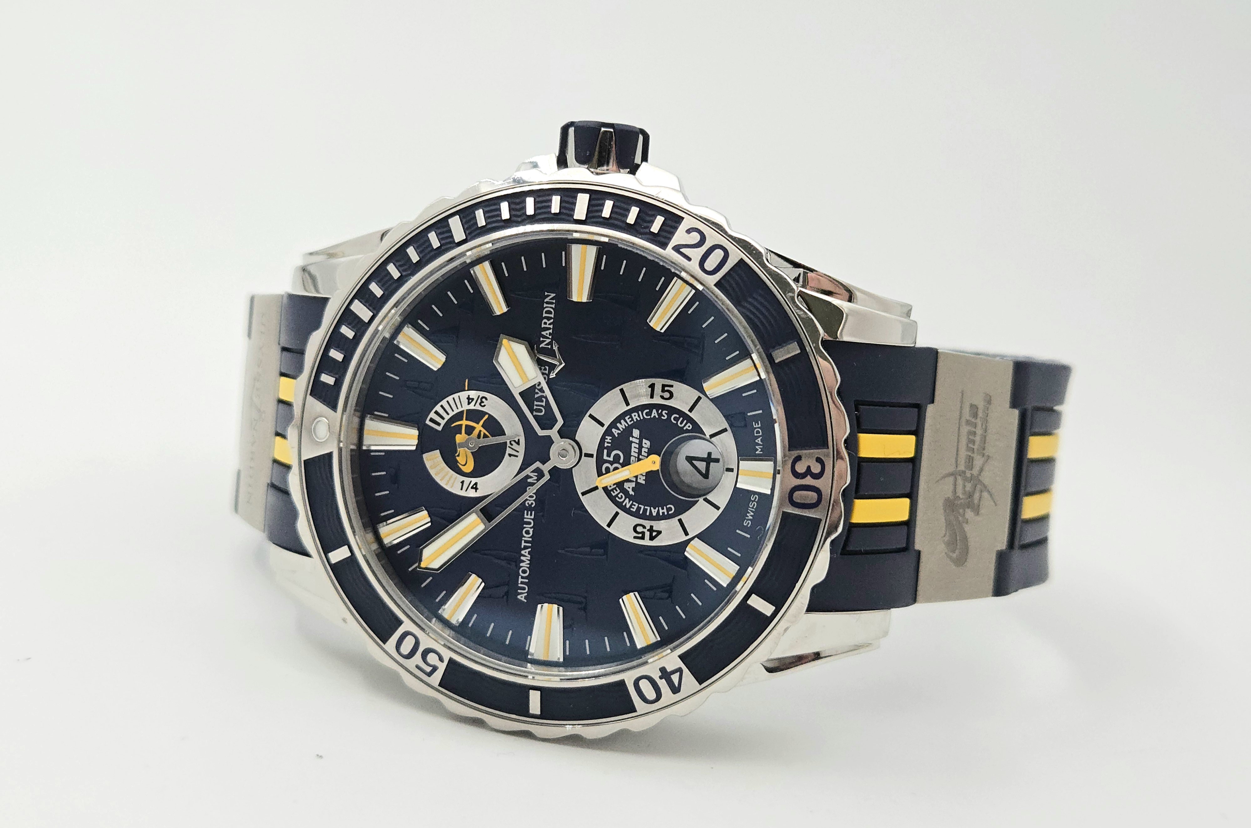 Super hieno ja harvineinen, 250kpl valmistettu Ulysse Nardin Maxi Marine Diver Artemis Racing 44mm. Sporttinen malli upealla, sinisellä taululla. Fullset 02/2017. Käynti erinomianen. Näyttävää diveria täynnä upeita yksityiskohtia hakevalle aivan loistava valinta! Ovh. 9000e